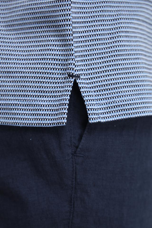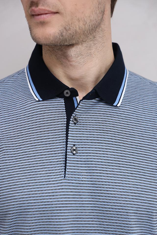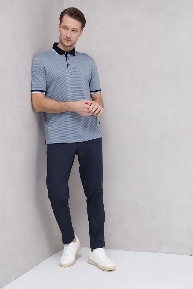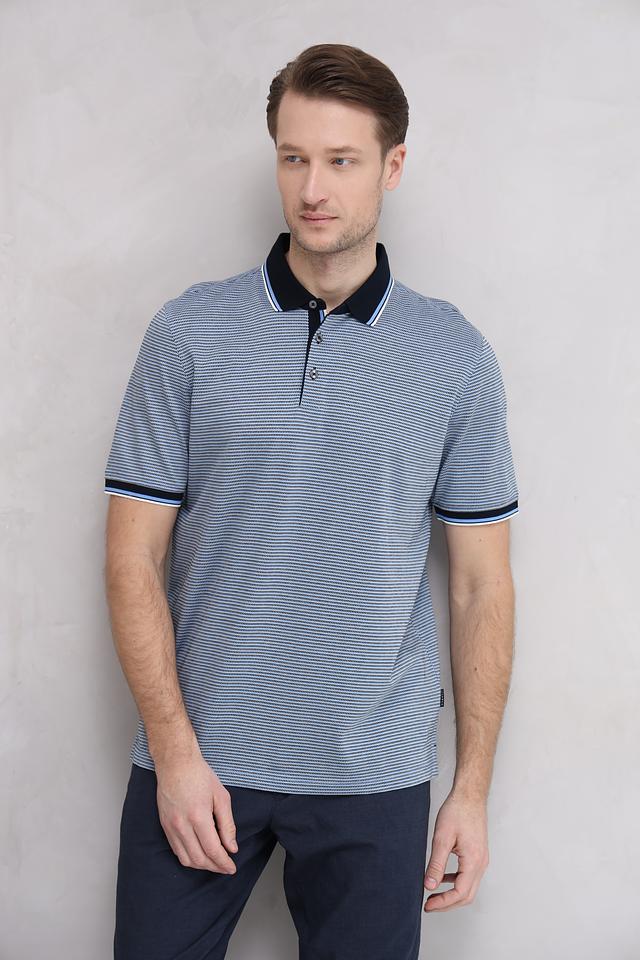 Поло имеет короткий рукав и стандартный крой, обеспечивающий свободу движений. Воротник выполнен из тёмно-синего риба, а манжеты и нижний край – с тонкой синей полосой, что добавляет изделию изысканности.