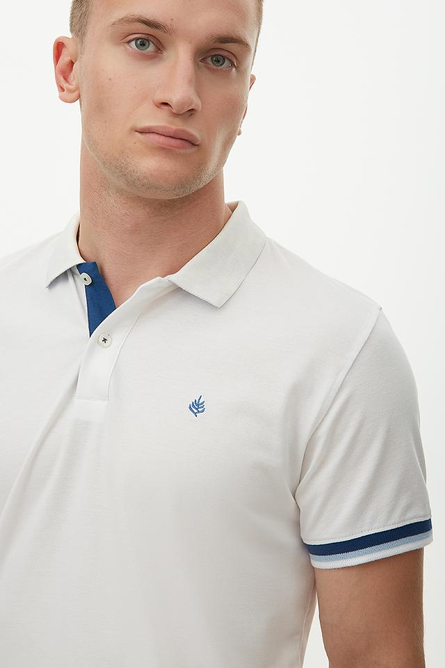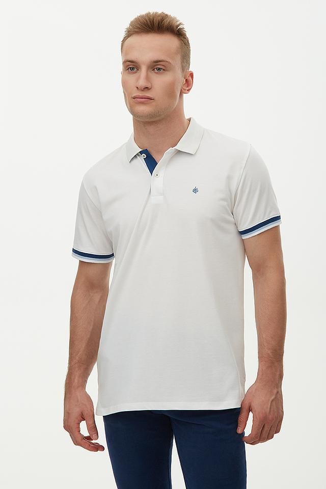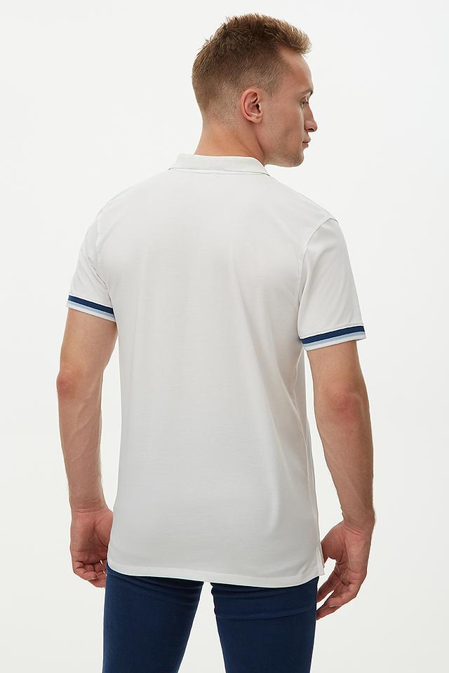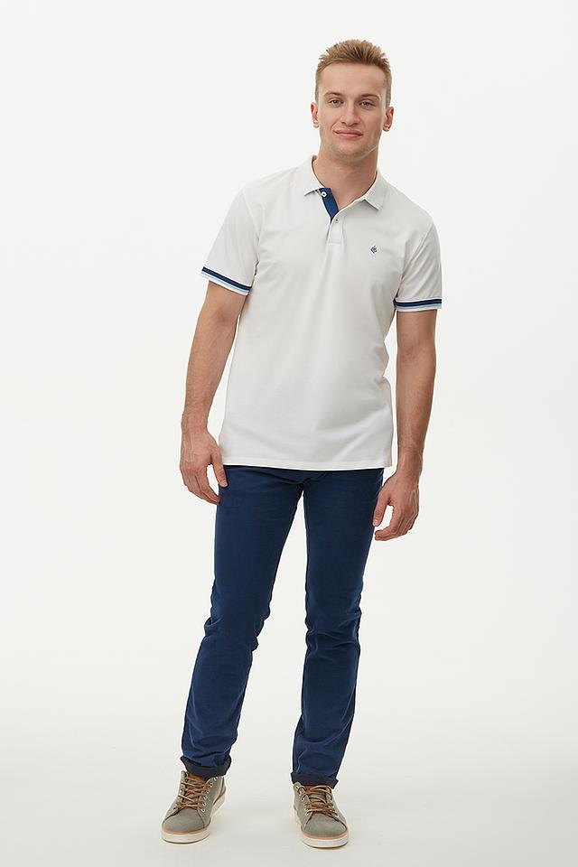 Белое поло John Trigger с синими полосками на воротнике и рукавах – стильное и комфортное решение для повседневного гардероба. Изготовлено из мягкого хлопка с добавлением эластана для удобства носки. Состав: хлопок 95%, эластан 5%