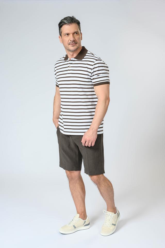 Основной цвет поло – белый, дополненный широкими коричневыми полосами. Такое сочетание делает изделие универсальным и легко сочетаемым с различными элементами гардероба. Воротник и манжеты также выполнены в коричневом цвете, что придает поло завершенный вид.