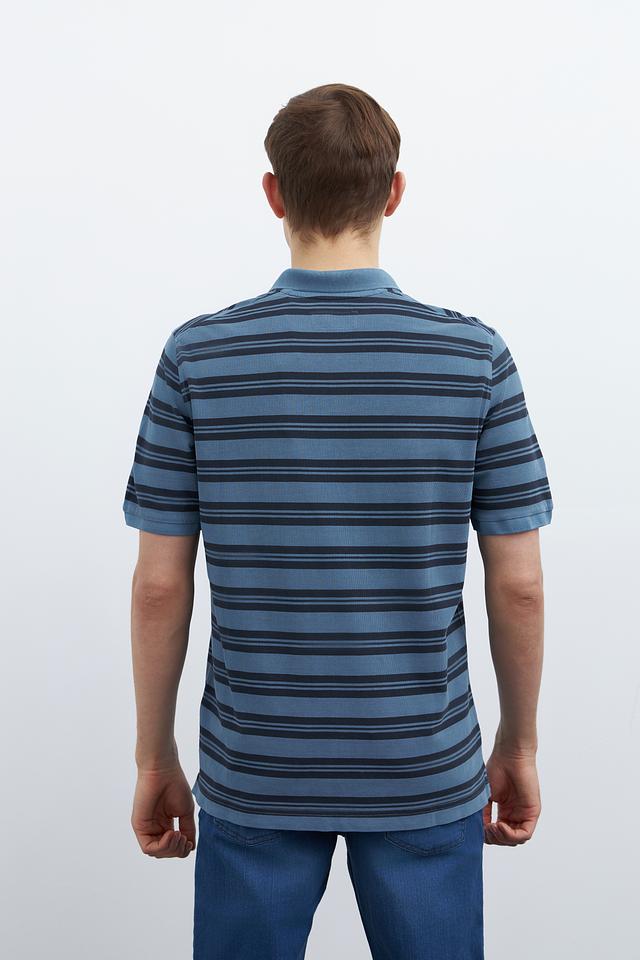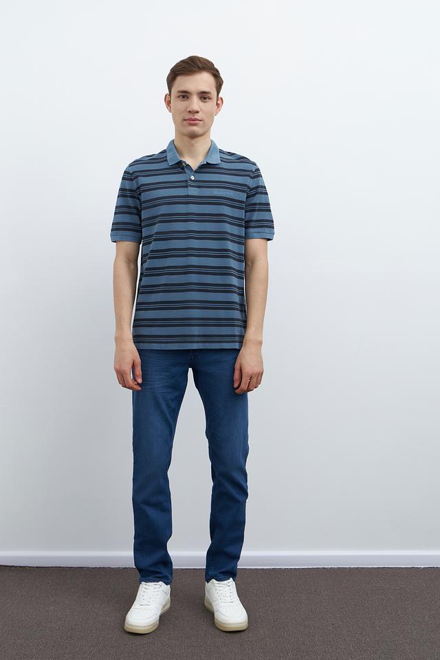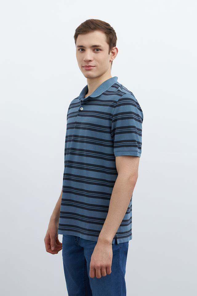 Основной цвет поло – синий, дополненный тонкими полосками тёмно-синего и серого оттенков. Такое сочетание делает изделие универсальным и легко сочетаемым с различными элементами гардероба.