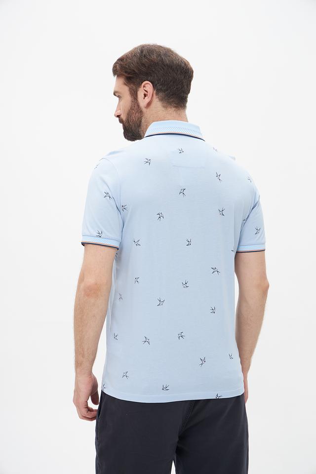 Особенностью данной модели является стильный принт с изображением птиц, который добавляет образу индивидуальность и свежесть. Воротник и рукава поло оформлены контрастной окантовкой, что подчеркивает внимание к деталям.