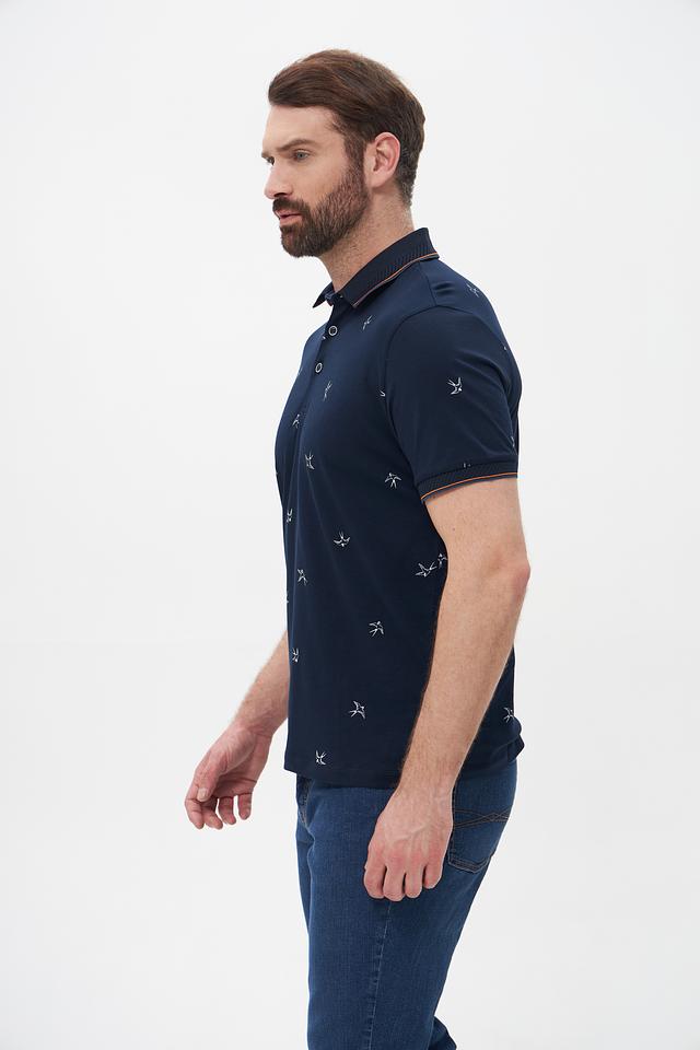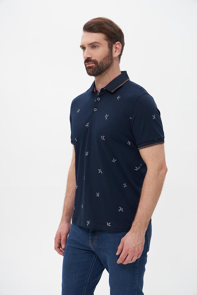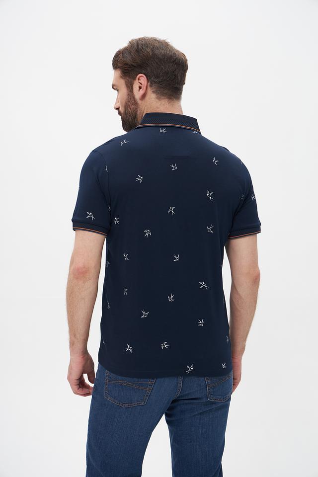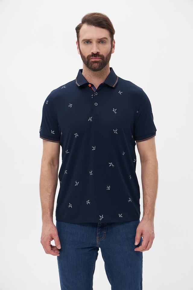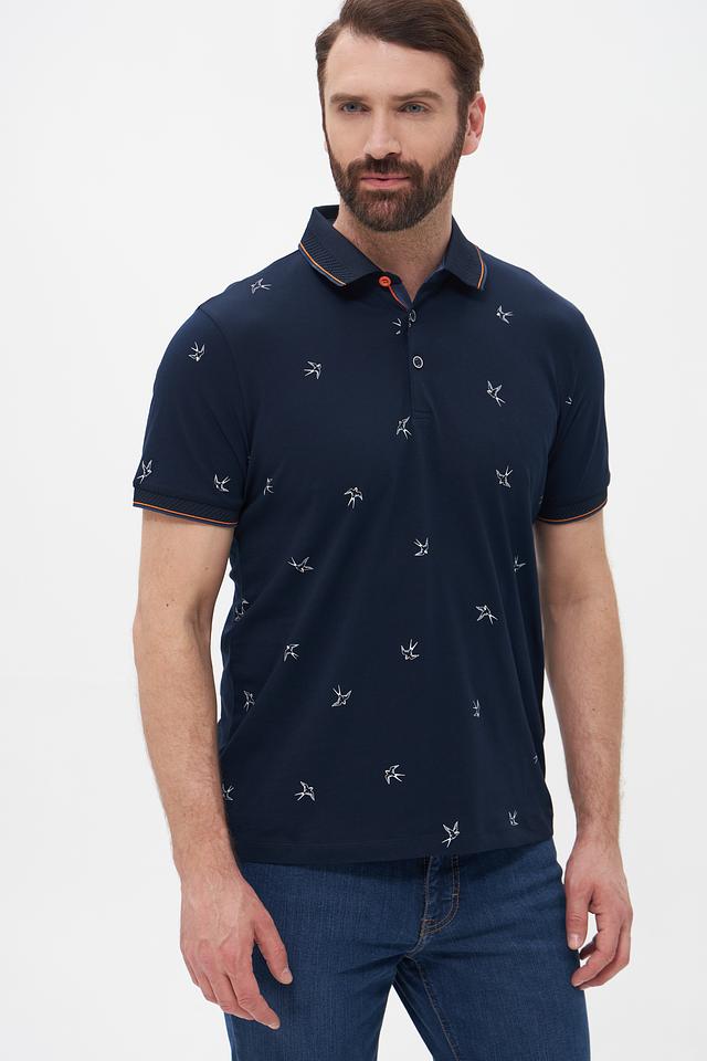 Мужское поло Monte Carlo тёмно-синего цвета с оригинальным принтом в виде птиц. Изготовлено из 100% хлопка, обеспечивающего комфорт и воздухопроницаемость. Стильный и удобный выбор для повседневной носки. Состав: хлопок 100%