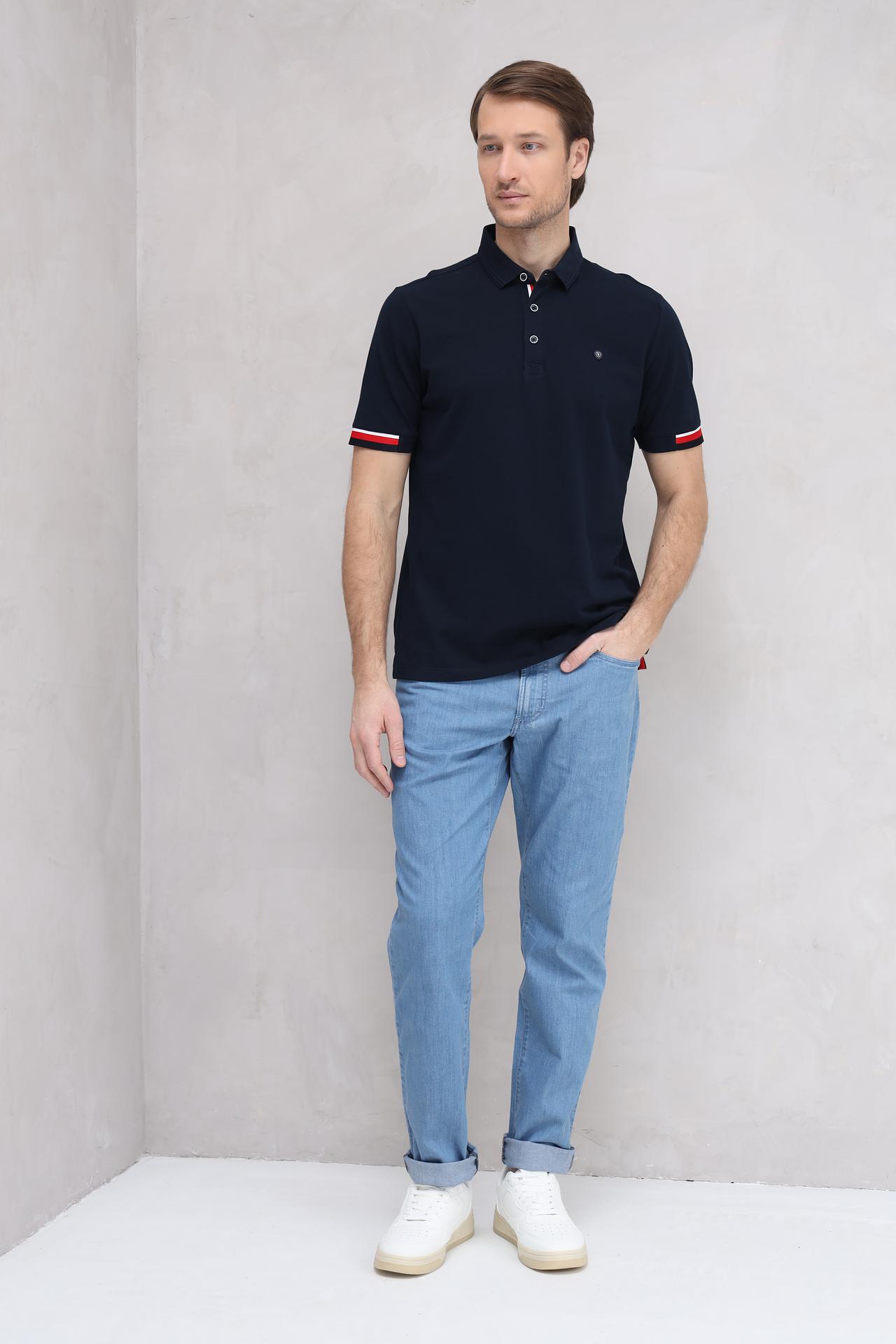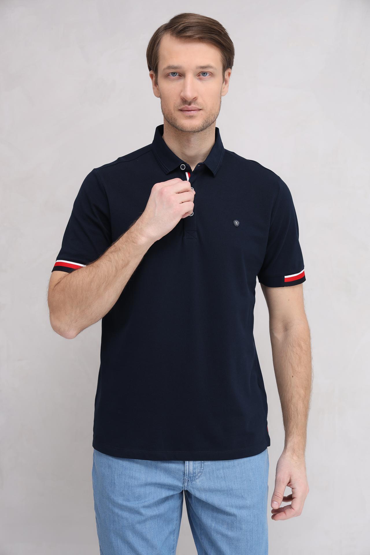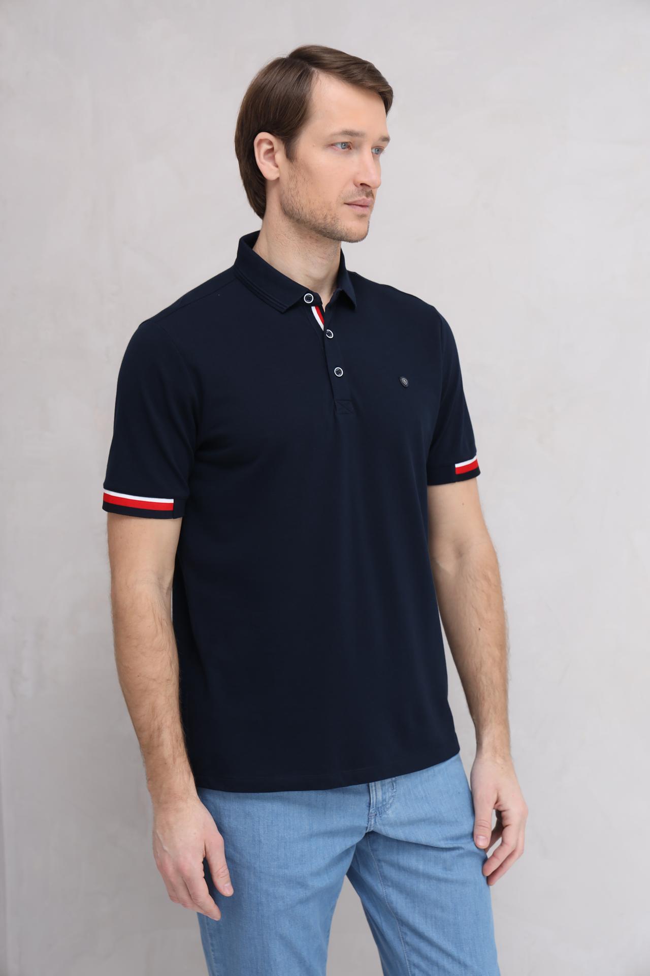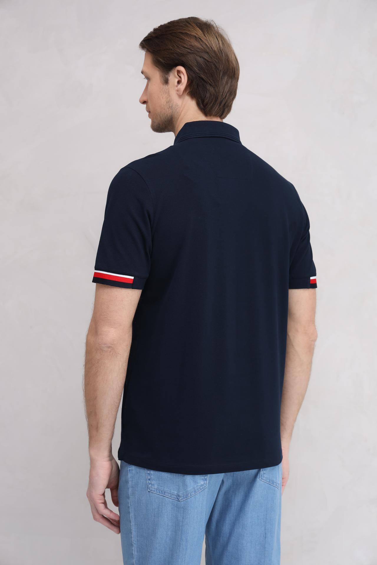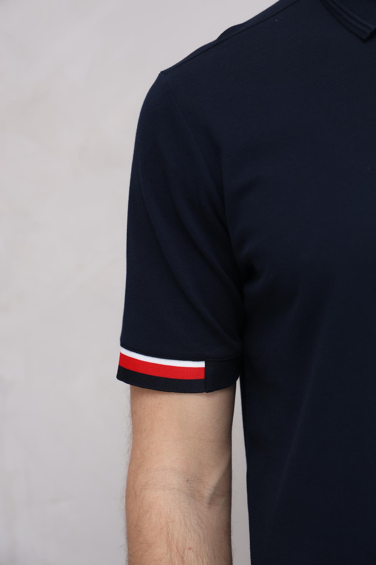 Тёмно-синий цвет поло – универсальный вариант, который подходит к любому стилю одежды. Декоративные полосы красного и белого цвета на манжетах придают модели оригинальность и спортивный шик.
