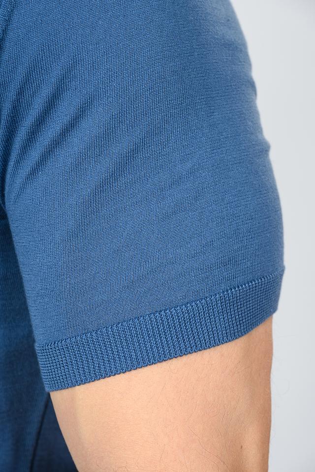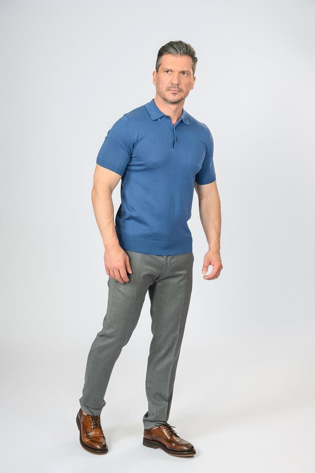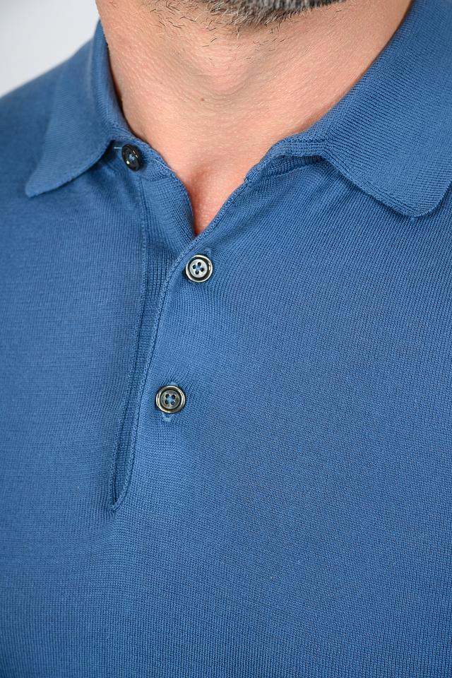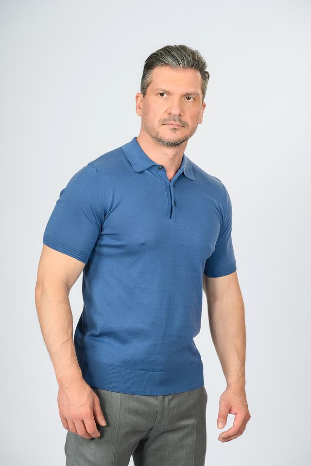 Поло имеет классический крой с короткими рукавами и воротником-поло с тремя пуговицами. Текстура ткани – мелкая вязка, что придает изделию элегантный вид. Данная модель идеально подойдет для повседневной носки, а также для создания более формальных образов в сочетании с брюками или шортами.