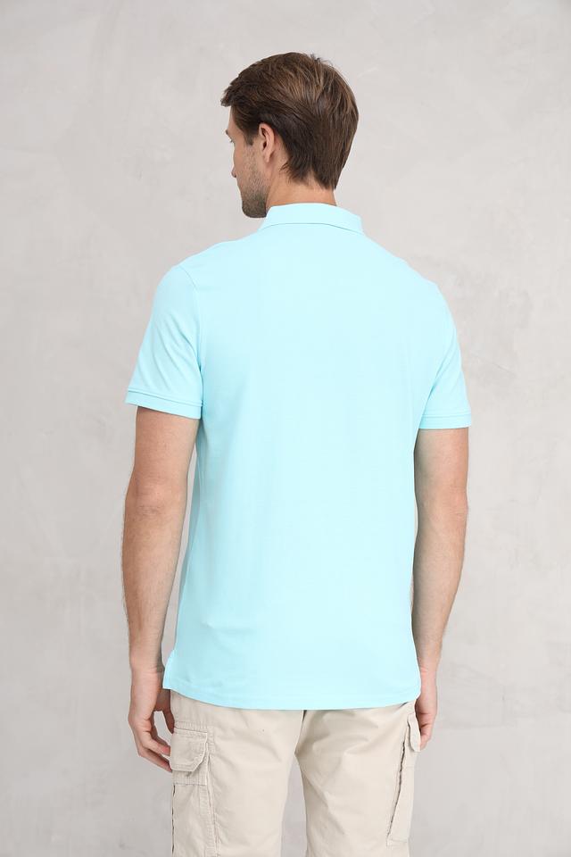 Поло голубого цвета легко сочетается с различными элементами гардероба, от джинсов до шорт. Воротник поло выполнен из эластичной ткани, что обеспечивает удобную посадку. На груди расположена небольшая эмблема бренда.