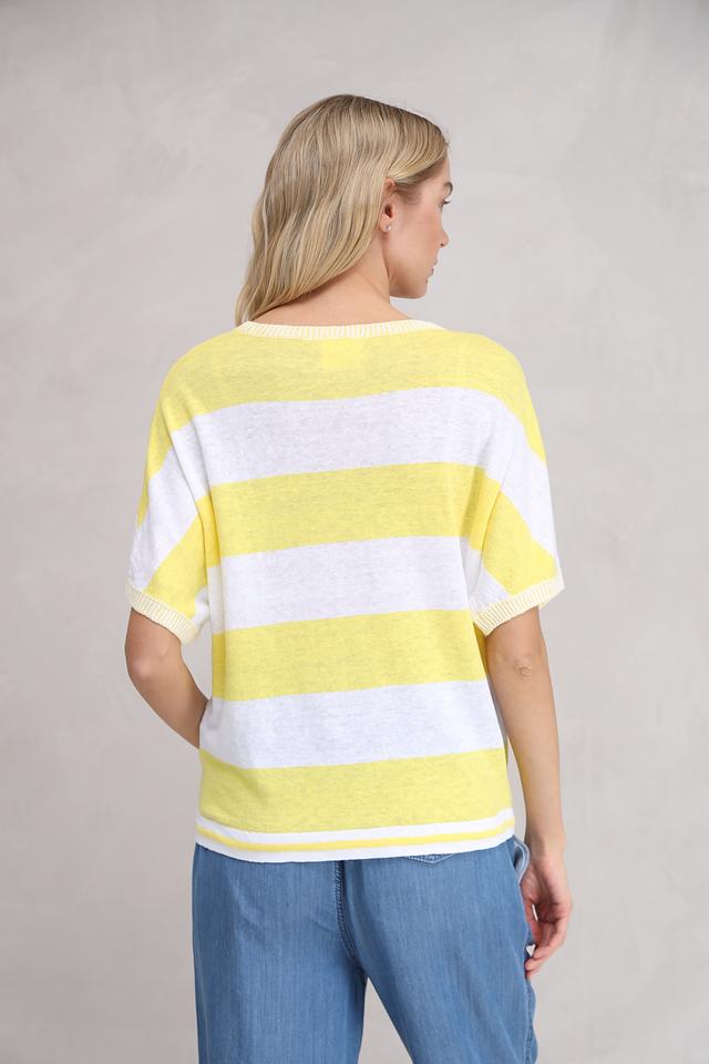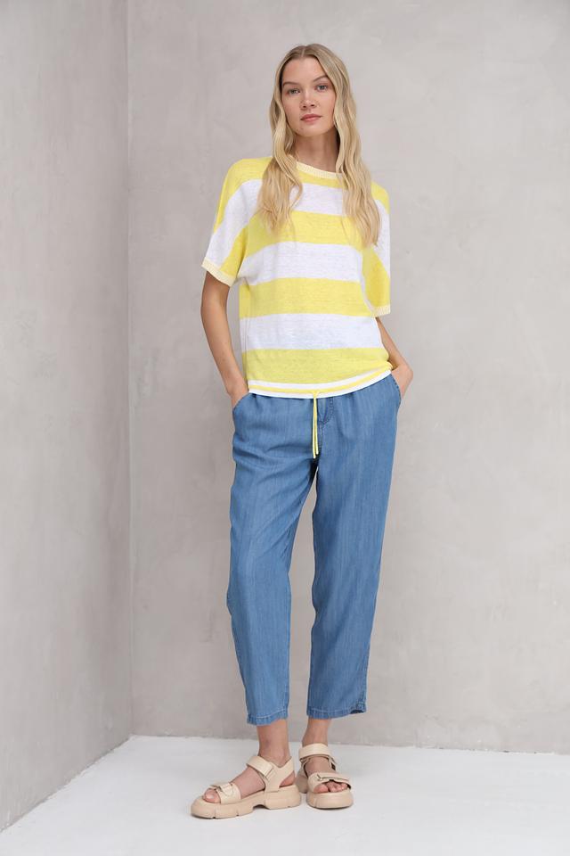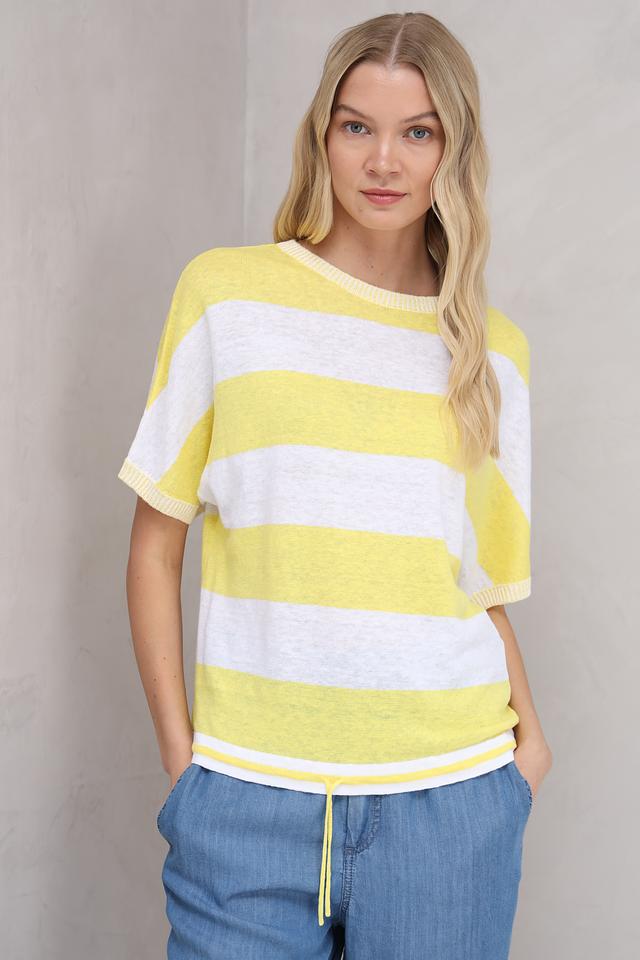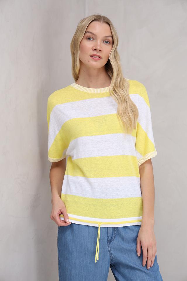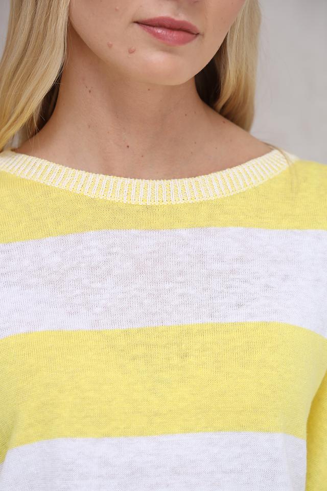 Жёлтый пуловер Oui с короткими рукавами выполнен в горизонтальную полоску. Лёгкий и комфортный, этот пуловер станет отличным дополнением к вашему летнему гардеробу. Изготовлен из 100% льна. Состав: лен 100%