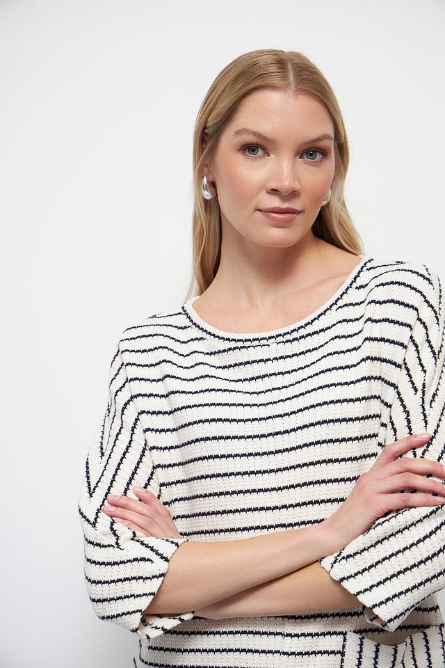 Женский пуловер Oui белого цвета с классической полоской. Модель выполнена из мягкого хлопка с добавлением полиэстера, имеет удобный округлый вырез горловины и рукава 3/4. Состав: хлопок 82%, полиэстер 18%