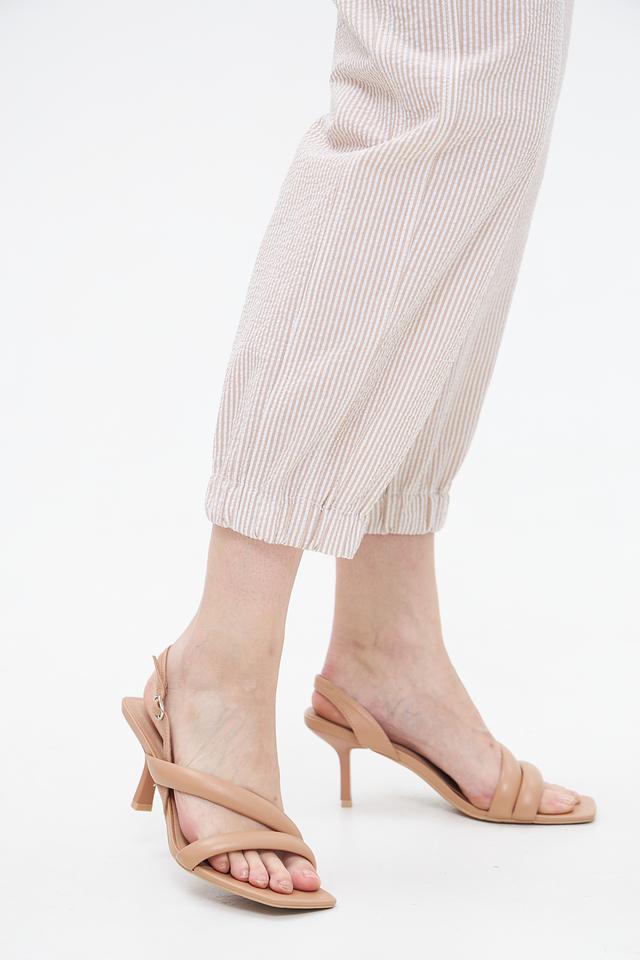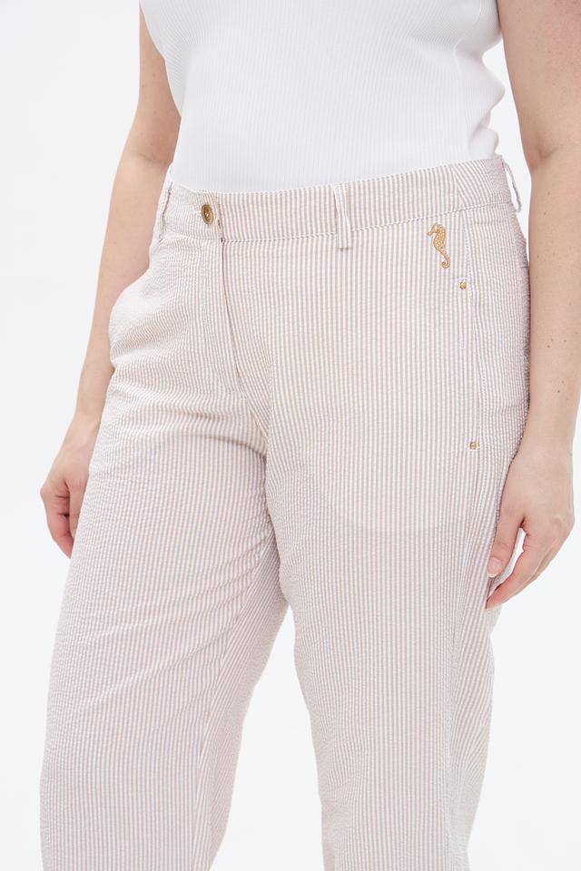 Представляем вашему вниманию стильные брюки от бренда Ppep. Модель выполнена в бежевом цвете с тонкой полоской, что придает ей актуальность и универсальность.