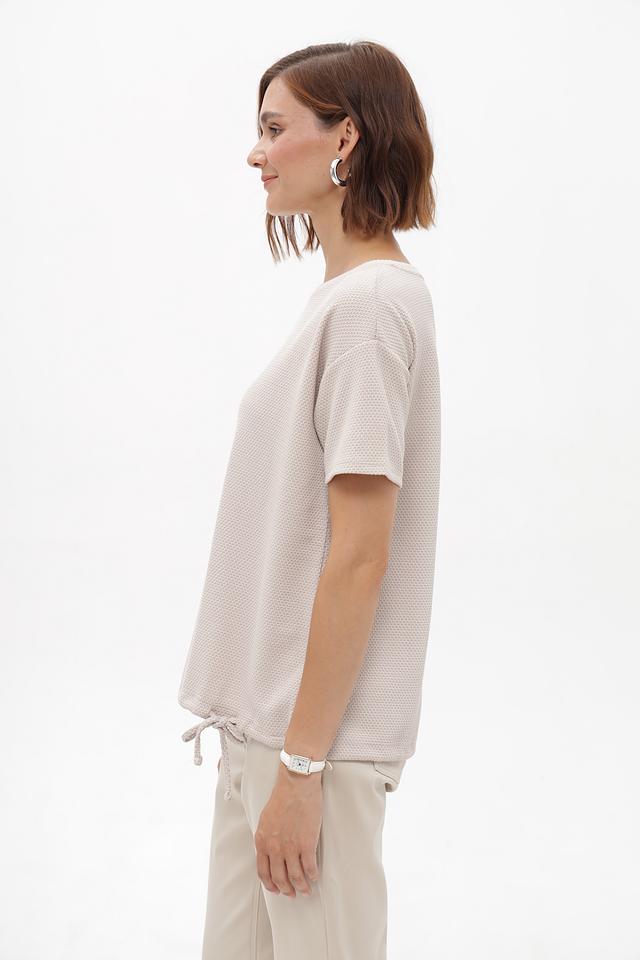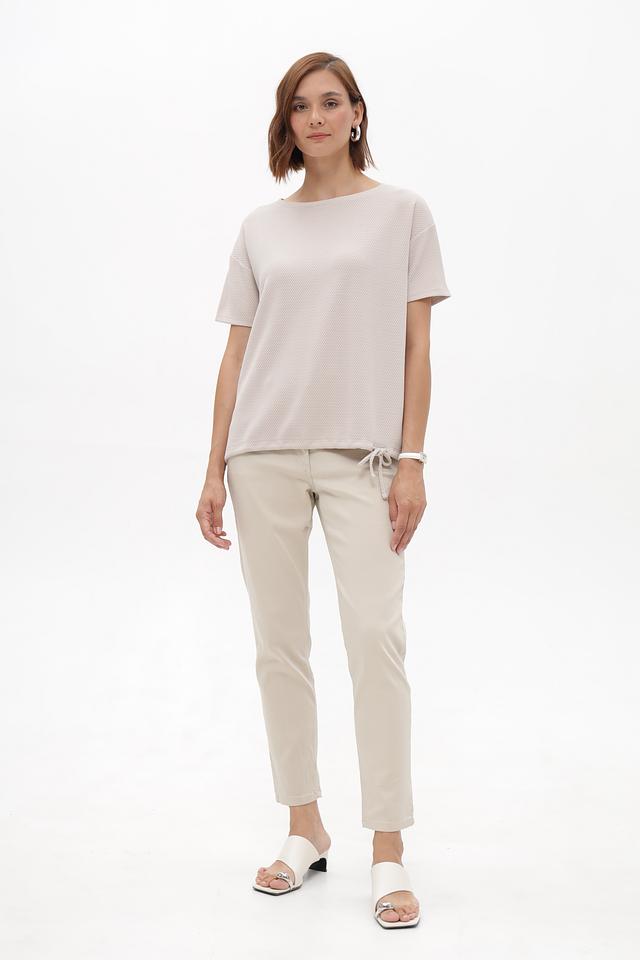 Особенностью данной модели является фактурная поверхность ткани и сборка на завязках по бокам, что позволяет регулировать силуэт и создавать более женственный образ. Пуловер прекрасно сочетается с брюками, юбками и джинсами, создавая стильный и непринужденный образ.