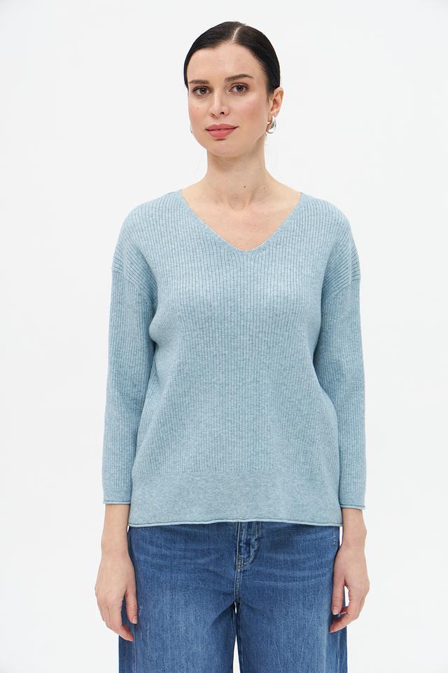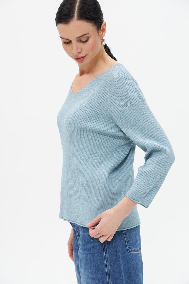 Пуловер имеет классический V-образный вырез, который подчеркивает линию шеи и декольте. Свободный крой обеспечивает комфорт и свободу движений, а рукава три четверти делают его подходящим для любого времени года.