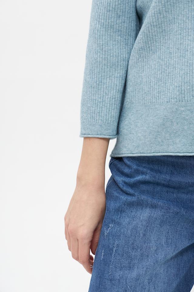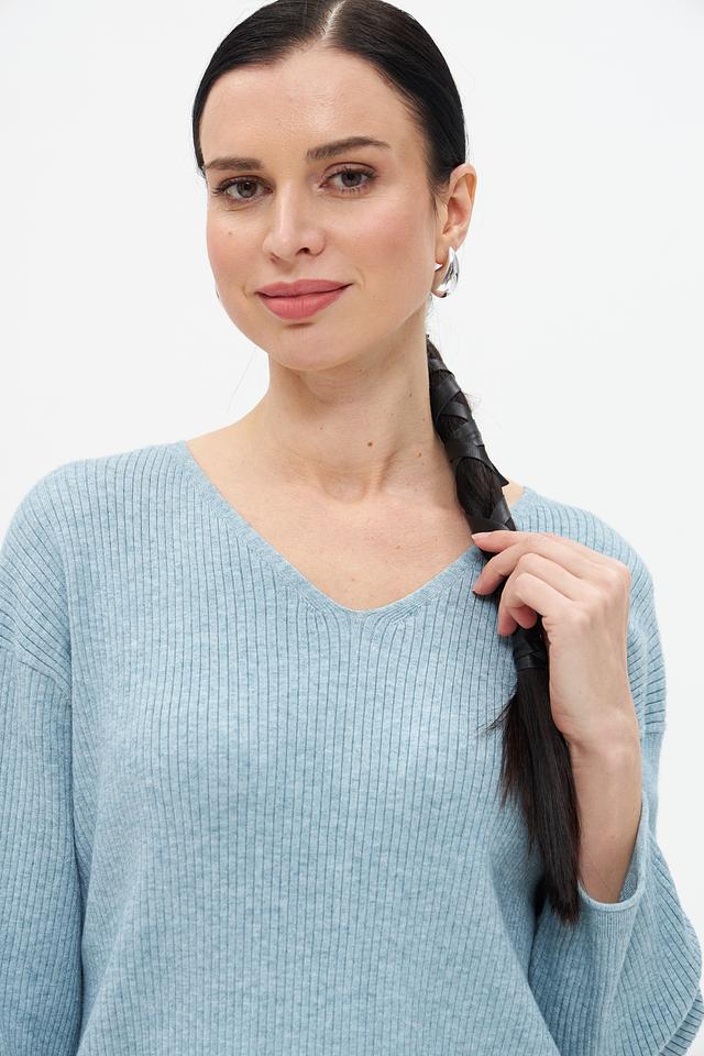 Текстура изделия – мелкий рубчик, который придает ему изысканность и визуальную привлекательность. Голубой цвет пуловера универсален и легко сочетается с различными элементами одежды, позволяя создавать разнообразные стильные образы.