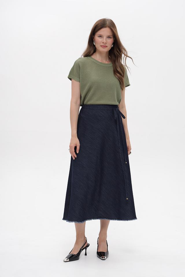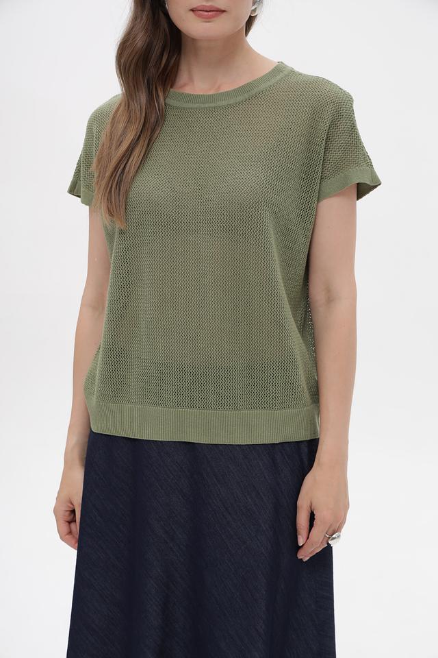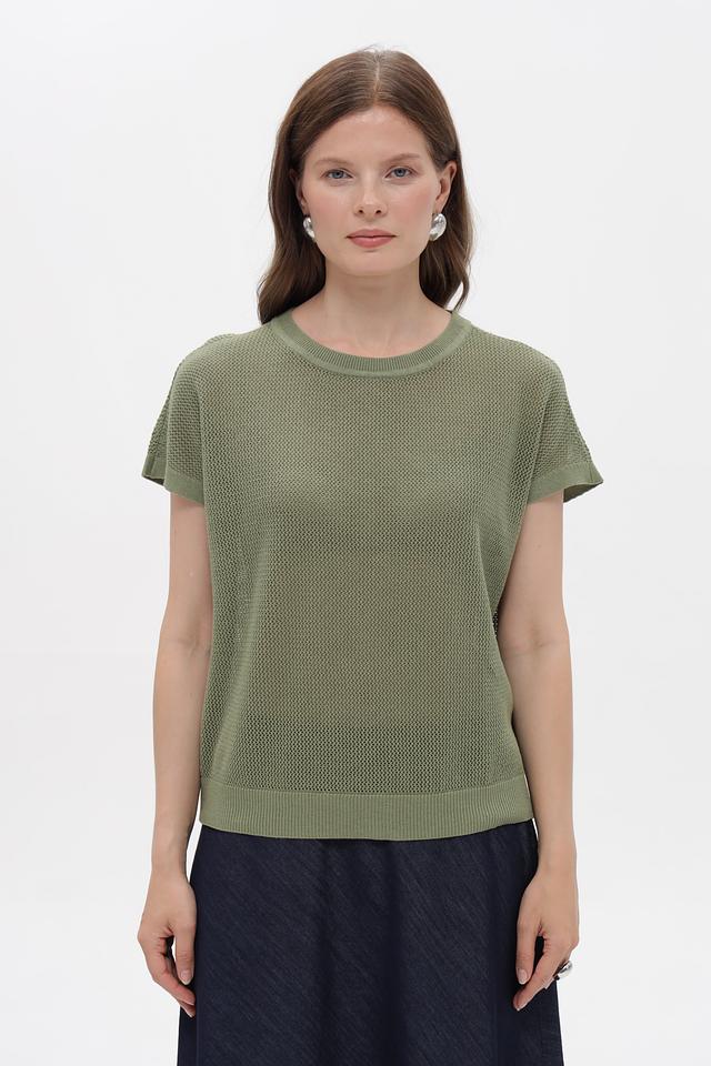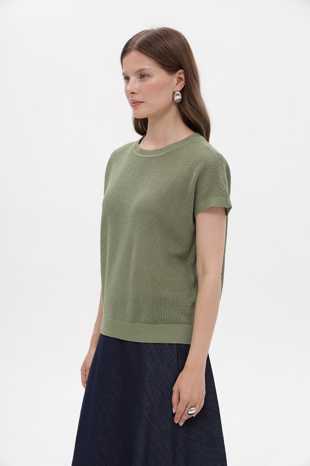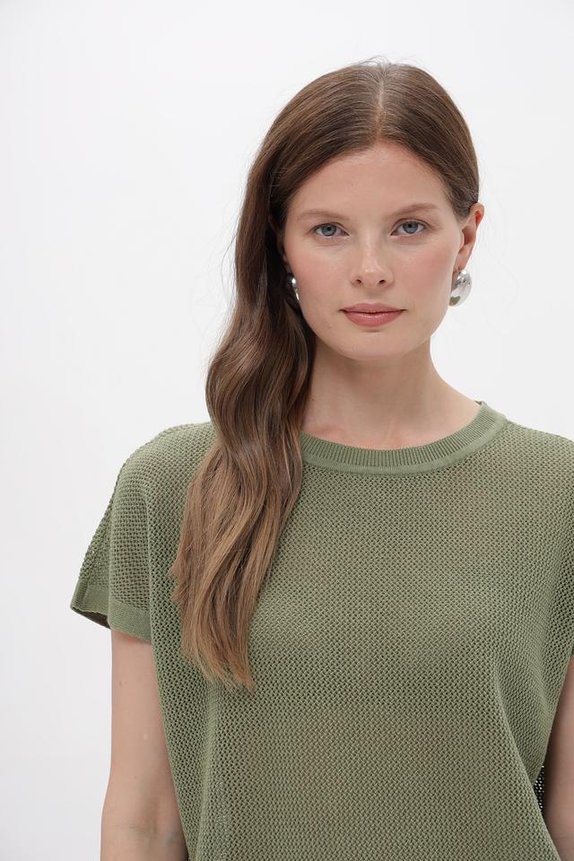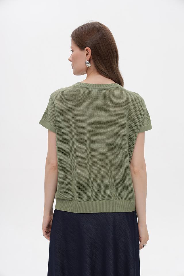 Пуловер имеет короткий рукав и круглый вырез горловины. Особую изюминку изделию придает фактурная вязаная текстура, которая делает его визуально интересным. Прямой, слегка свободный крой не сковывает движений и подходит для разных типов фигуры.