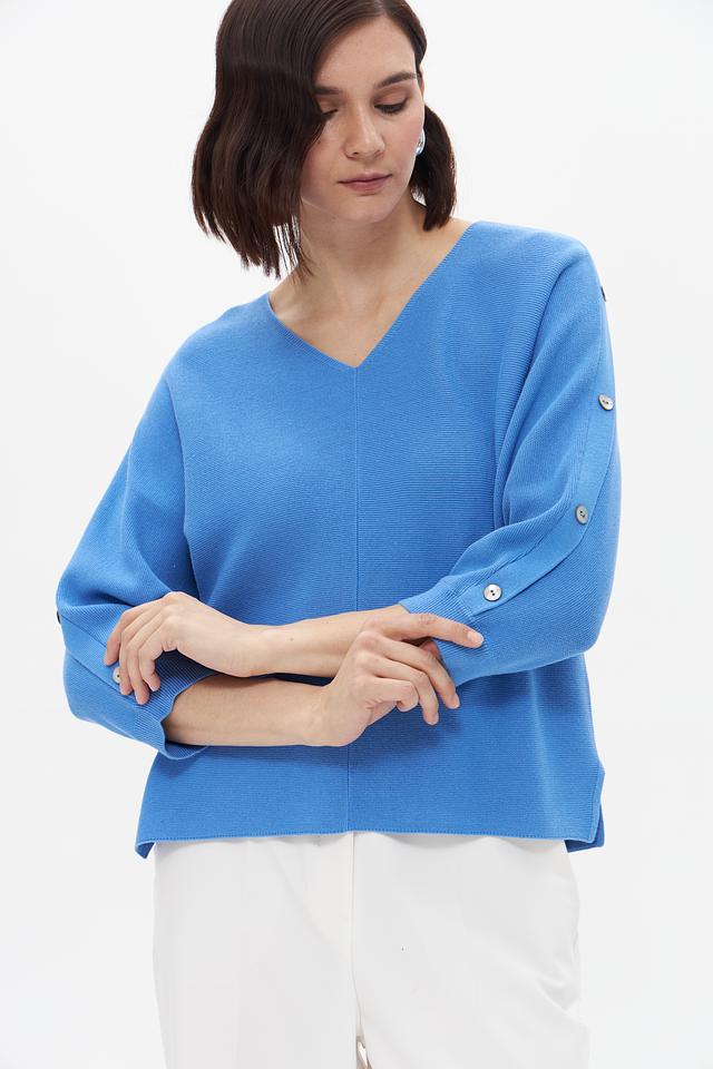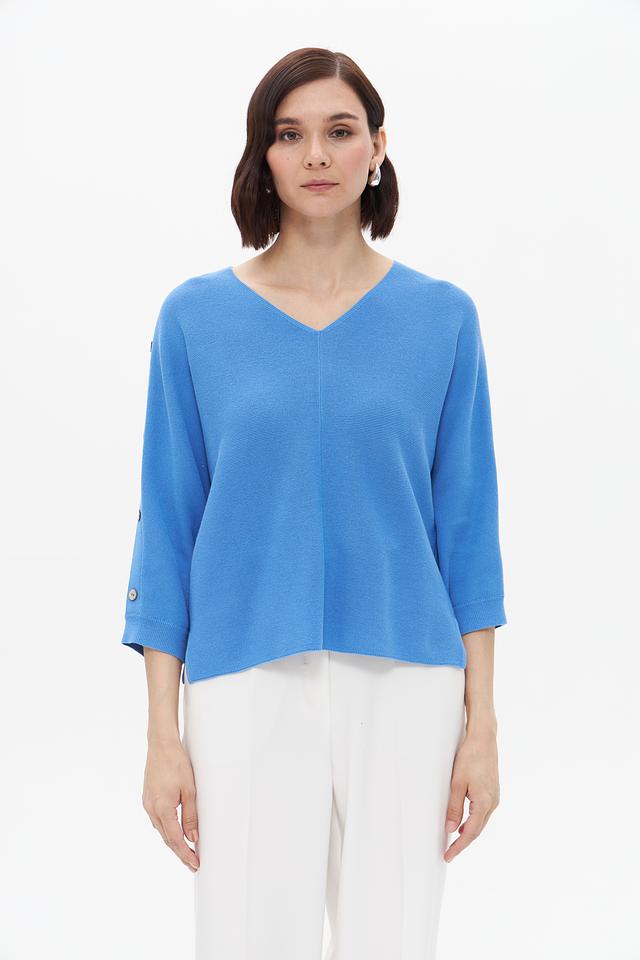 Женский пуловер Bianca голубого цвета с рукавами 3/4 и декоративными пуговицами. Изготовлен из мягкого сочетания полиакрила и хлопка, обеспечивающего комфорт и удобство в носке. Состав: полиакрил 55%, хлопок 45%