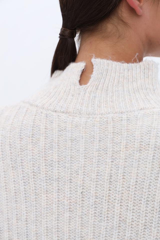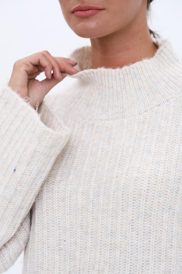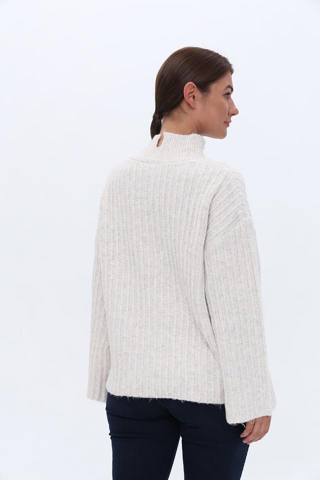 Пуловер имеет свободный крой, который обеспечивает комфорт в носке, а рукава-колокола добавляют образу женственности и оригинальности. Воротник-стойка подчеркивает линию шеи и делает модель более интересной.