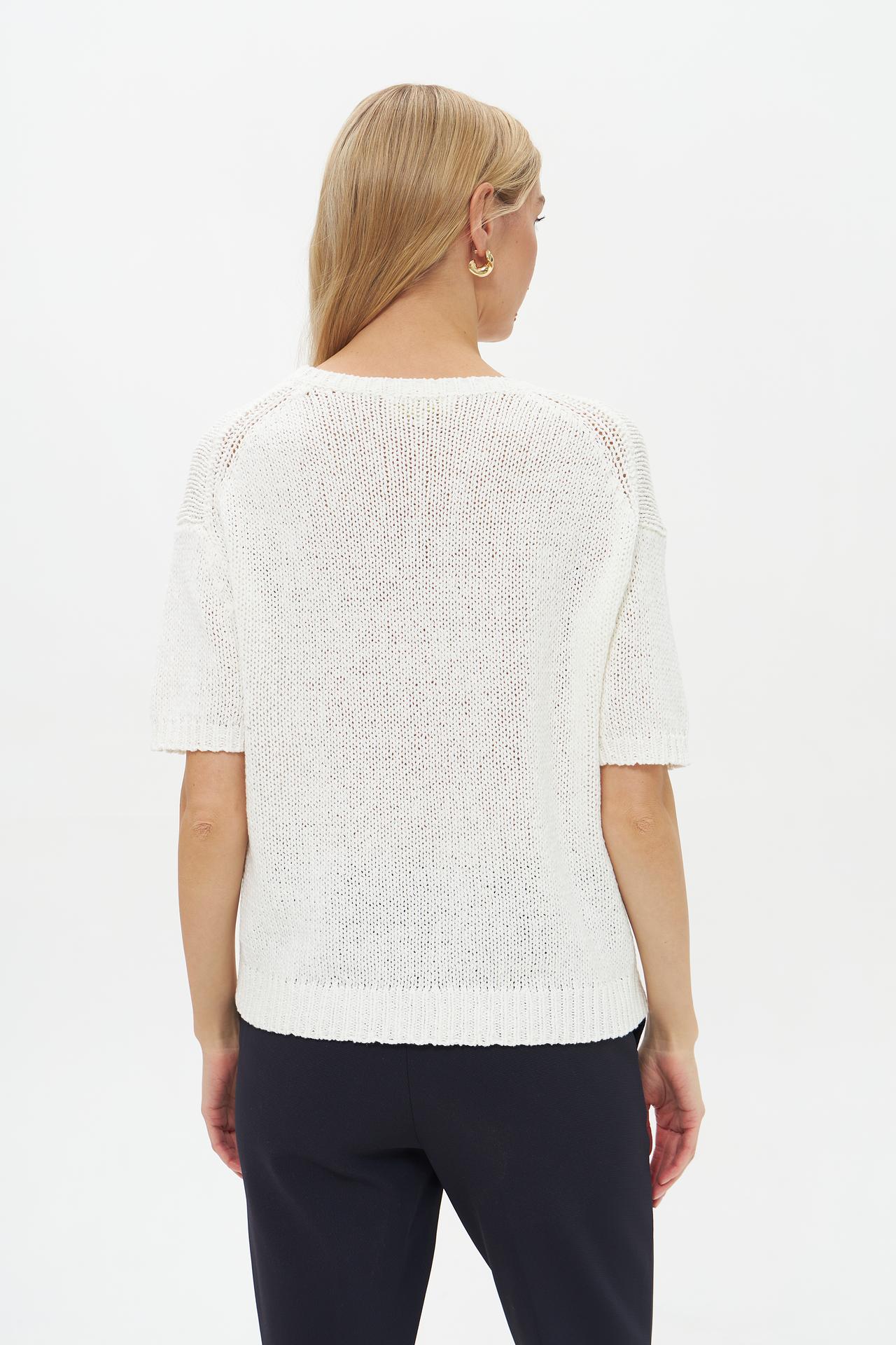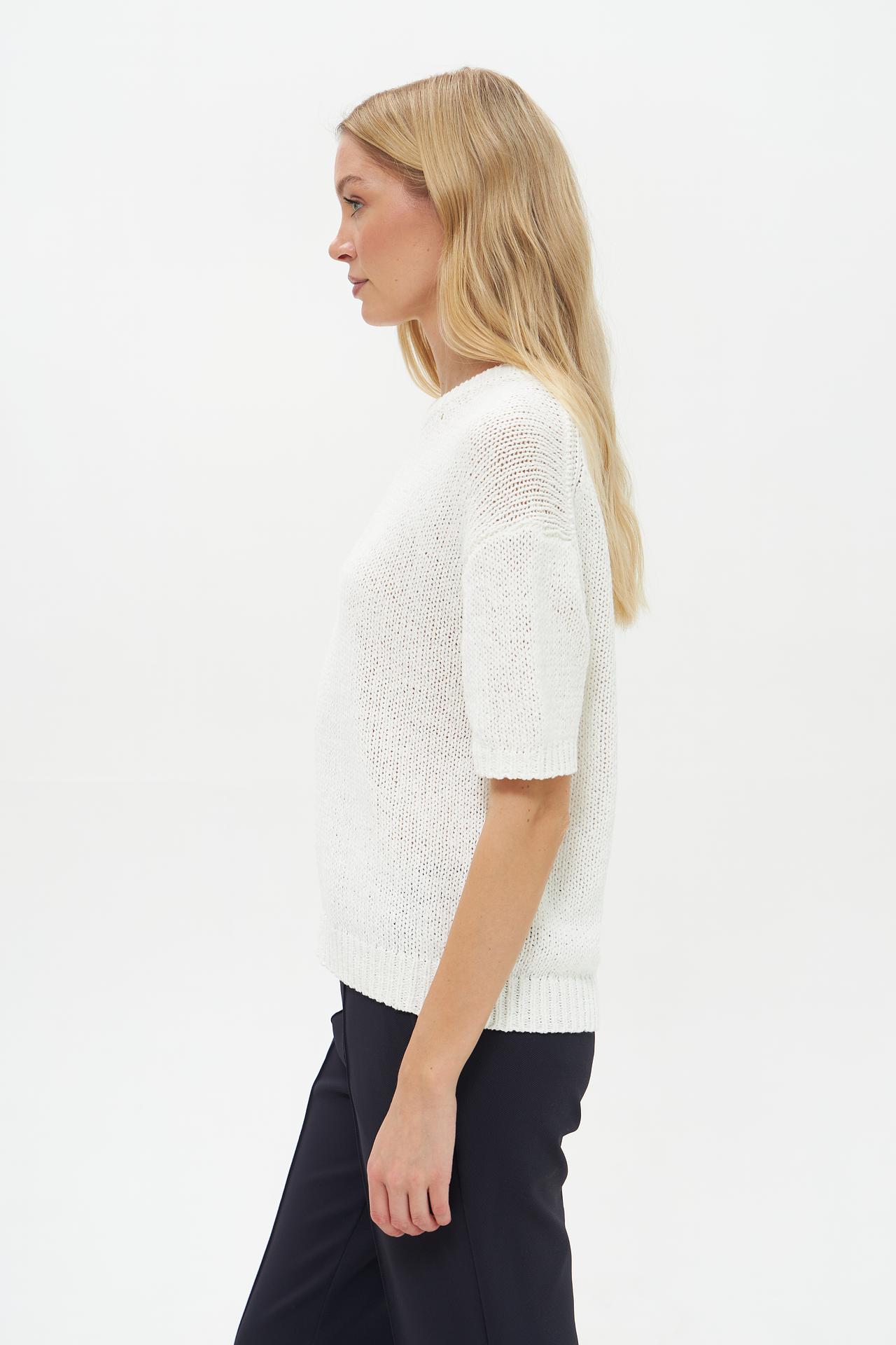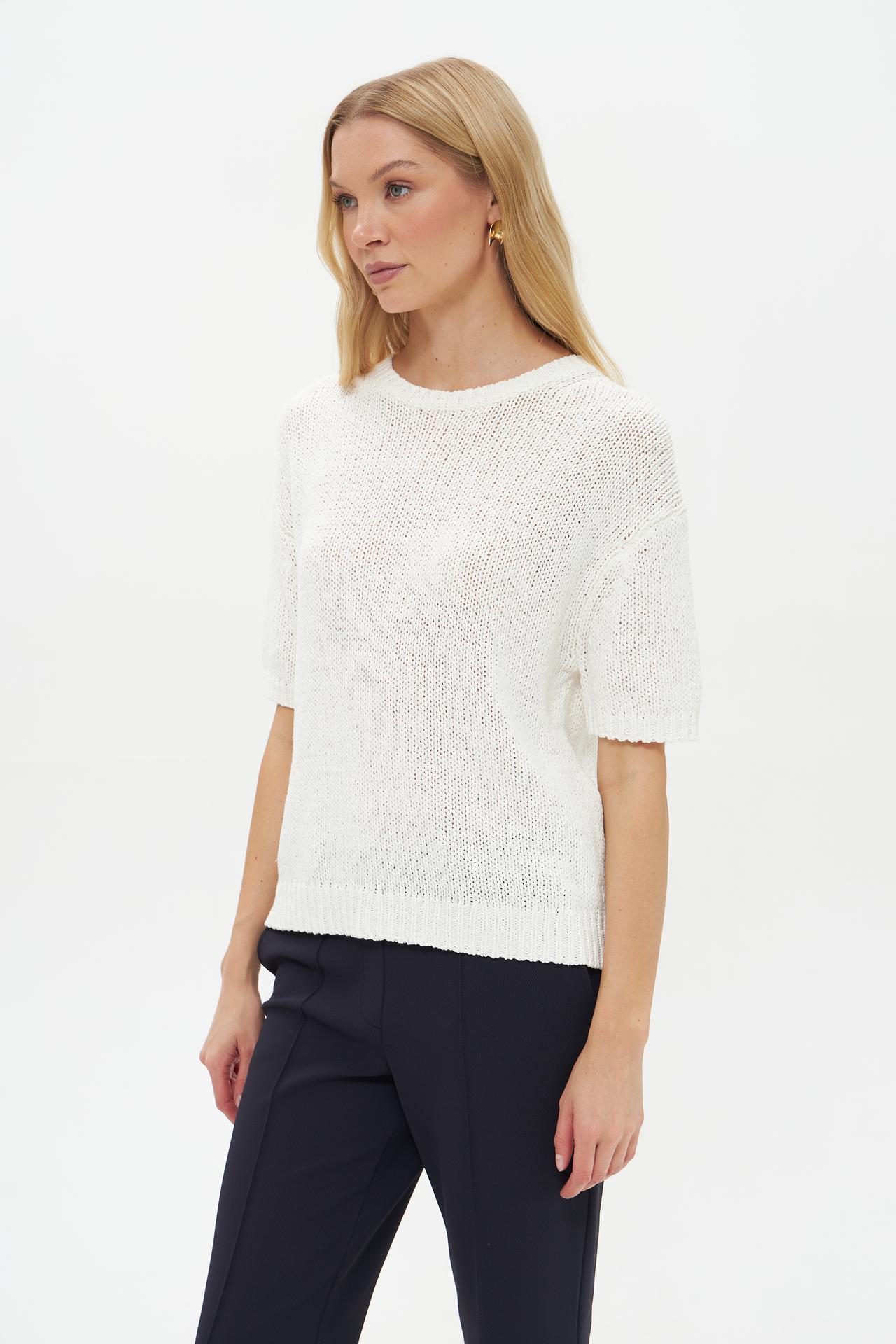 Легкий летний пуловер с ажурной вязкой. Пуловер свободного кроя с короткими рукавами – это универсальный элемент гардероба, который легко сочетается с различными стилями. Сочетайте его с джинсами для создания непринужденного образа или с юбкой для более элегантного вида. Такой женственный вязаный пуловер станет отличным дополнением к вашему гардеробу.