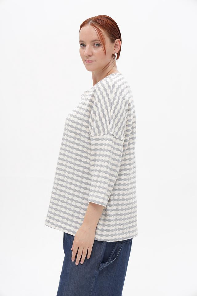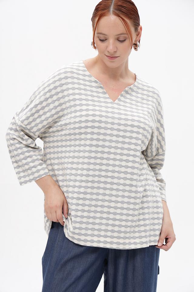 Модель имеет свободный крой, который обеспечивает комфорт в носке, а V-образный вырез горловины подчеркивает женственность силуэта. Рукава длиной 3/4 делают этот пуловер универсальным для любого времени года.