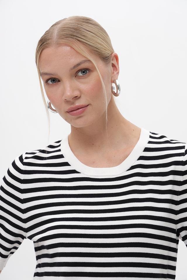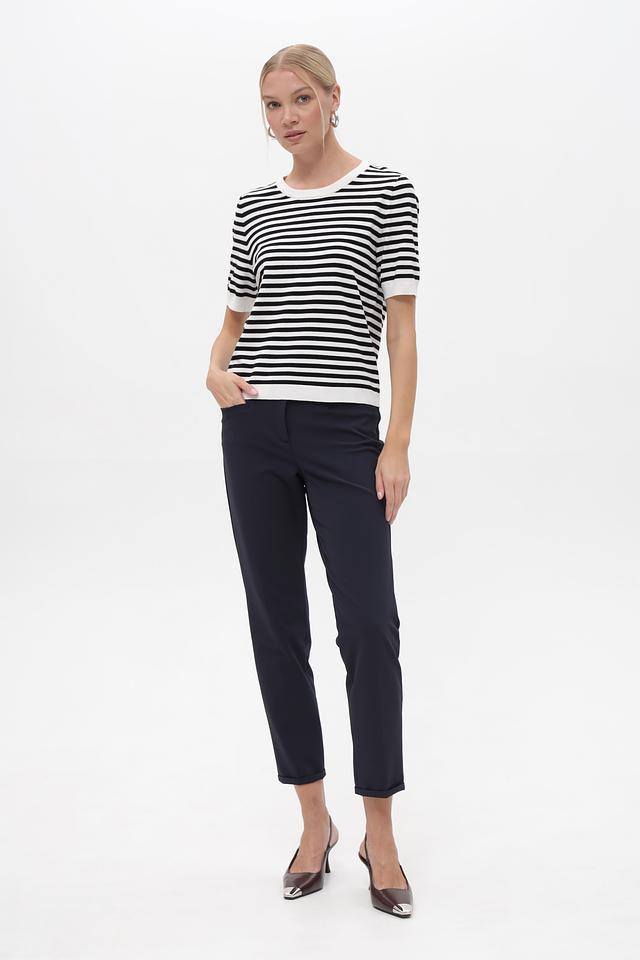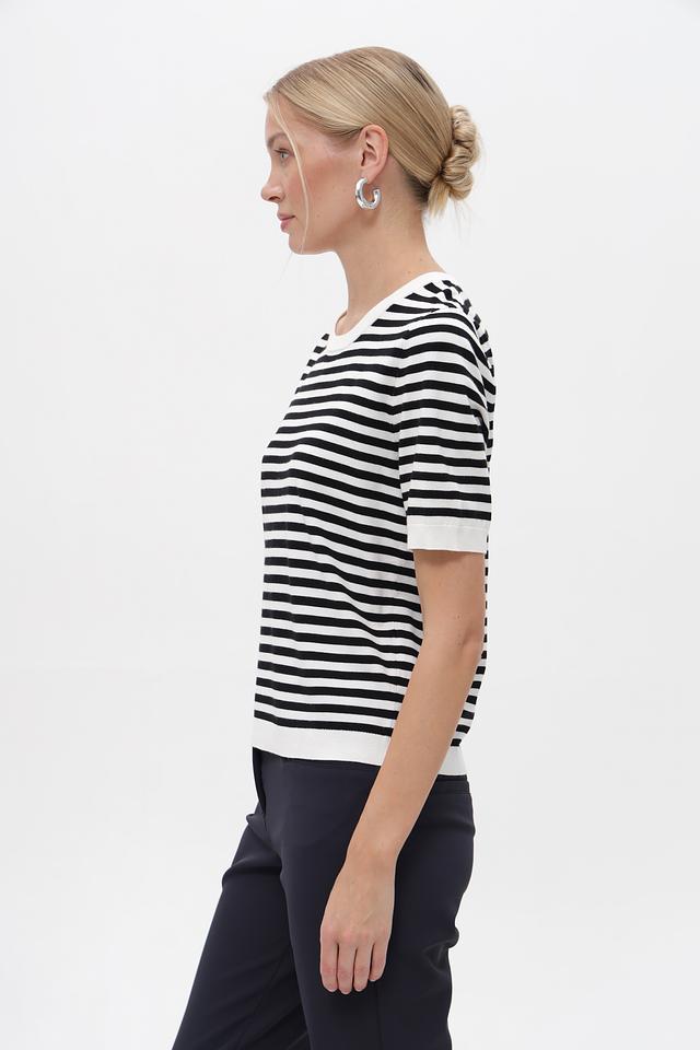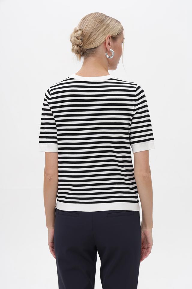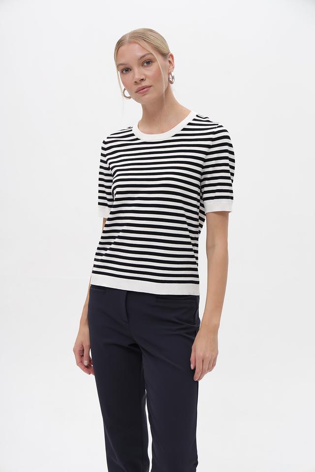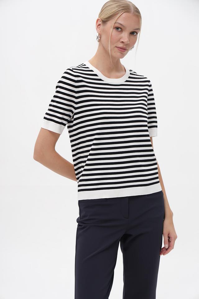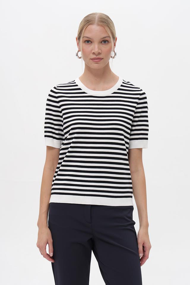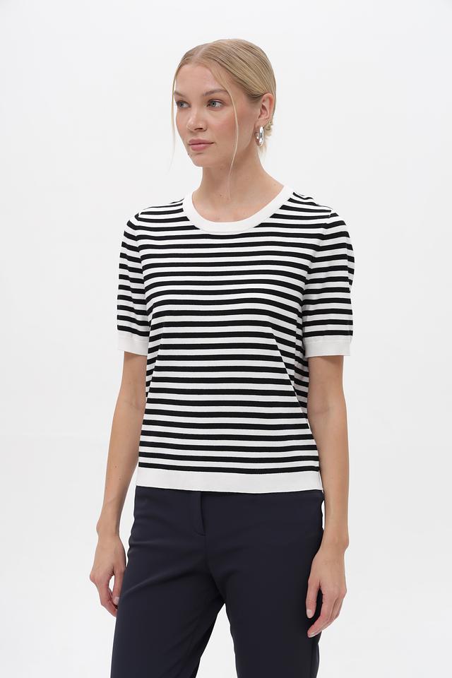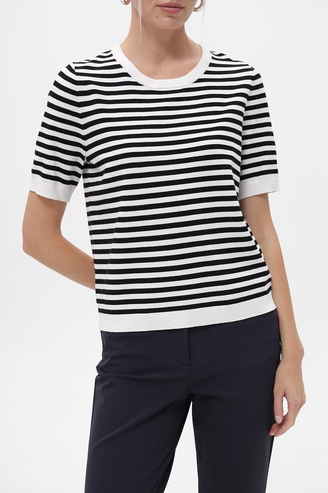 Женский пуловер Gerry Weber чёрно-белого цвета с коротким рукавом и круглым вырезом. Модель выполнена в классической полосатой расцветке, идеально подходит для создания повседневных образов. Состав: вискоза 72%, полиэстер 28%