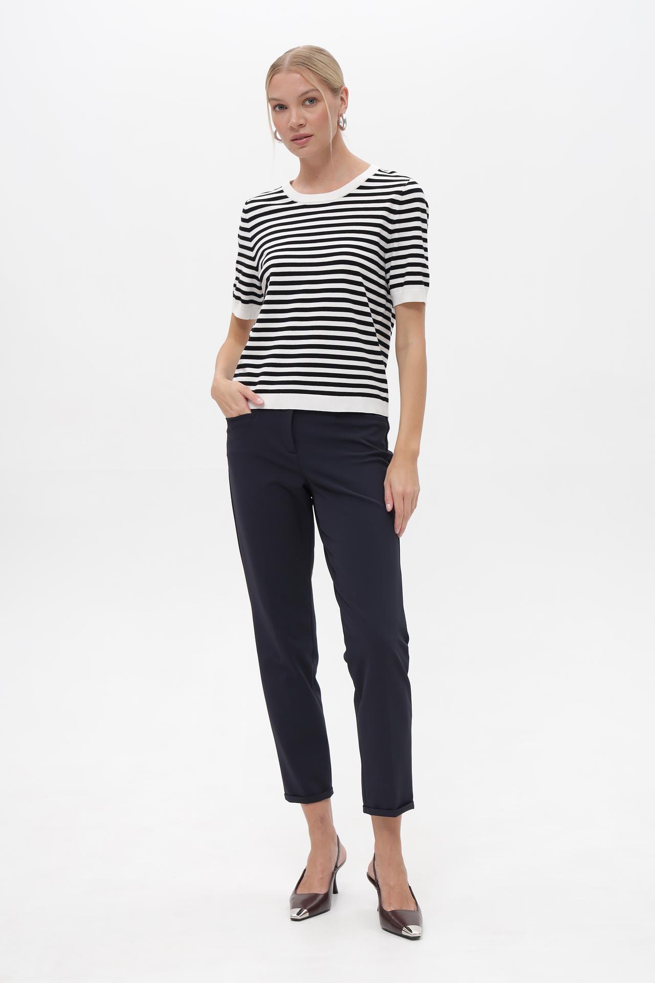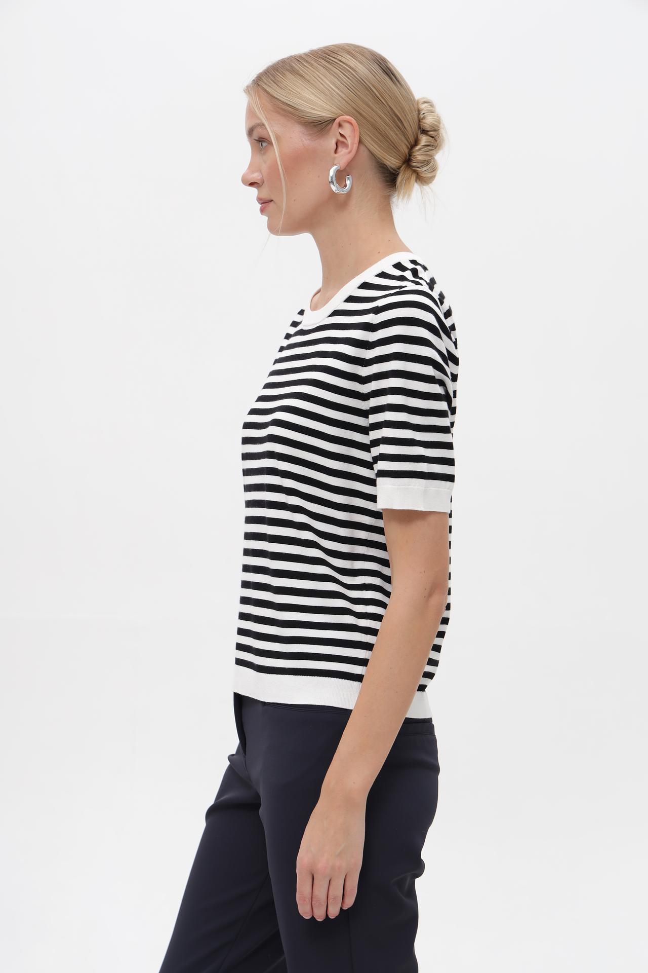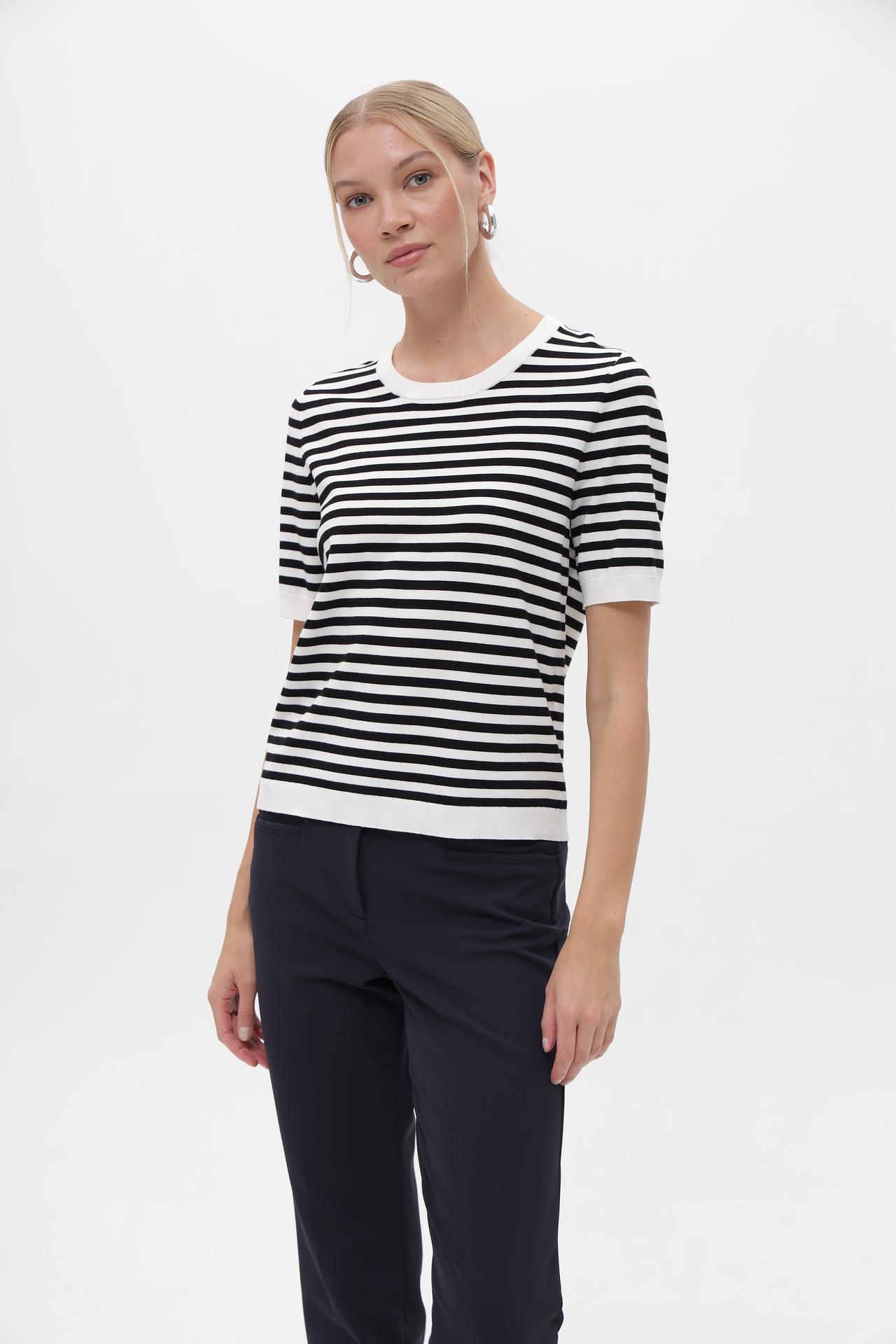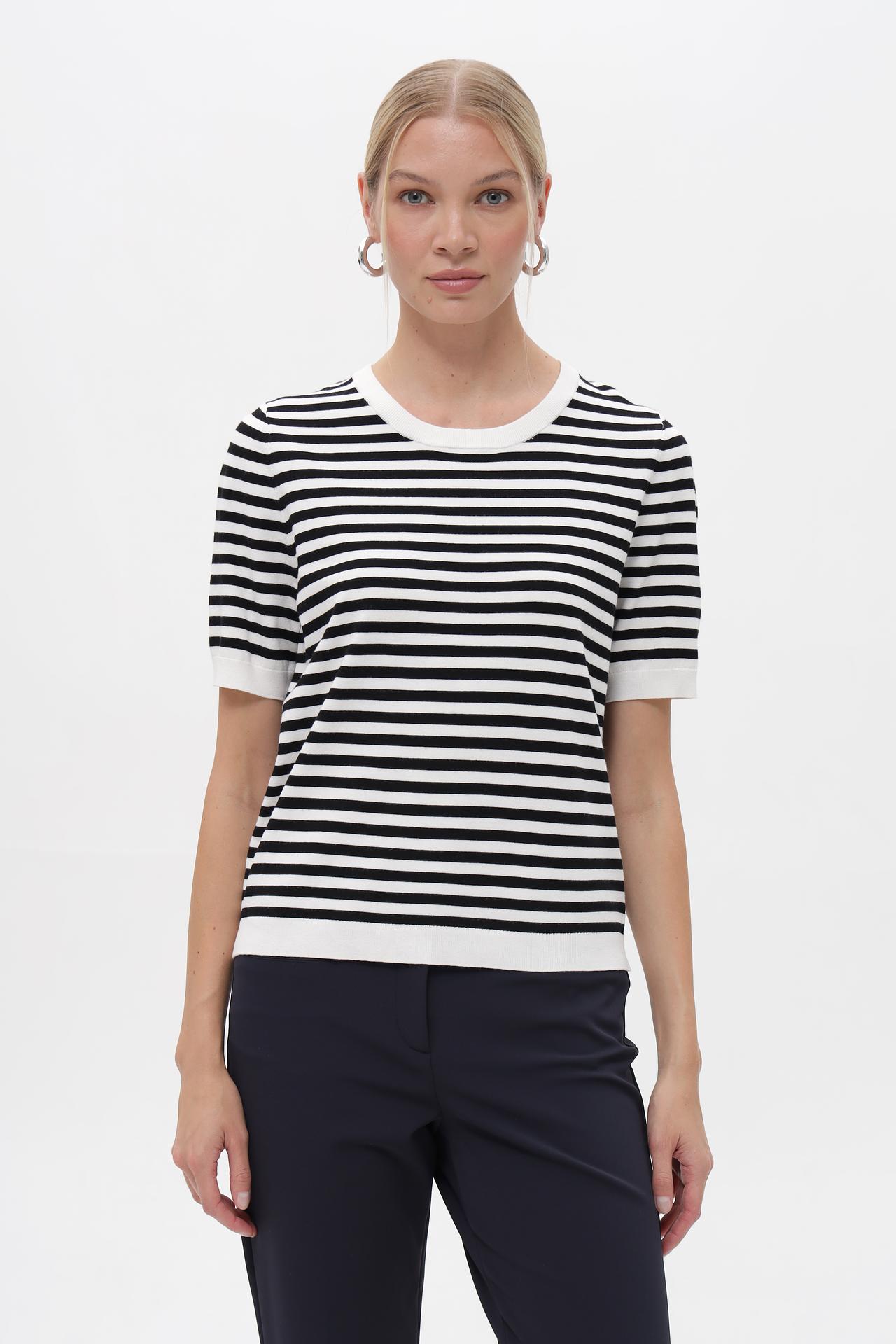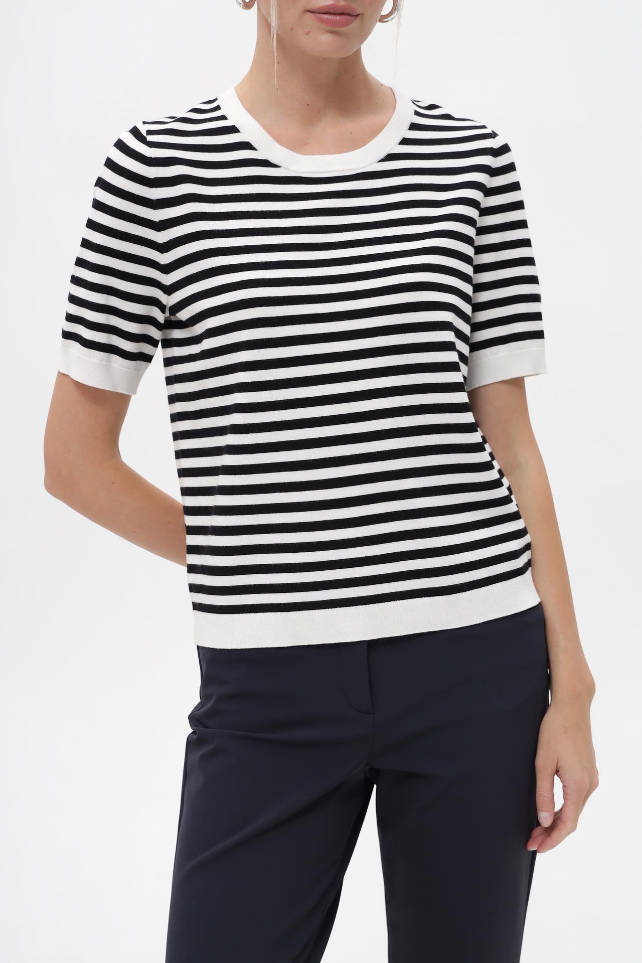 Классический полосатый пуловер Gerry Weber – идеальный выбор для создания стильного и комфортного образа. Модель с короткими рукавами и круглым вырезом горловины выполнена в универсальной чёрно-белой гамме, что делает её незаменимой частью базового гардероба. Этот женский джемпер подходит как для повседневных, так и для более официальных комплектов.