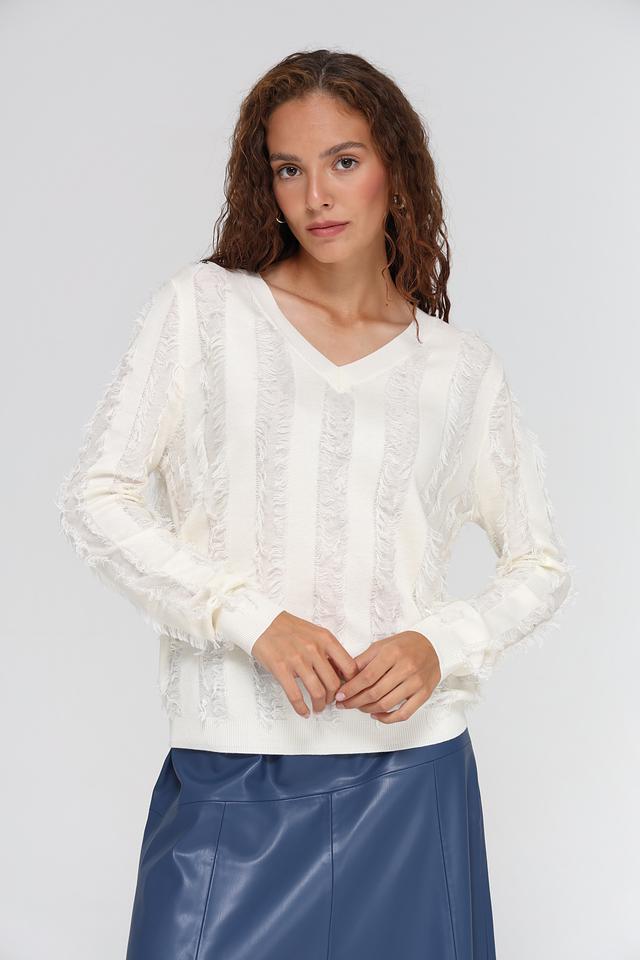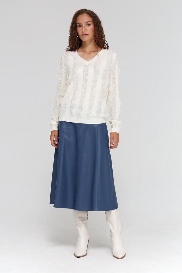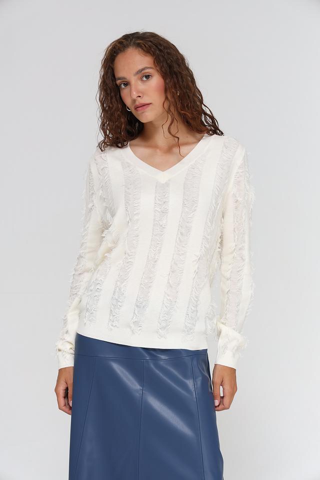 Модель имеет V-образный вырез и длинные рукава, что делает ее универсальной для создания различных образов. Пуловер хорошо сочетается с юбками, брюками и джинсами, позволяя создавать стильные и комфортные комплекты.