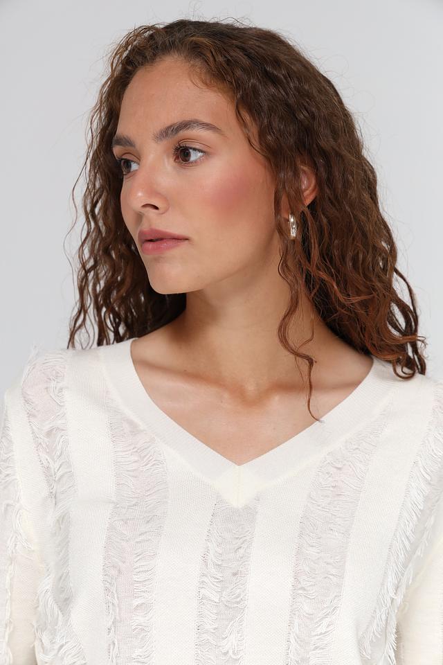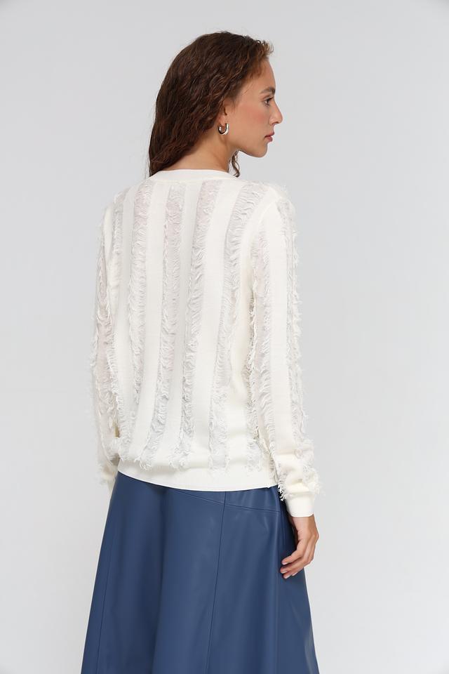 Этот пуловер от Gerry Weber станет прекрасным дополнением к вашему гардеробу. Выполненный в нежном белом цвете, он привлекает внимание оригинальным дизайном с вертикальными полосами, украшенными декоративной бахромой.
