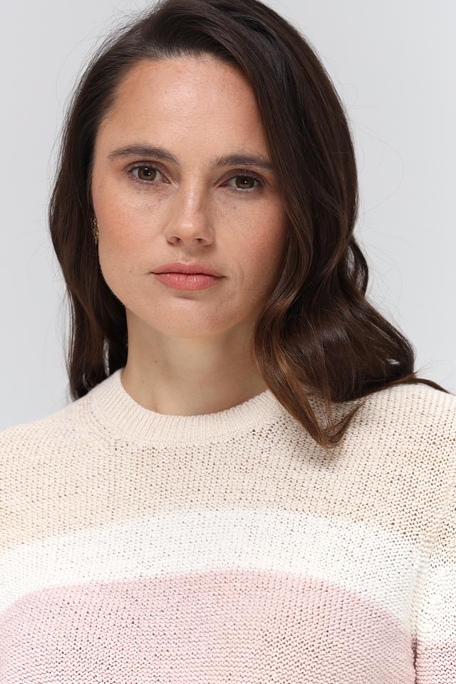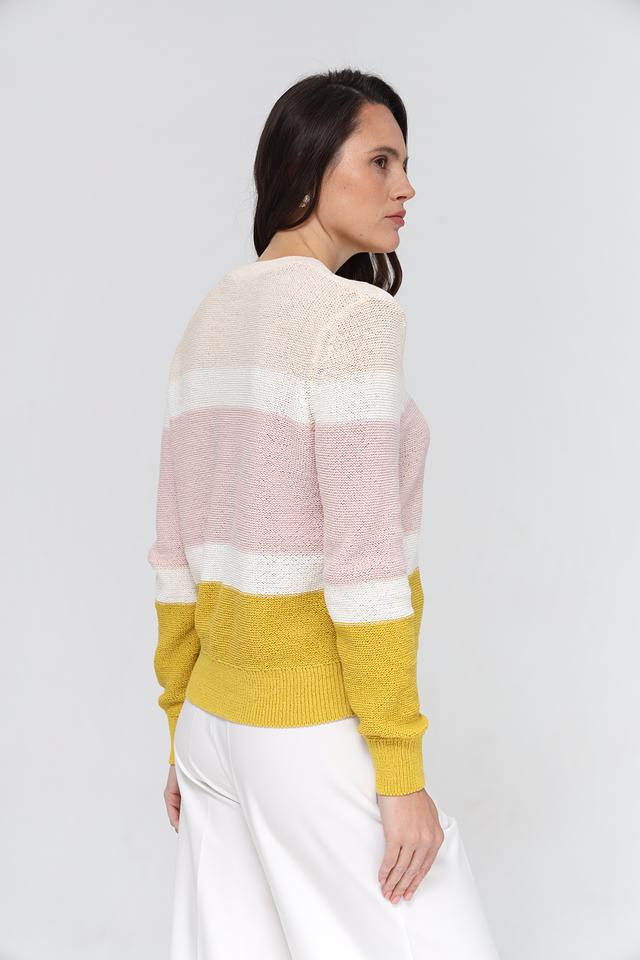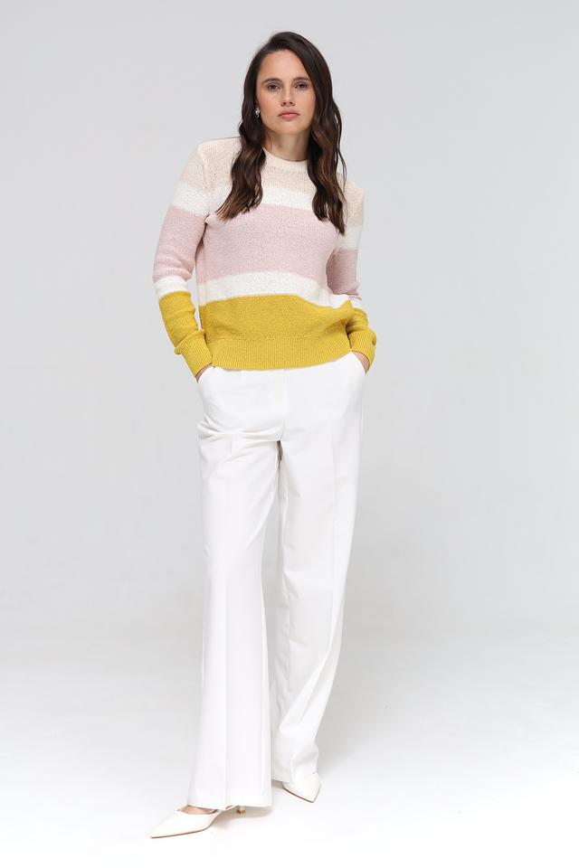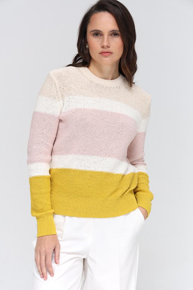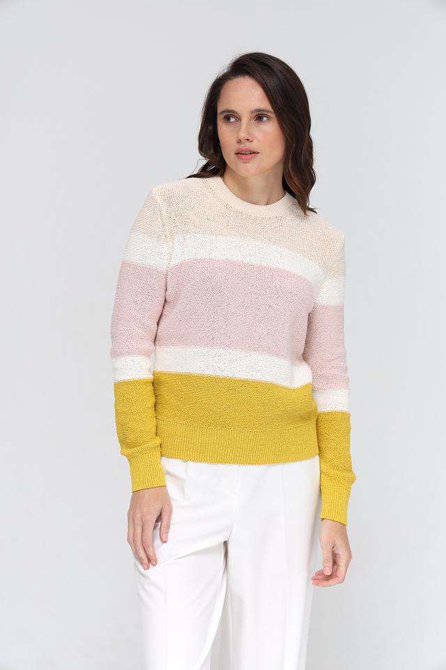 Женский пуловер Gerry Weber нежно-розового, белого и горчичного цвета с полосатым дизайном. Изготовлен из хлопка с добавлением полиэстера для комфорта и долговечности. Состав: хлопок 70%, полиэстер 30%