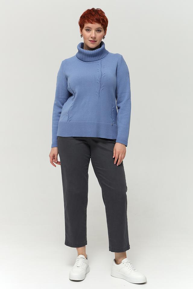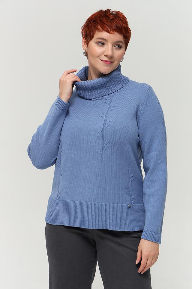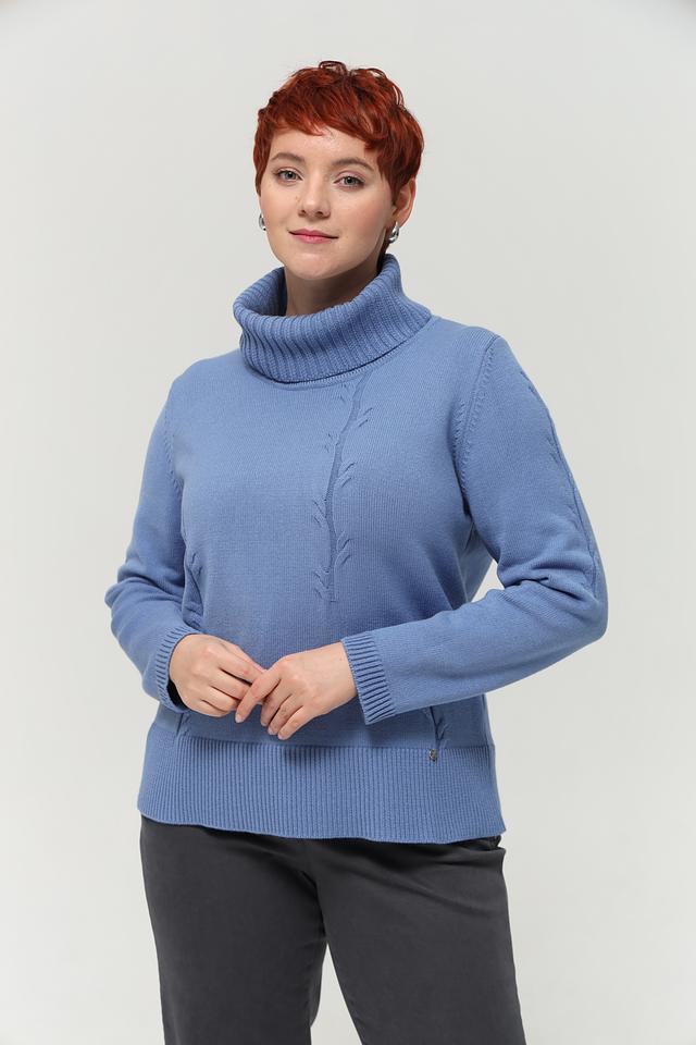 Пуловер имеет высокий воротник-стойку, который не только согревает в прохладную погоду, но и придает образу элегантность. Передняя часть украшена рельефным узором в виде кос, добавляющим изделию текстуру и оригинальность.