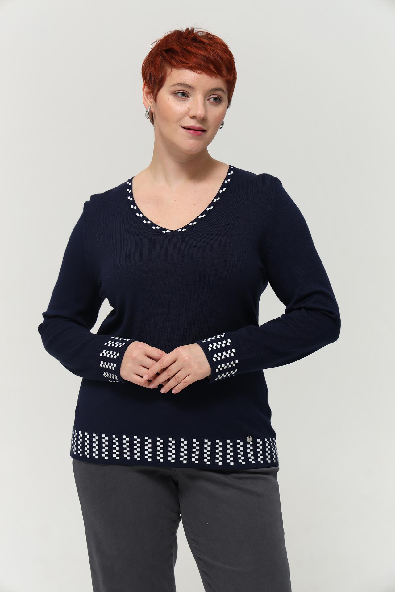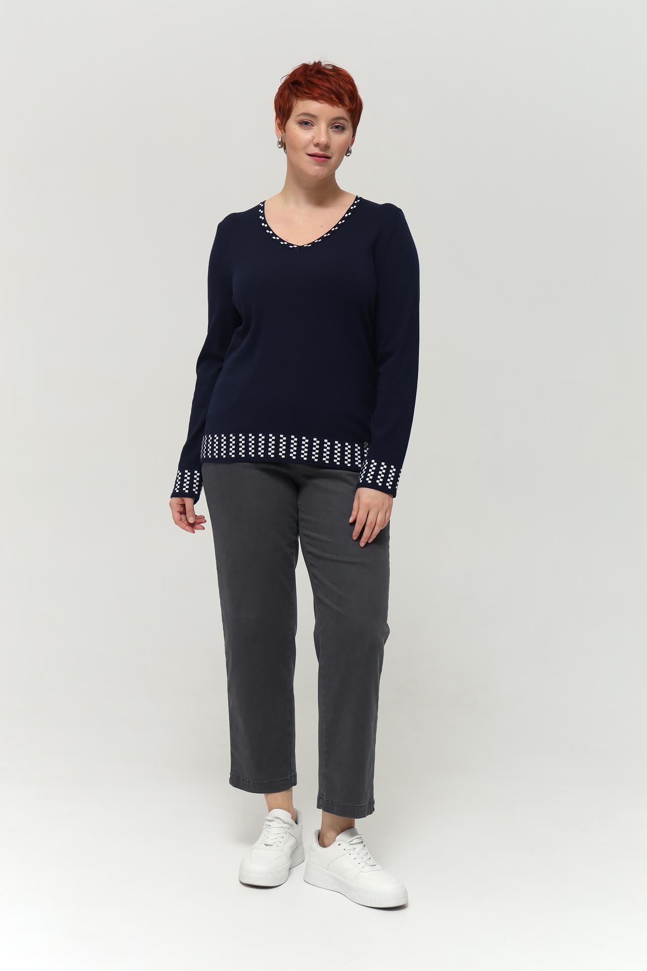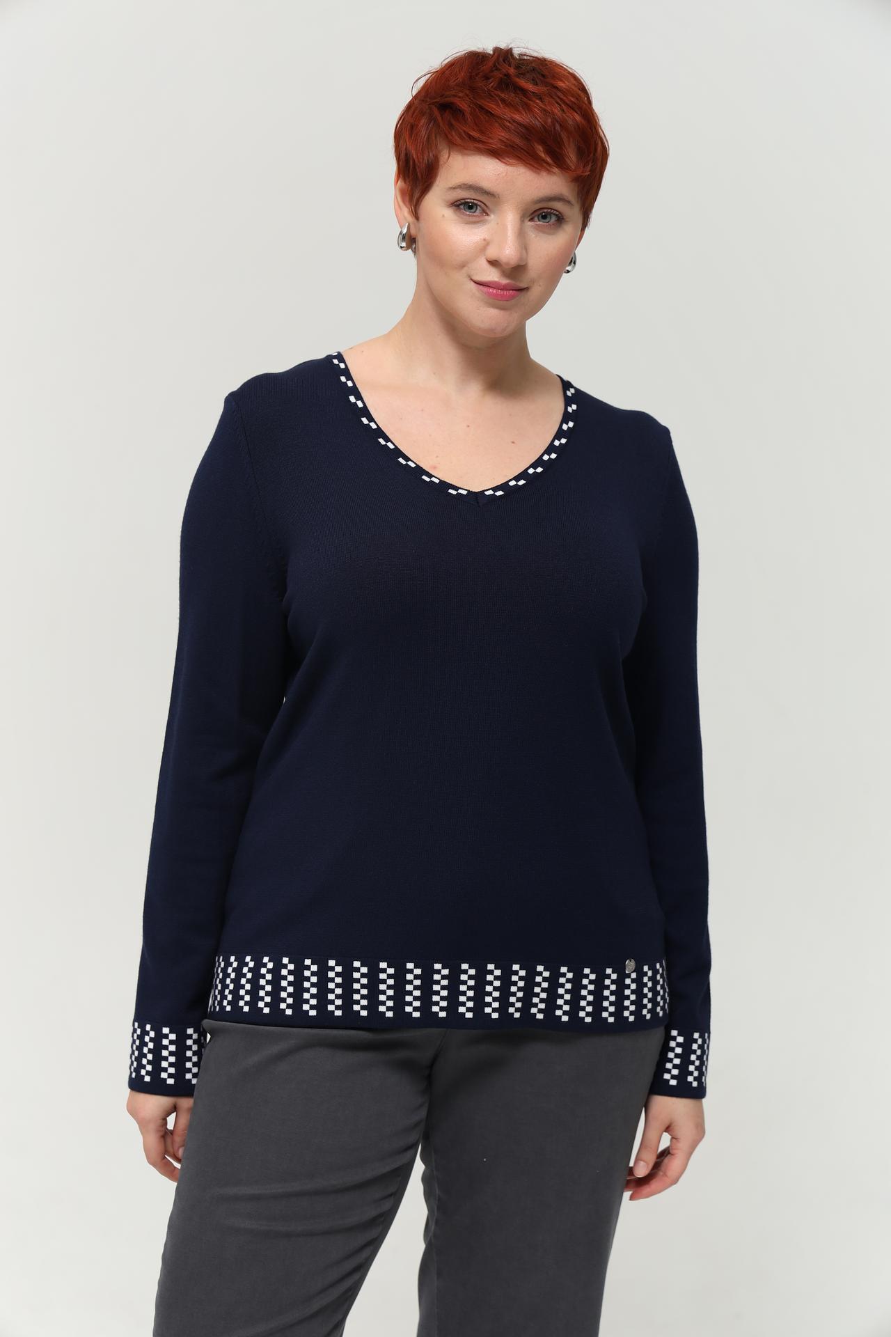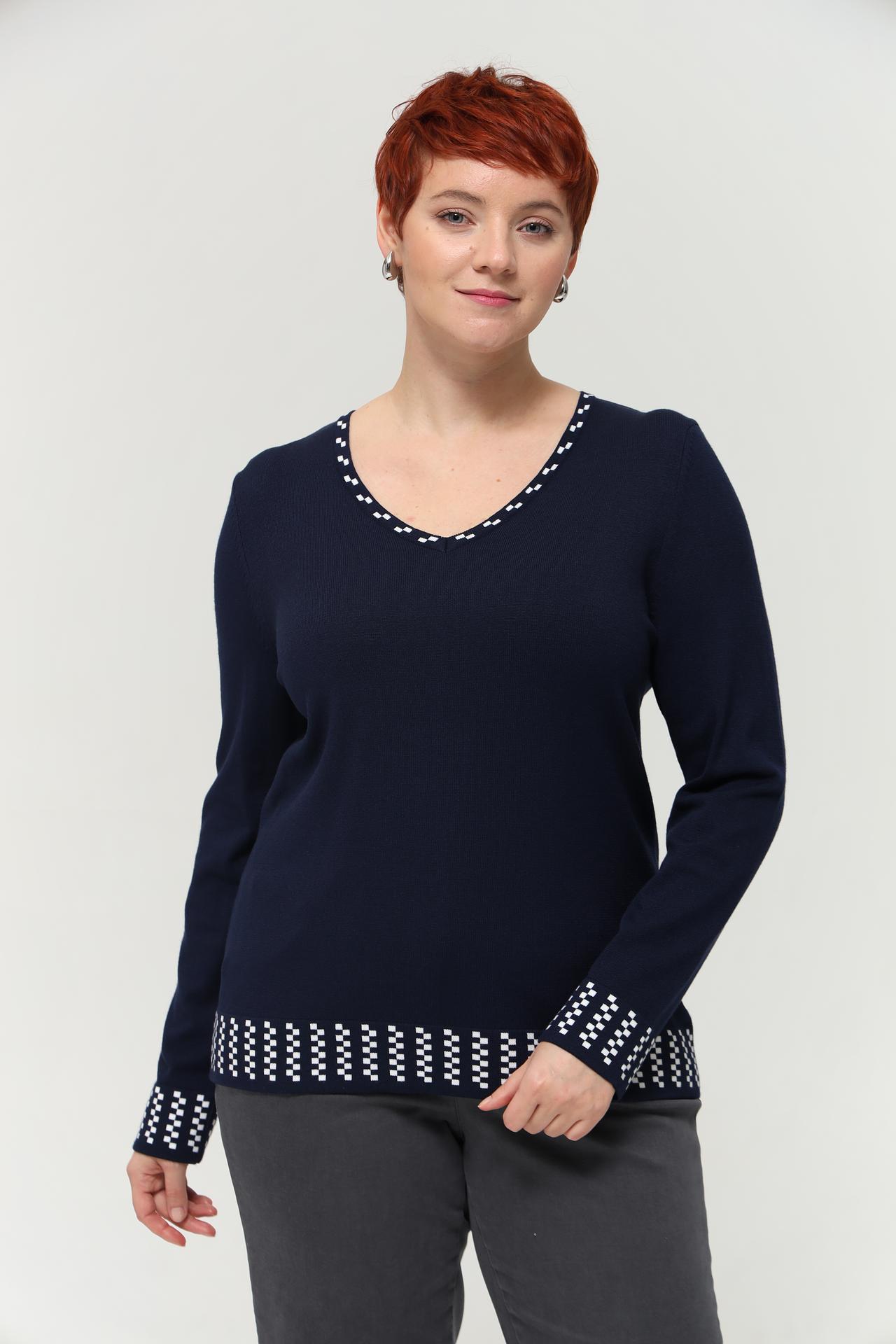 - Дизайн: Классический синий пуловер с V-образным вырезом, дополненный белой декоративной отделкой в виде мелкой клетки по краю выреза горловины, низа изделия и манжет. Этот узор придает модели современный и динамичный вид, сохраняя при этом универсальность.