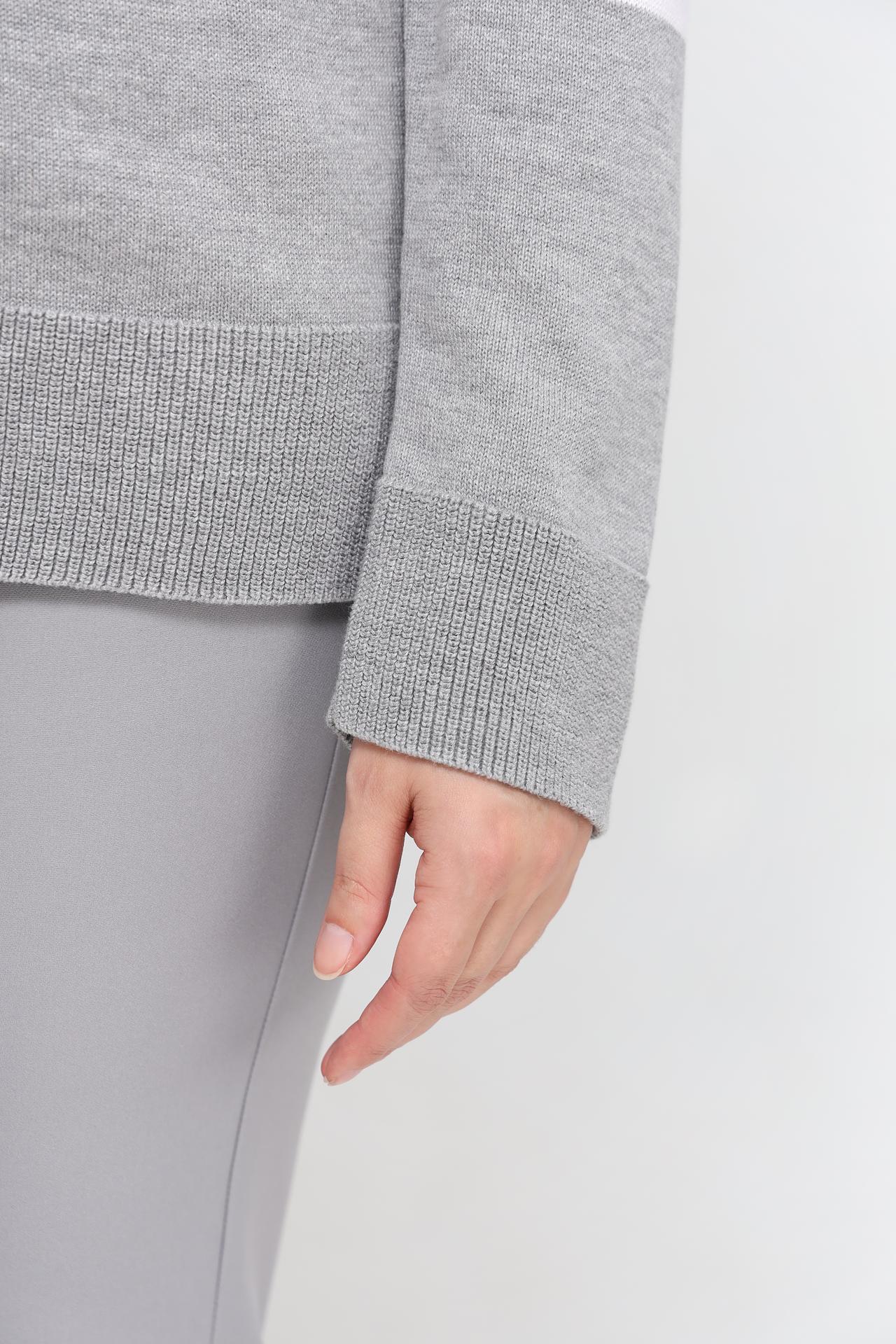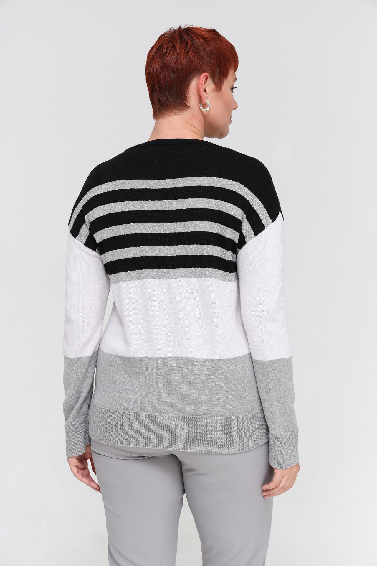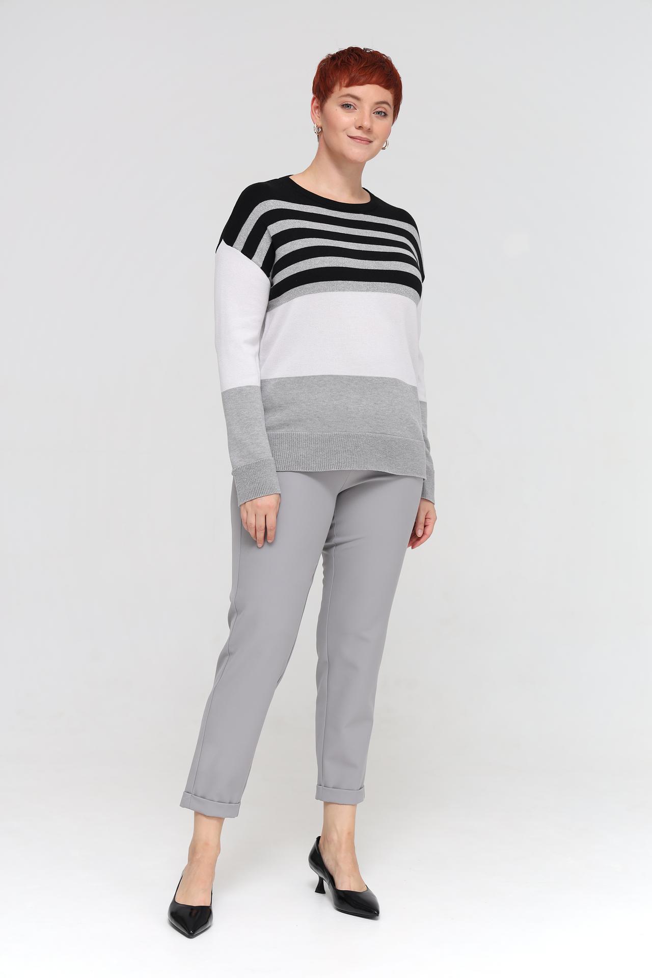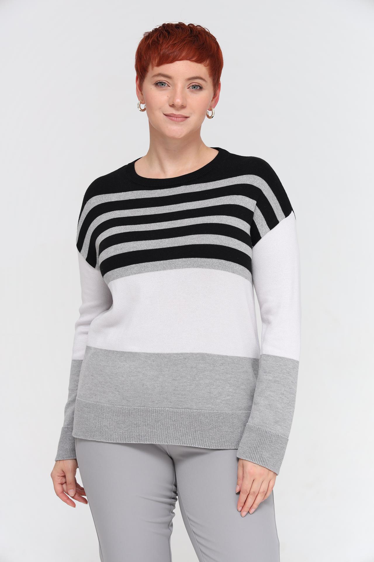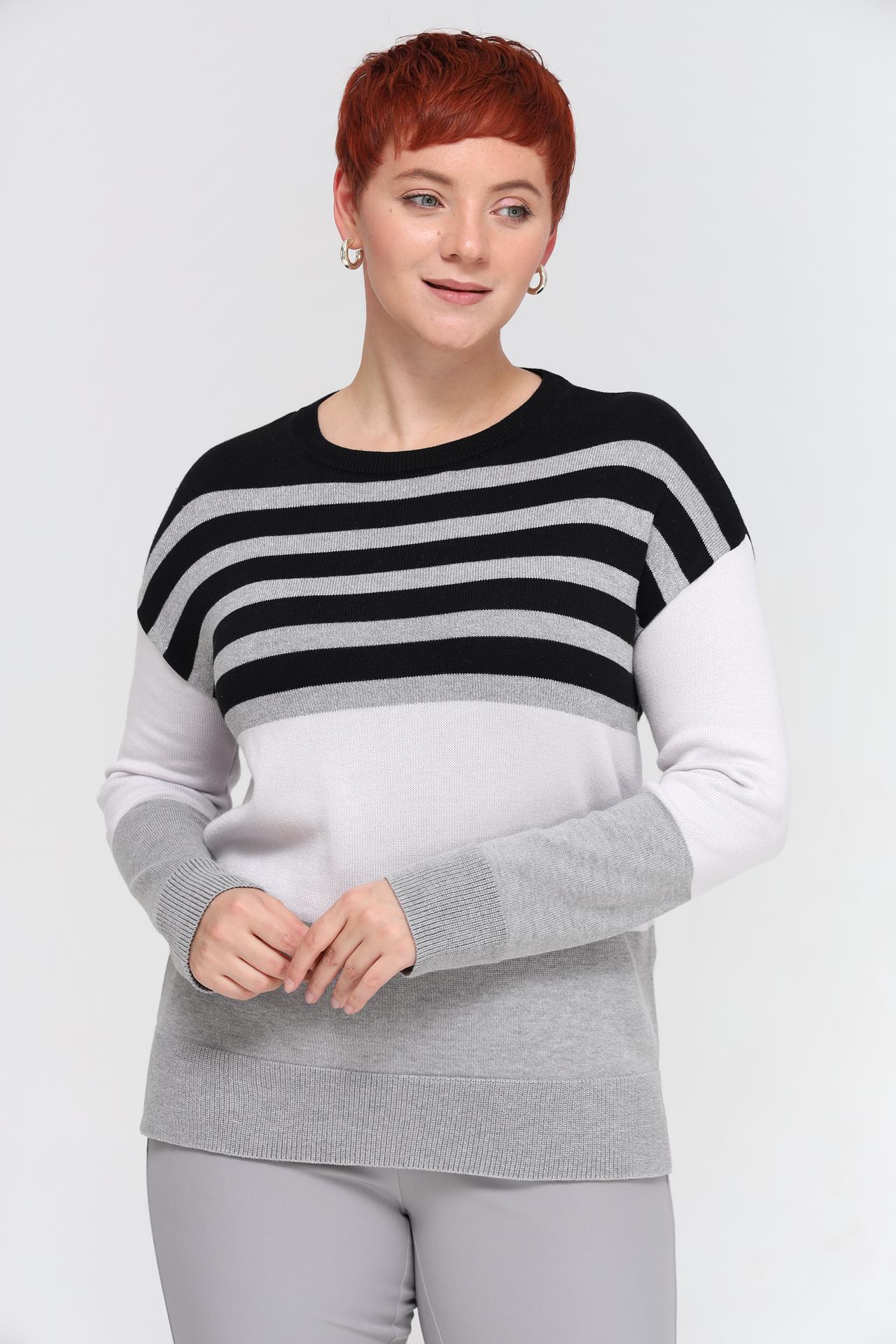 - Современный дизайн: Пуловер отличает актуальный полосатый узор и эффектное сочетание цветовых блоков в чёрном, белом и серых оттенках, дополненных серебристой нитью.