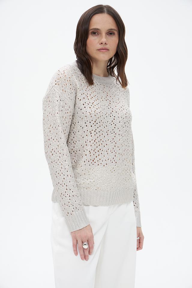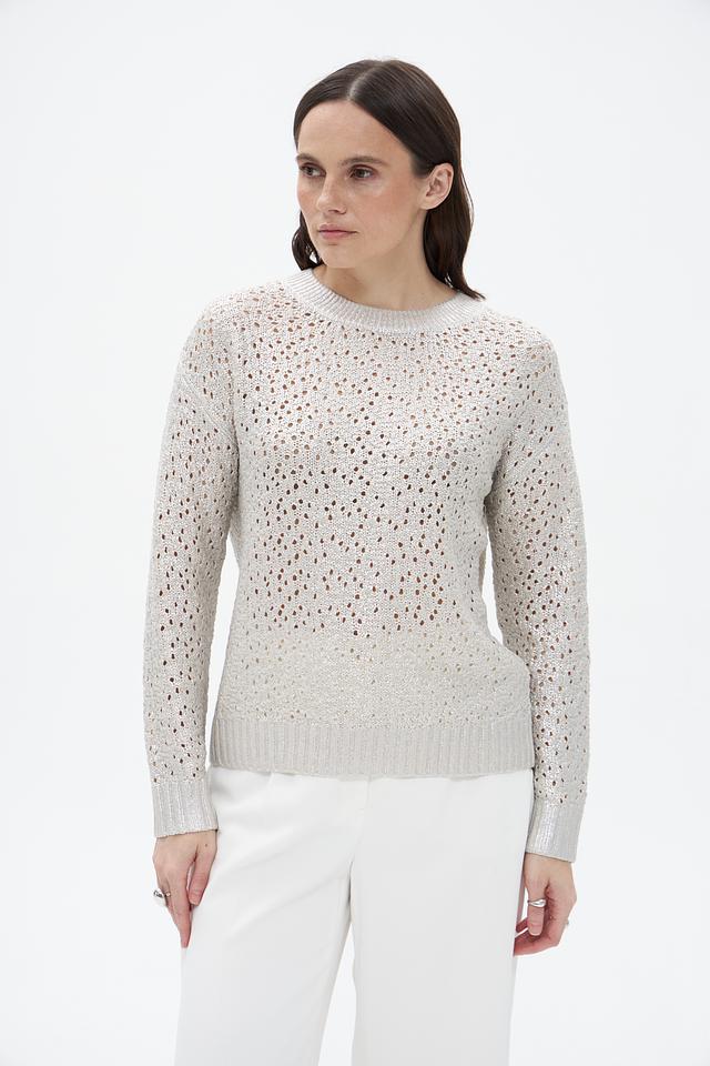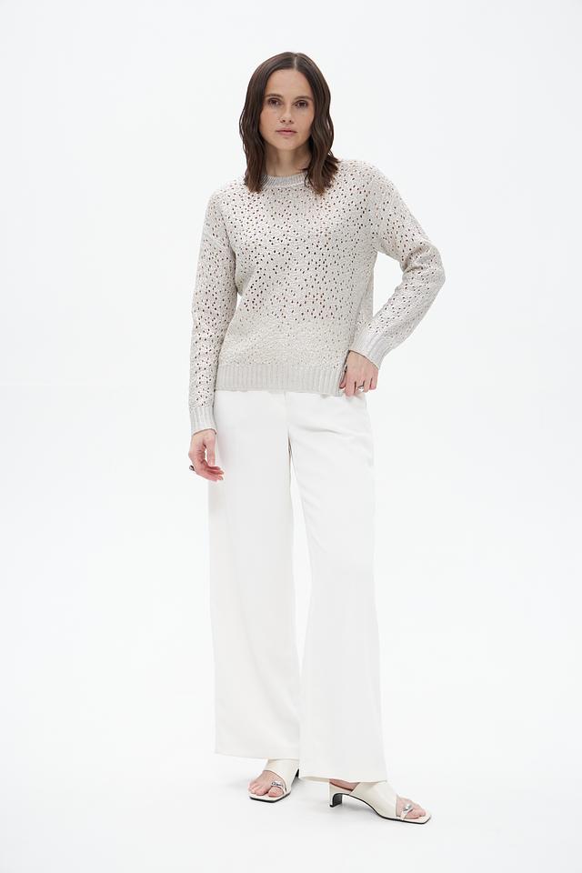 Особенностью модели является ажурный узор, который придает ей легкость и воздушность. Пуловер имеет классический крой с круглым вырезом горловины и длинными рукавами. Он прекрасно сочетается с джинсами, брюками или юбками, создавая стильный и непринужденный образ.