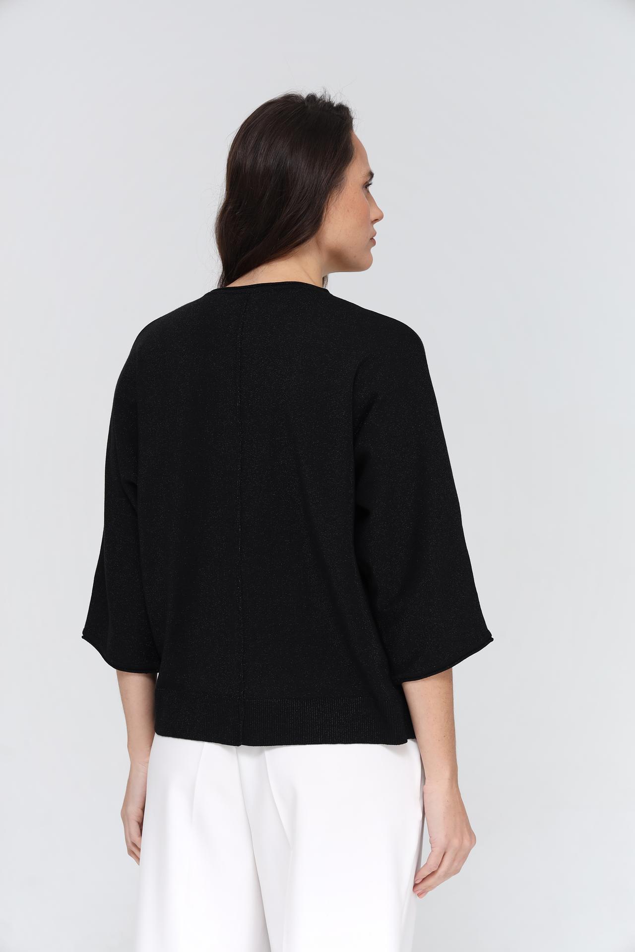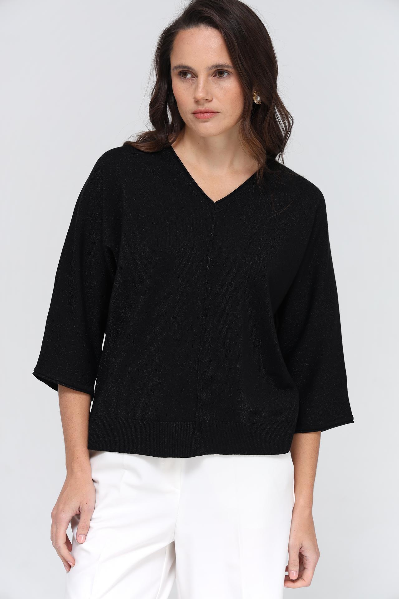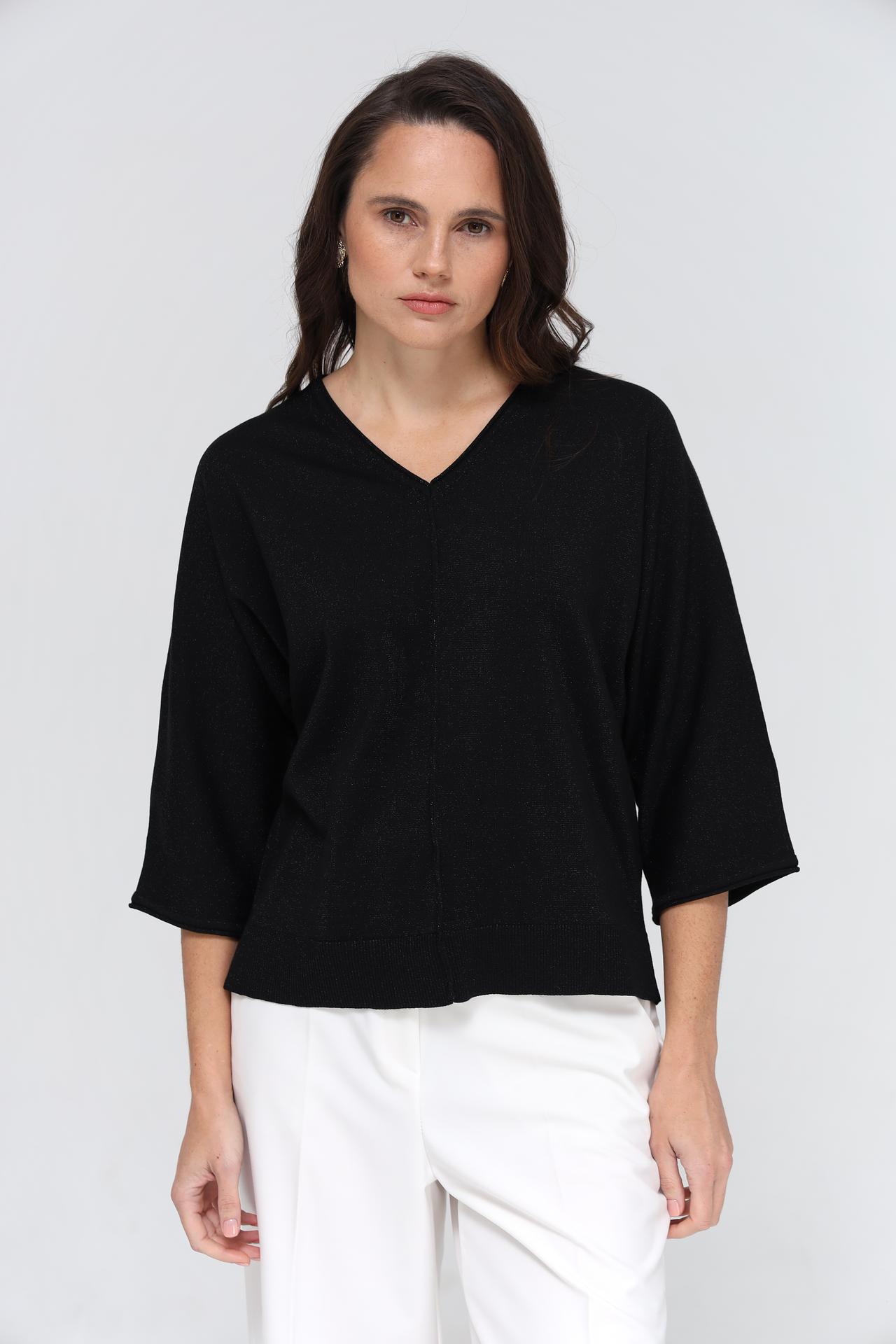 - Дизайн: Классический черный цвет и лаконичный крой делают пуловер универсальным элементом гардероба. V-образный вырез визуально удлиняет шею, а рукава 3/4 придают образу легкости.