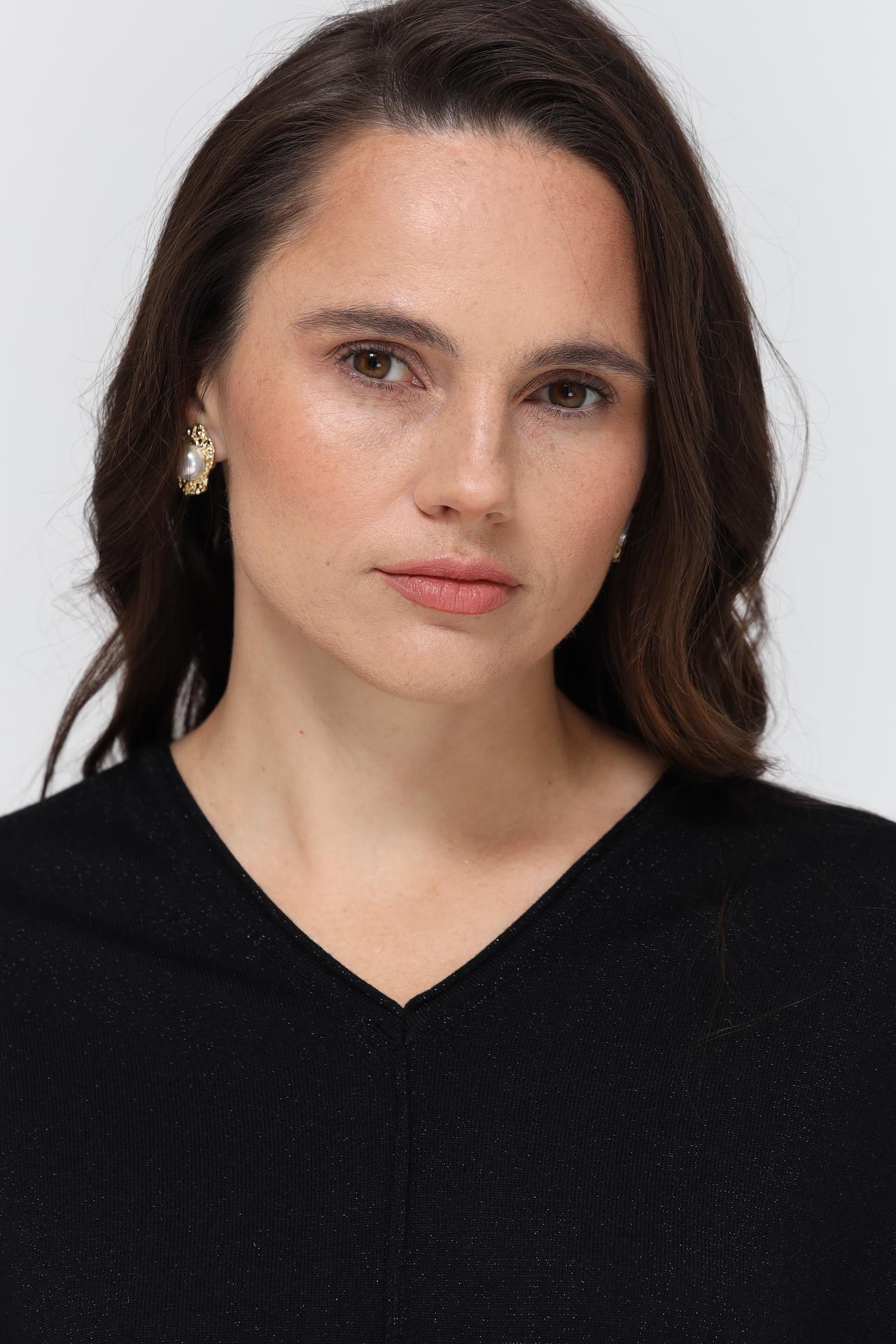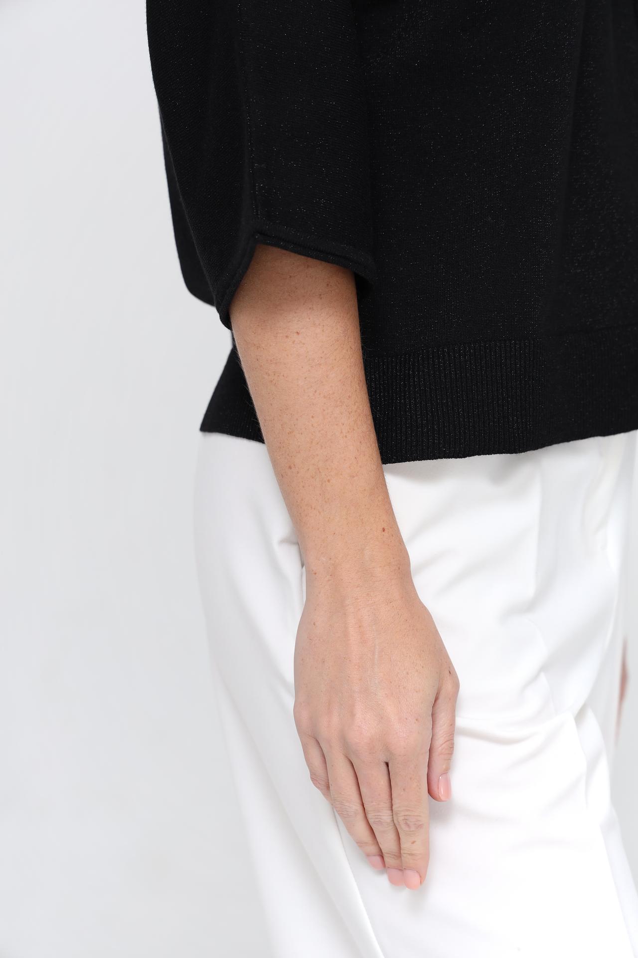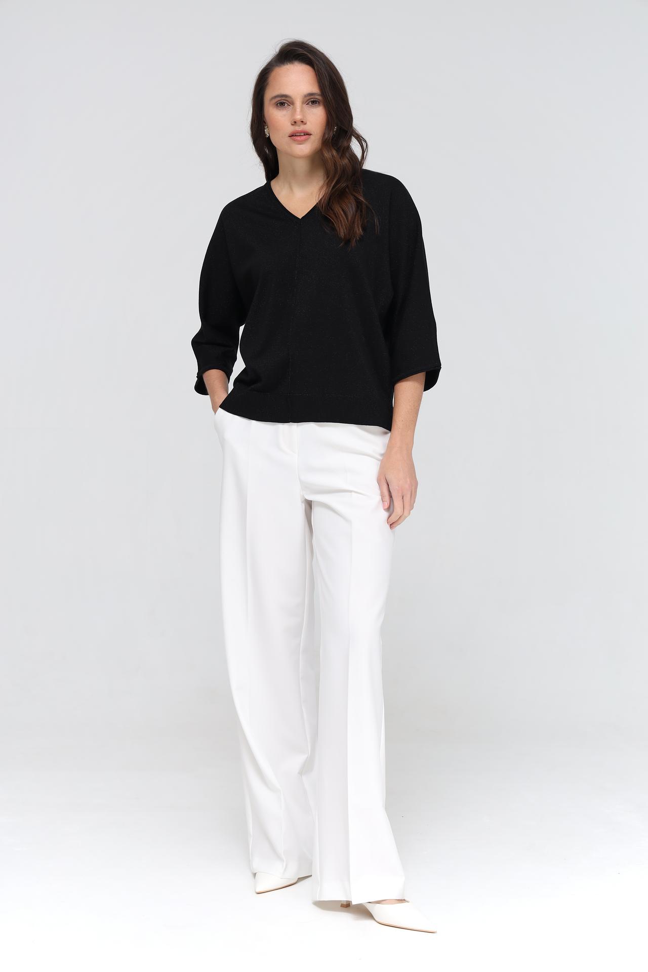 - Дизайн: Классический черный цвет и лаконичный крой делают пуловер универсальным элементом гардероба. V-образный вырез визуально удлиняет шею, а рукава 3/4 придают образу легкости.