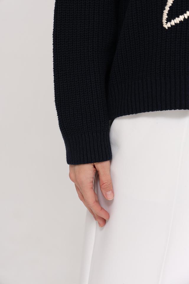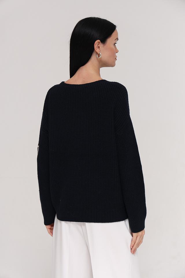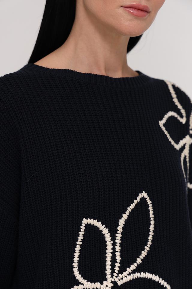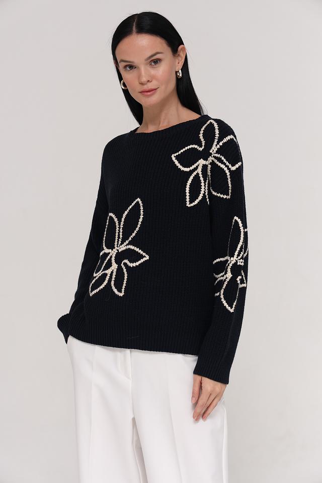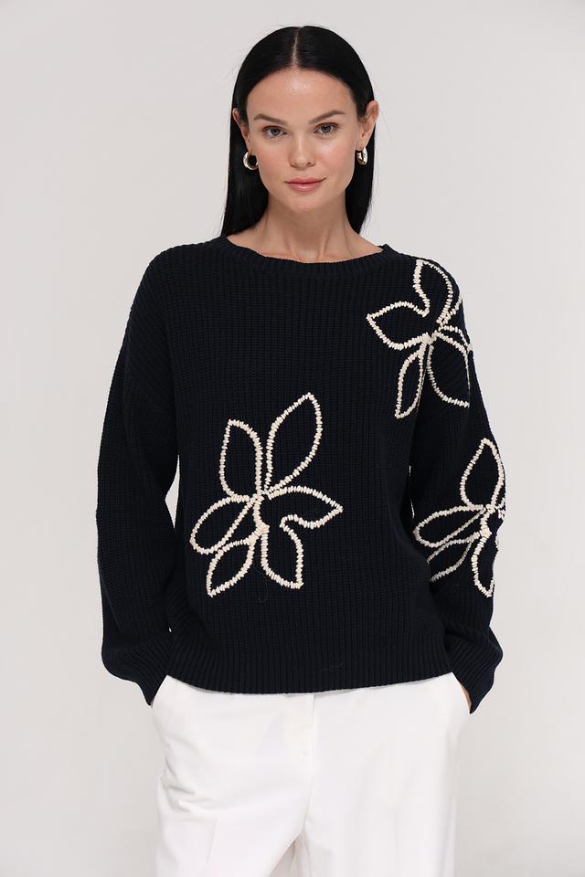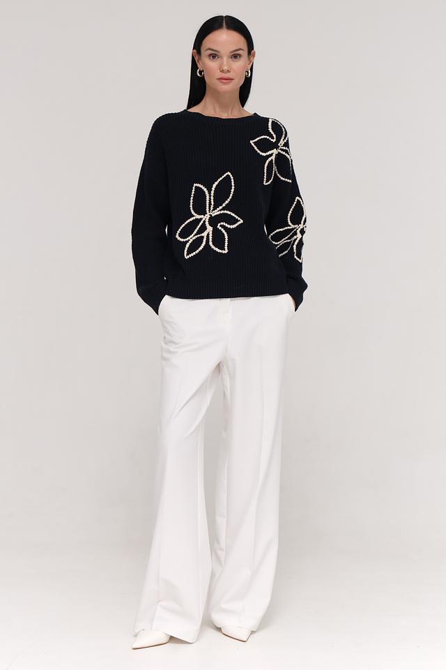 Пуловер имеет классический крой с круглым вырезом горловины и длинными рукавами. Особенностью модели является деликатный цветочный принт, выполненный белой нитью, который добавляет образу женственности и оригинальности.