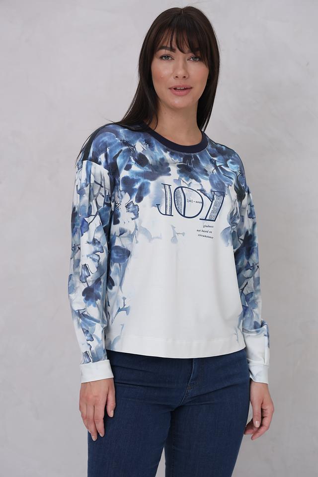 Этот стильный пуловер от Lecomte станет прекрасным дополнением к вашему гардеробу. Пуловер выполнен в белом цвете и украшен эффектным цветочным принтом в синих тонах. Надпись "JOY" добавляет образу позитива и оригинальности.
