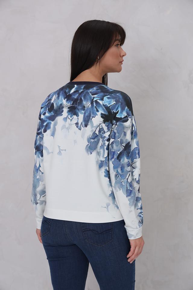 Женский пуловер Lecomte белого цвета с ярким цветочным принтом и надписью "JOY". Модель выполнена из мягкого и приятного к телу сочетания хлопка, модала и эластана, обеспечивающего комфорт при носке. Состав: хлопок 47%, модал 47%, эластан 6%