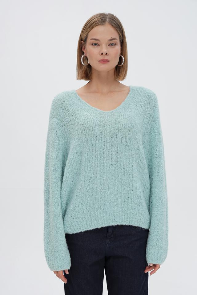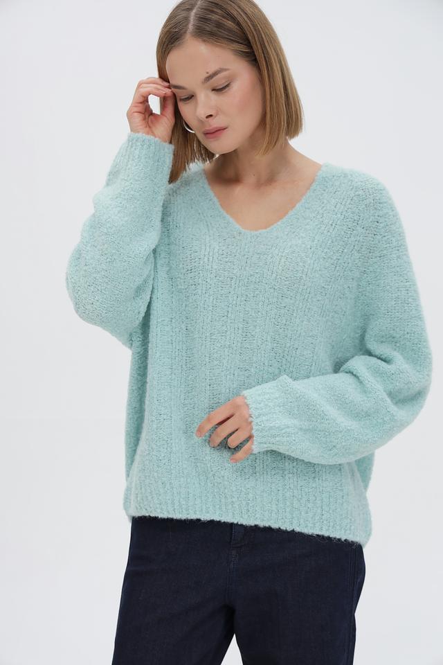 Мятный пуловер Marc Cain Sports свободного кроя, выполнен из мягкой смеси шерсти и альпаки. Модель с V-образным вырезом и объёмными рукавами обеспечит комфорт и стильный образ. Состав: 38% акрил, 13% шерсть, 34% альпака, 15% полиамид. Состав: акрил 38%, альпака 34%, полиамид 15%, шерсть 13%