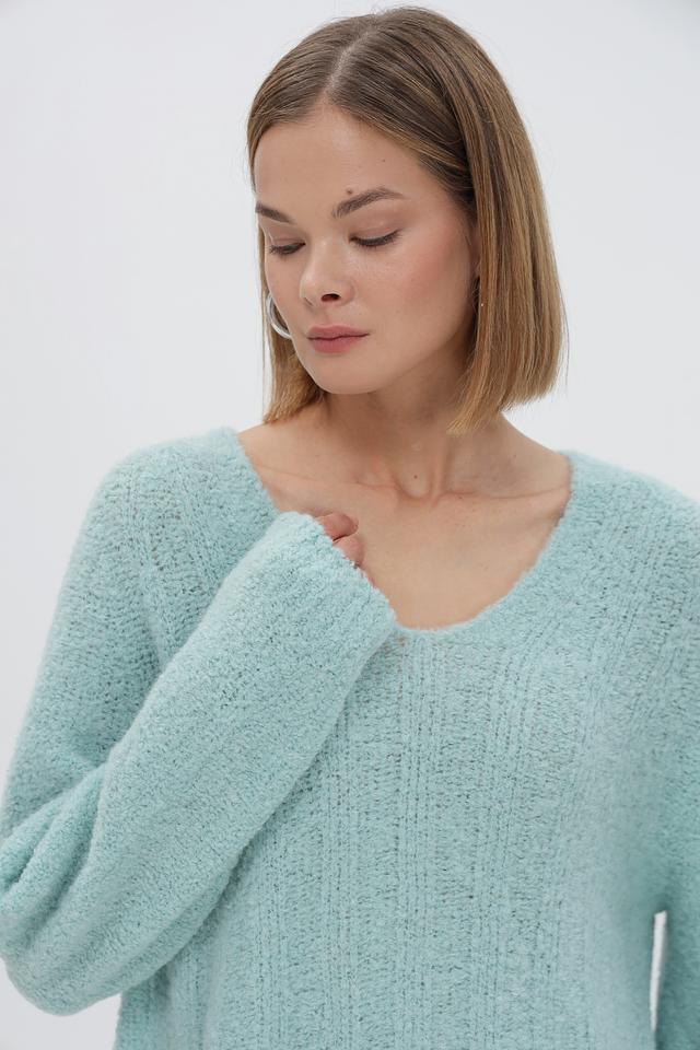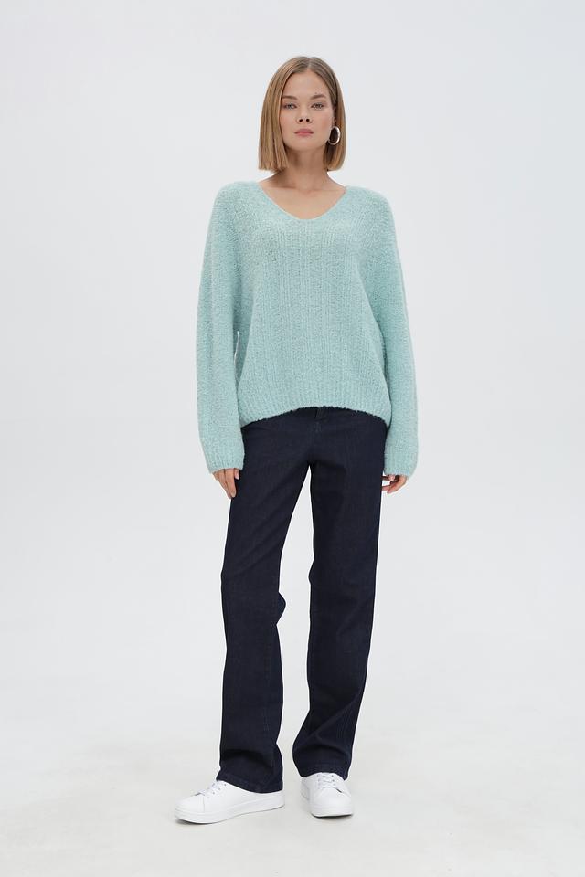 Пуловер имеет свободный крой, который обеспечивает комфортную посадку и свободу движений. V-образный вырез горловины придает модели элегантность и позволяет сочетать ее с различными аксессуарами. Объемные рукава добавляют образу воздушности и легкости.