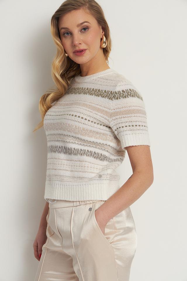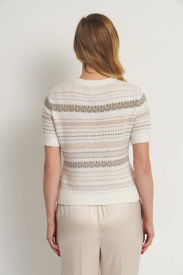 Модель имеет короткие рукава и круглый вырез горловины. Пуловер плотно прилегает к фигуре, подчеркивая ее достоинства. Изделие выполнено из сочетания высококачественных материалов: шерсти, полиамида, вискозы, кашемира, полиэстера, эластана и металлизированного волокна.