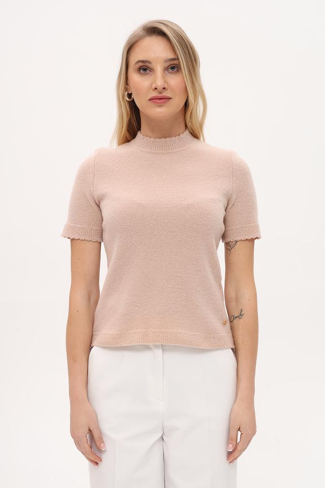 Модель отличается воротником-стойкой и короткими рукавами с декоративной оборкой, что придает ей особый шарм. Пуловер изготовлен из высококачественной смеси шерсти (63%), полиамида (25%), кашемира (10%) и эластана (2%).