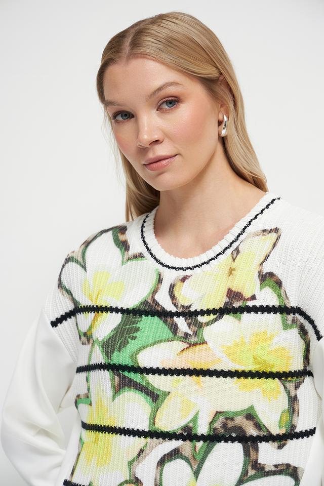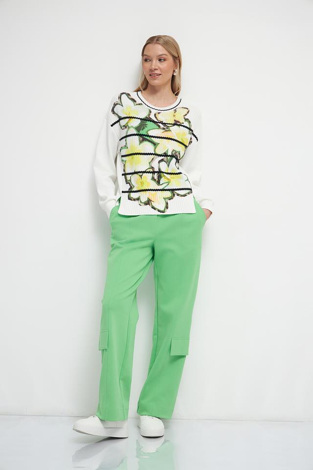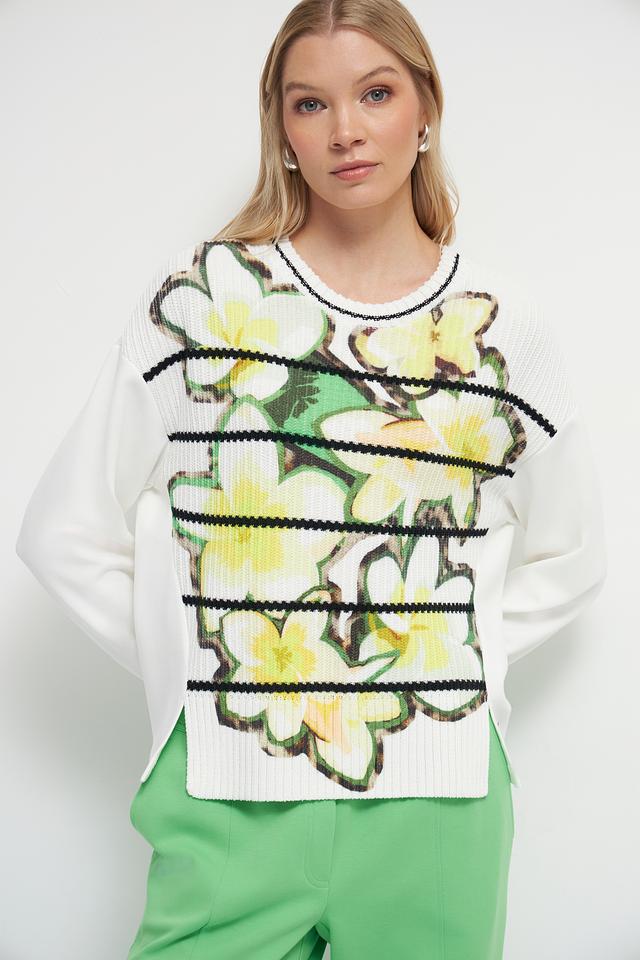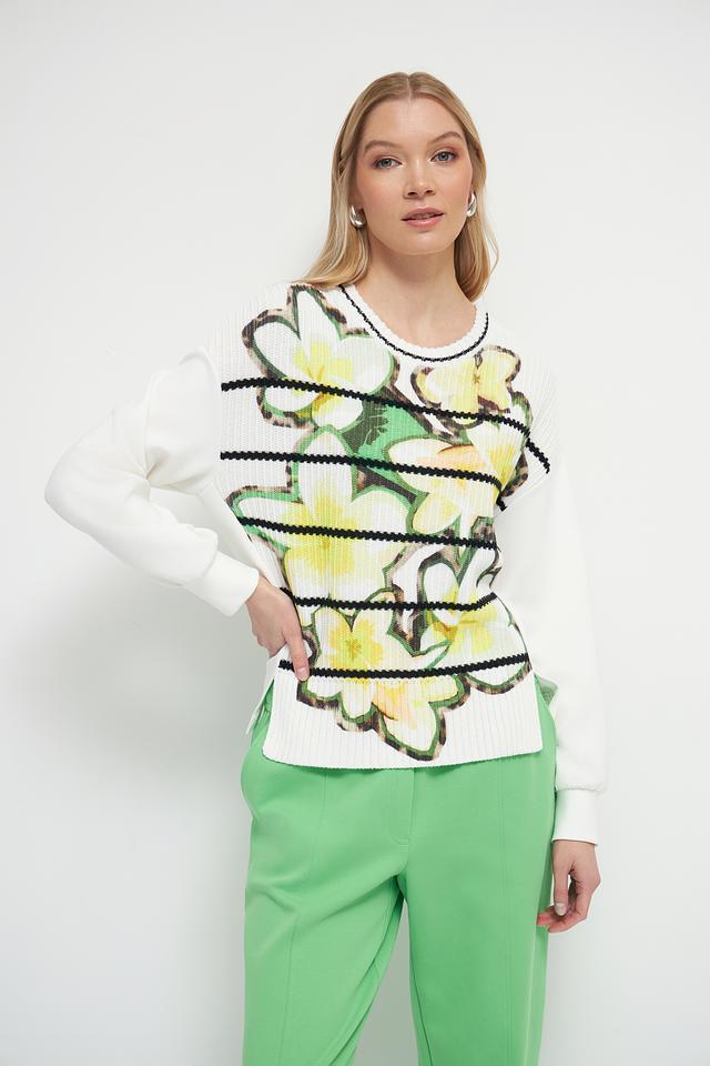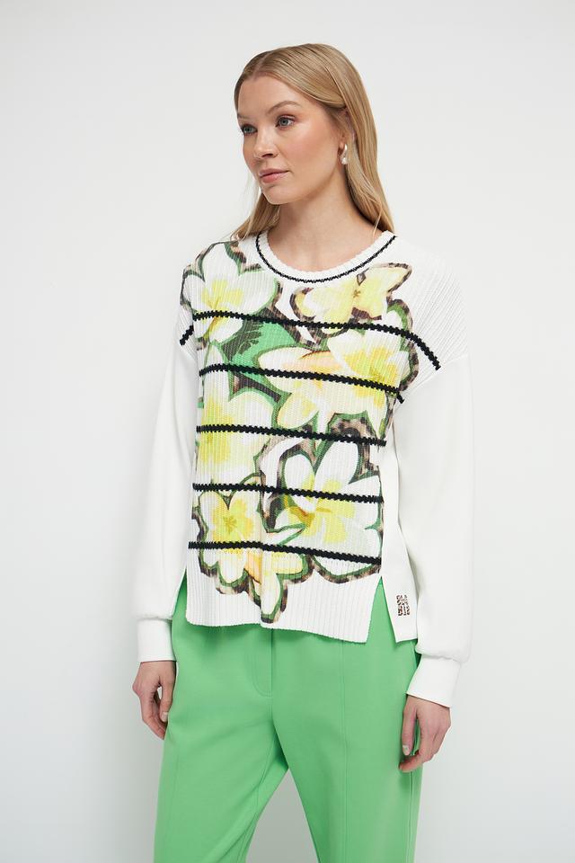 Этот пуловер от Marc Cain станет ярким акцентом вашего гардероба. Он выполнен в белом цвете и украшен крупным цветочным принтом, выполненным в желтых и зеленых тонах.