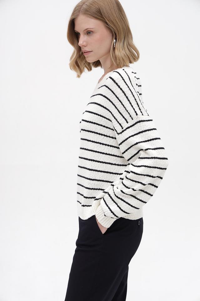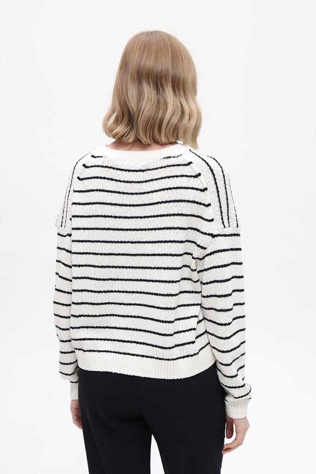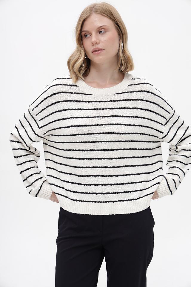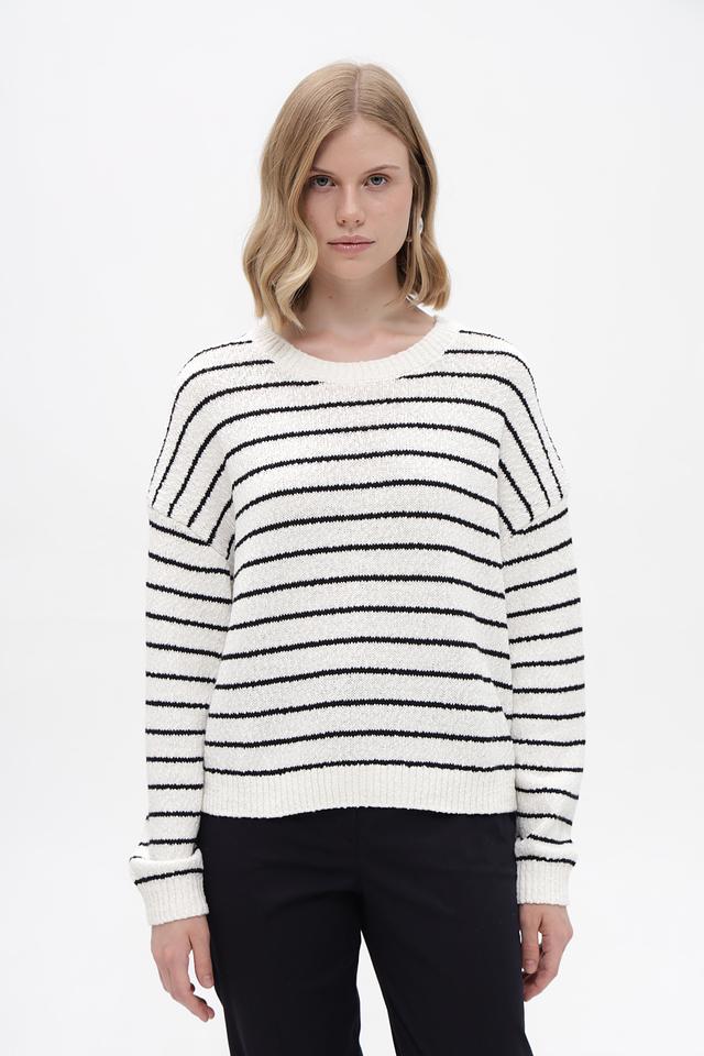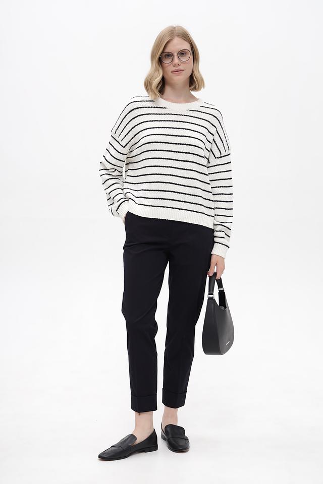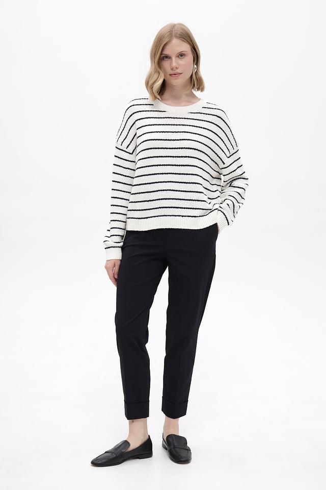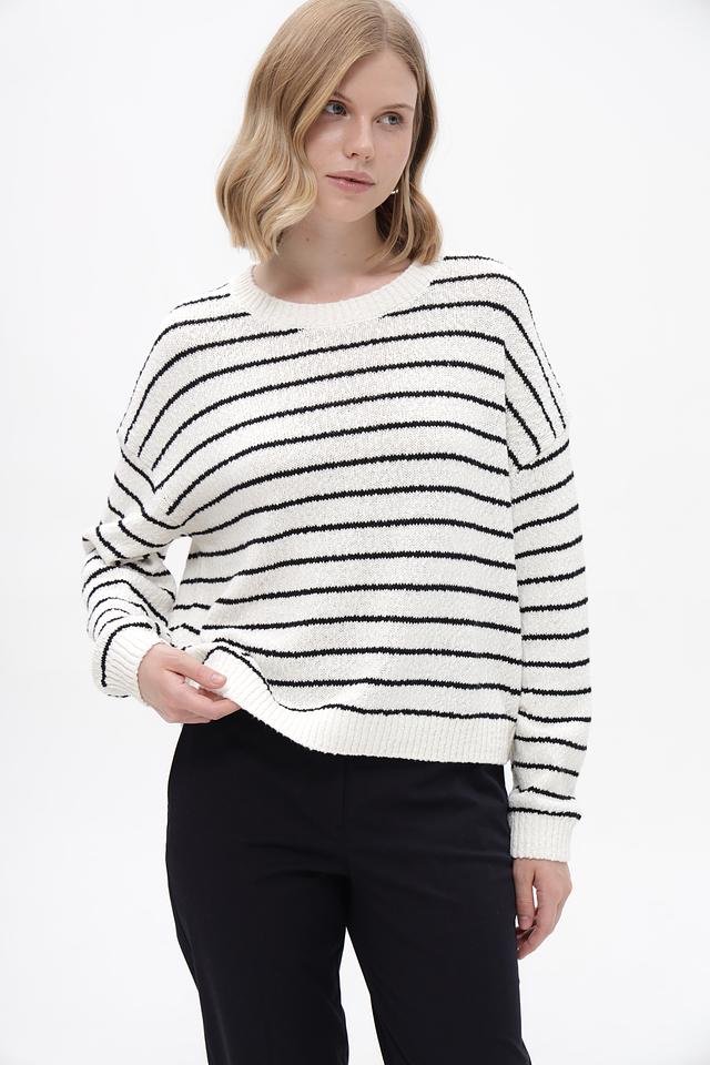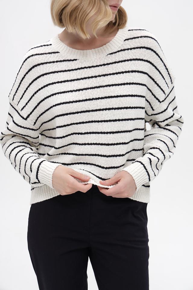 Основной цвет пуловера – белый, дополненный широкими чёрными полосами. Такое сочетание делает его универсальным и легко сочетаемым с различными элементами гардероба. Изделие выполнено из высококачественного 100% хлопка, что обеспечивает мягкость, приятные тактильные ощущения и комфорт при носке.