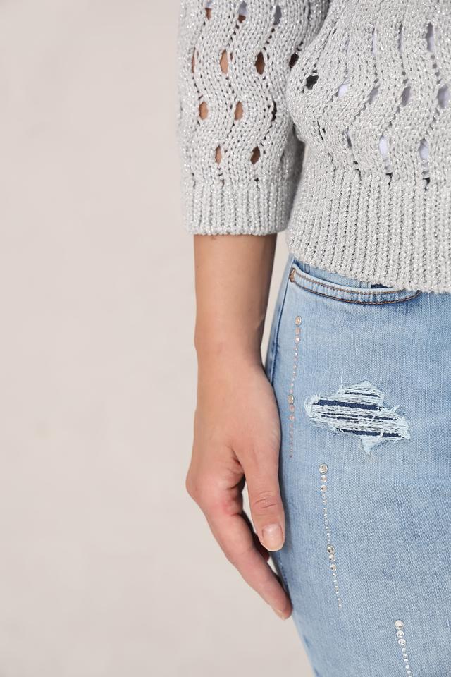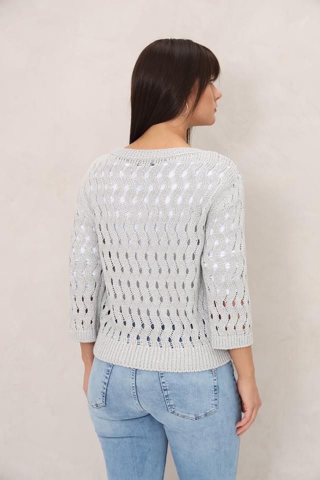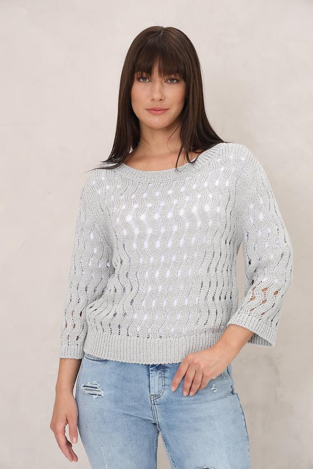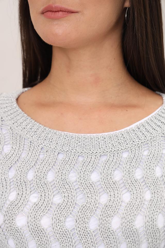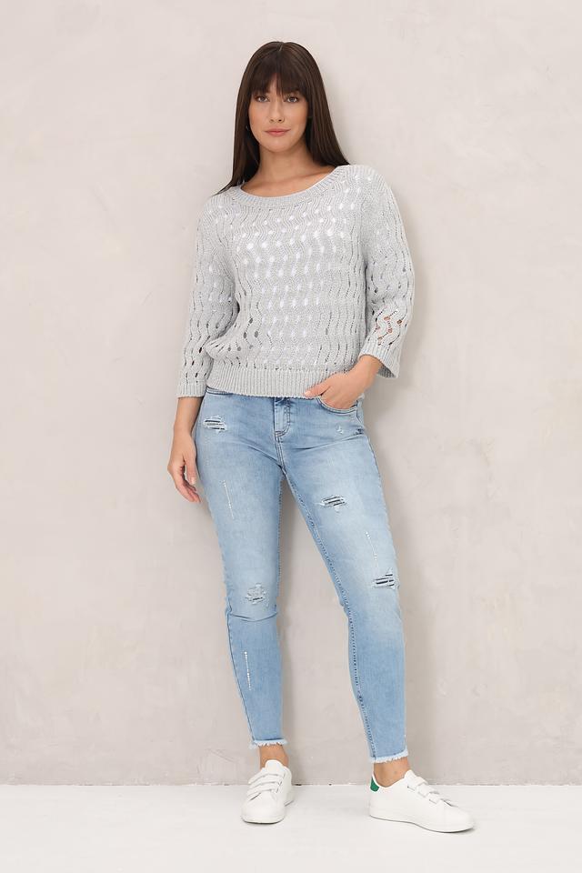 Серый пуловер Monari с оригинальной ажурной вязкой станет стильным дополнением к вашему гардеробу. Модель с рукавом 3/4 и округлым вырезом подчеркнет женственность и легкость образа. Состав: вискоза 68%, метализ.нить 32%