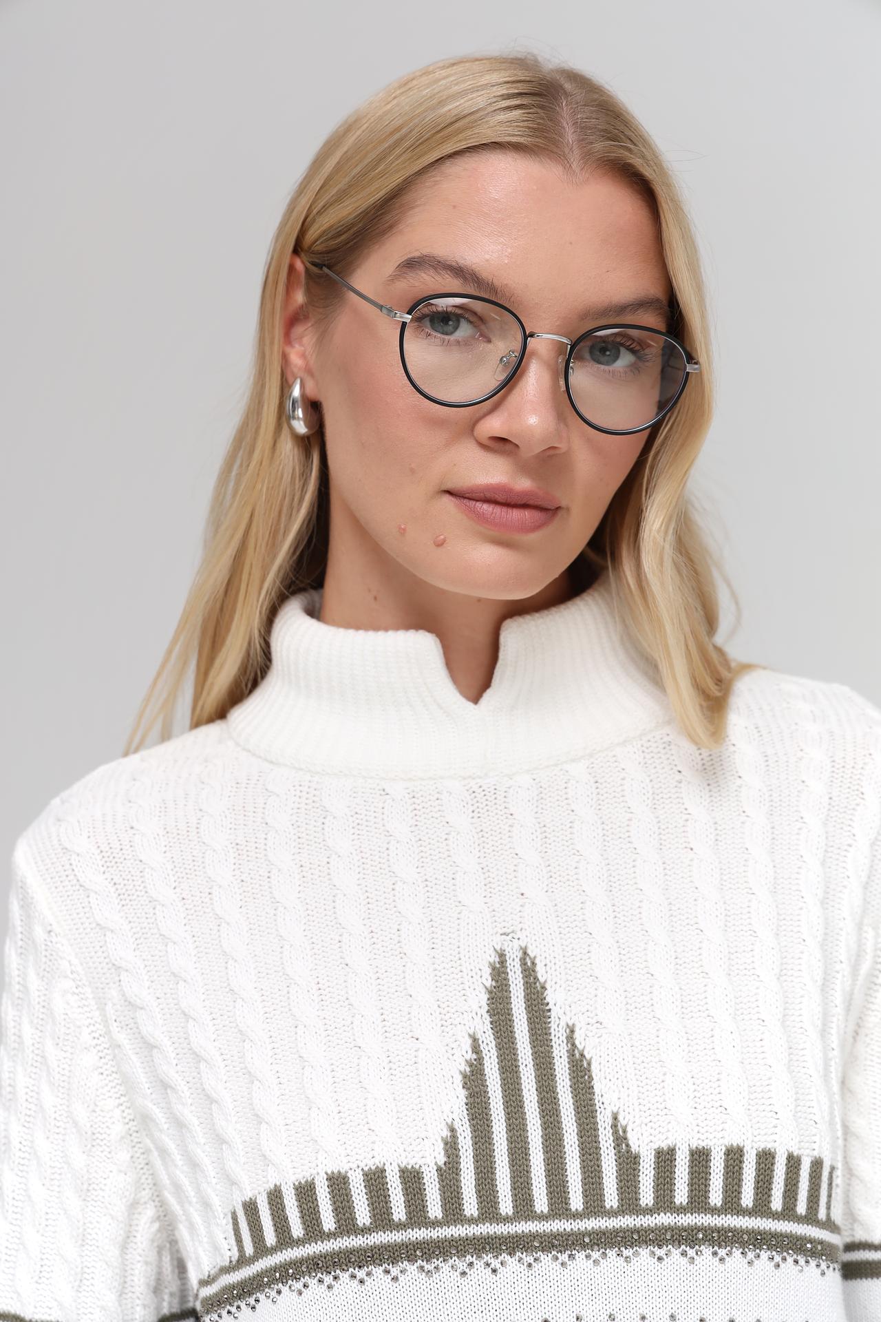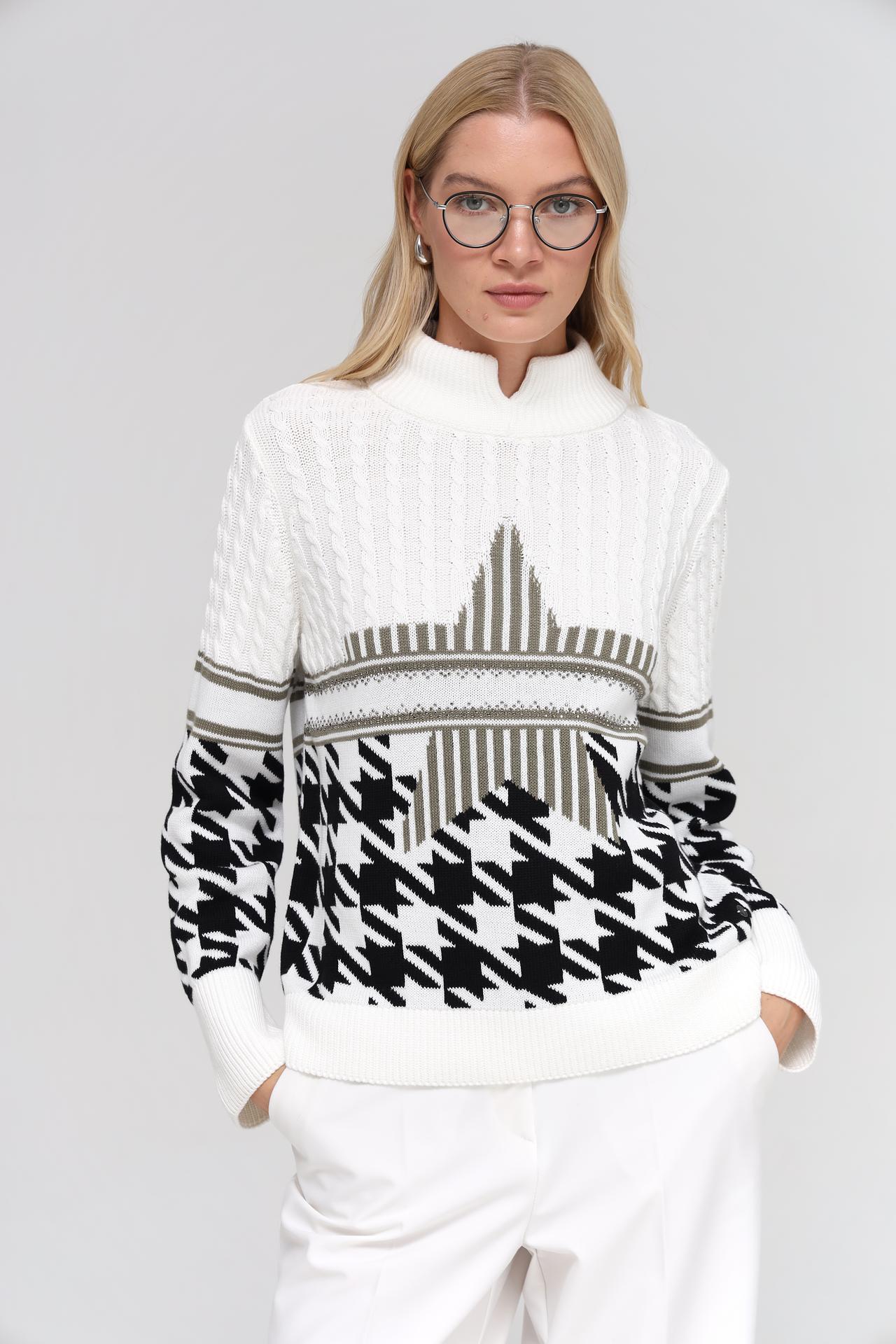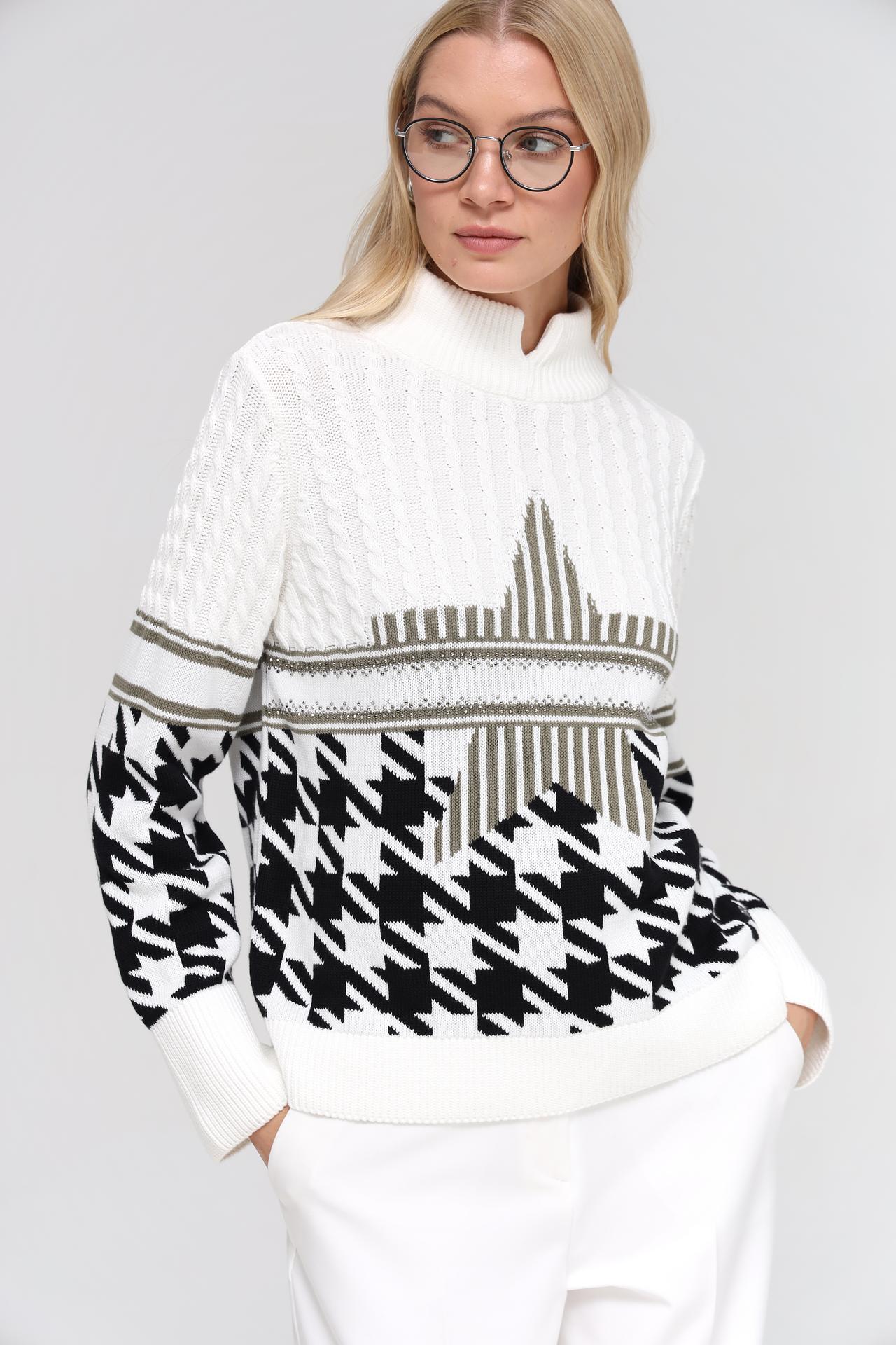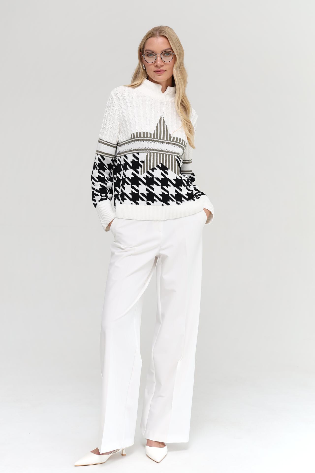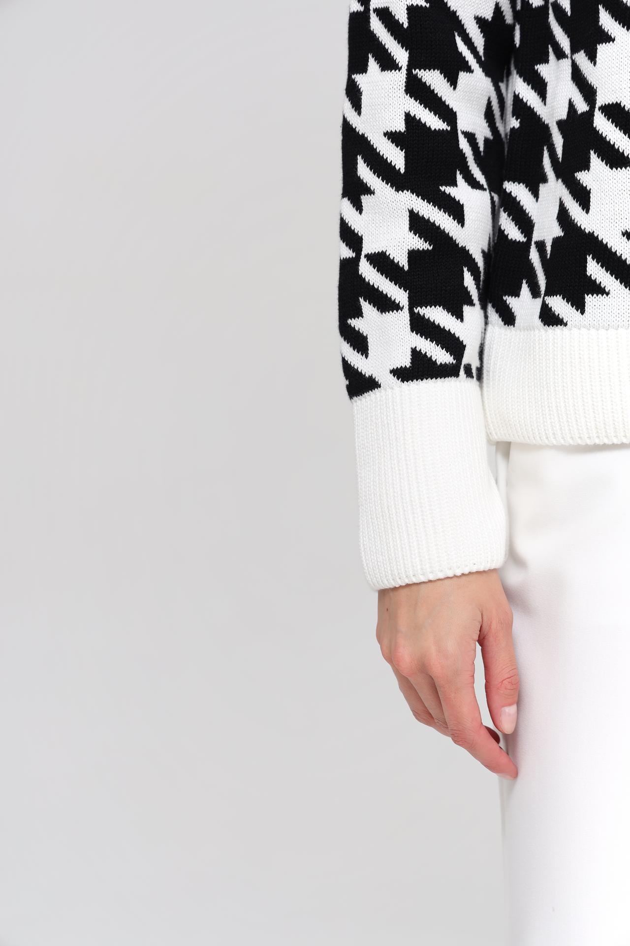 - Оригинальный дизайн: Уникальное сочетание вязаного узора и принта "гусиная лапка" делает этот пуловер неповторимым.