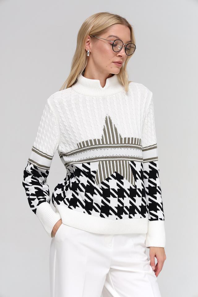 Белый пуловер Monari с оригинальным дизайном в клетку "гусиная лапка" и геометрическим узором станет стильным дополнением к вашему гардеробу. Изготовлен из 100% хлопка, обеспечивая комфорт и удобство в носке. Состав: хлопок 100%