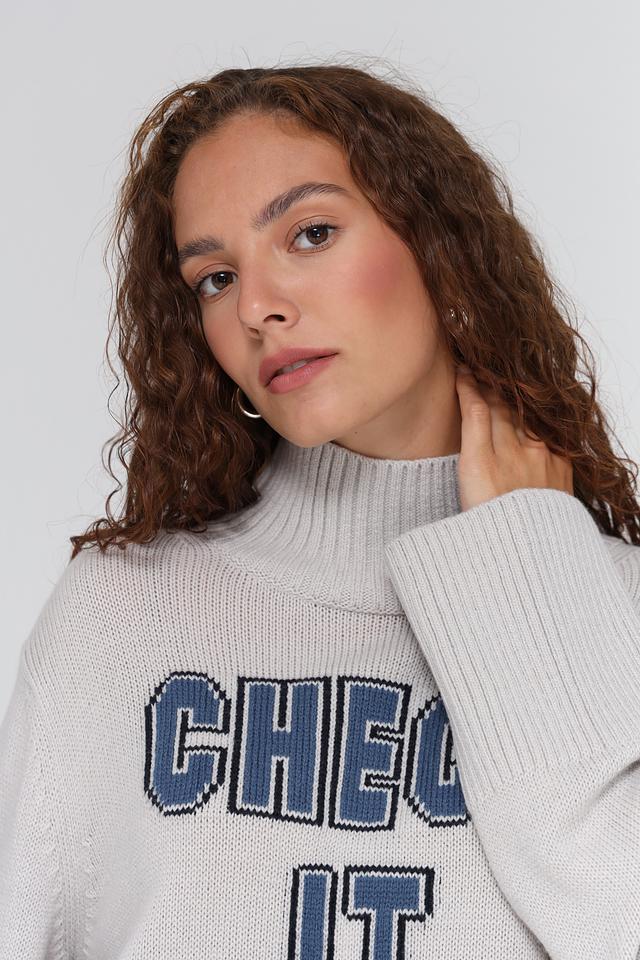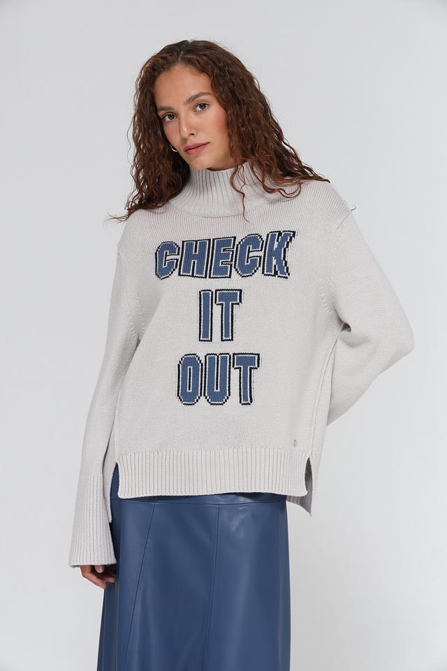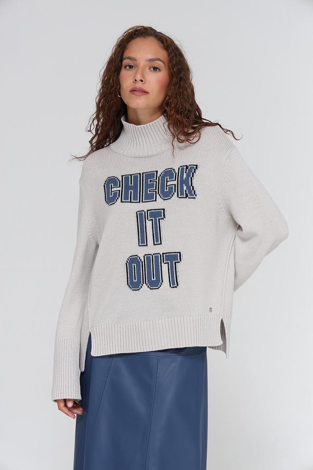 Серый пуловер Monari с яркой надписью "CHECK IT OUT" станет стильным дополнением к вашему гардеробу. Модель выполнена из мягкой пряжи с добавлением шерсти, имеет удобный высокий воротник и свободный крой. Состав: шерсть 50%, полиакрил 50%