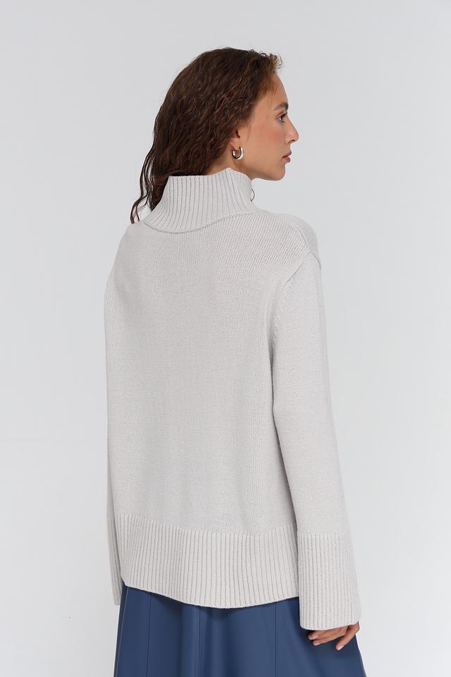 Пуловер имеет высокий воротник-стойку, который добавляет образу элегантности. Рукава объёмные, слегка расклешенные к низу. Изделие выполнено из сочетания шерсти и полиакрила, что обеспечивает мягкость, тепло и простоту в уходе.