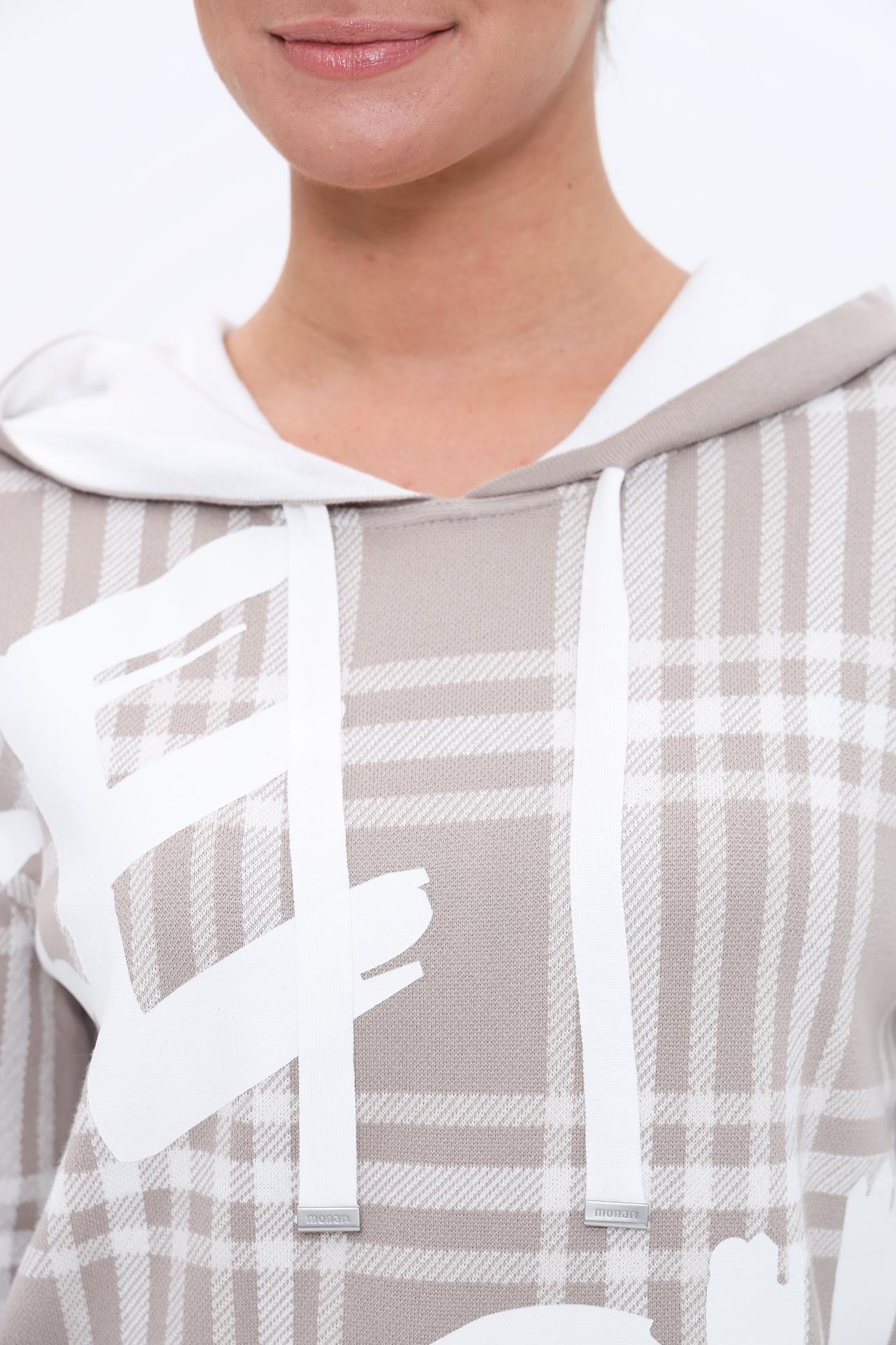 Пуловер Monari из 100% хлопка – это идеальный выбор для создания стильного и комфортного повседневного образа. Модель выполнена в нежном бежевом цвете с классическим клетчатым узором, который придает изделию особую изысканность. Контрастная надпись "BE YOU" на груди и удобный капюшон подчеркивают современный дизайн и индивидуальность.