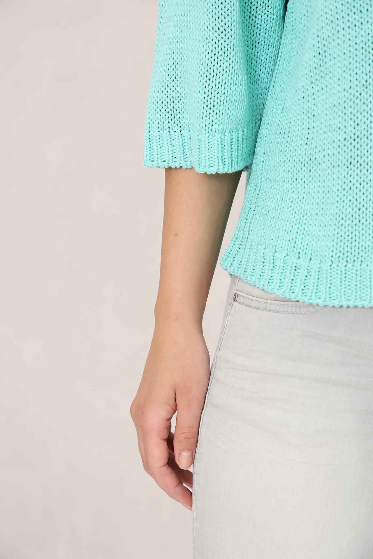 Модель выполнена в актуальном бирюзовом цвете, который освежит ваш гардероб и добавит ярких красок в повседневную жизнь. Пуловер прекрасно сочетается с джинсами, брюками или юбкой, создавая как повседневный, так и нарядный лук.