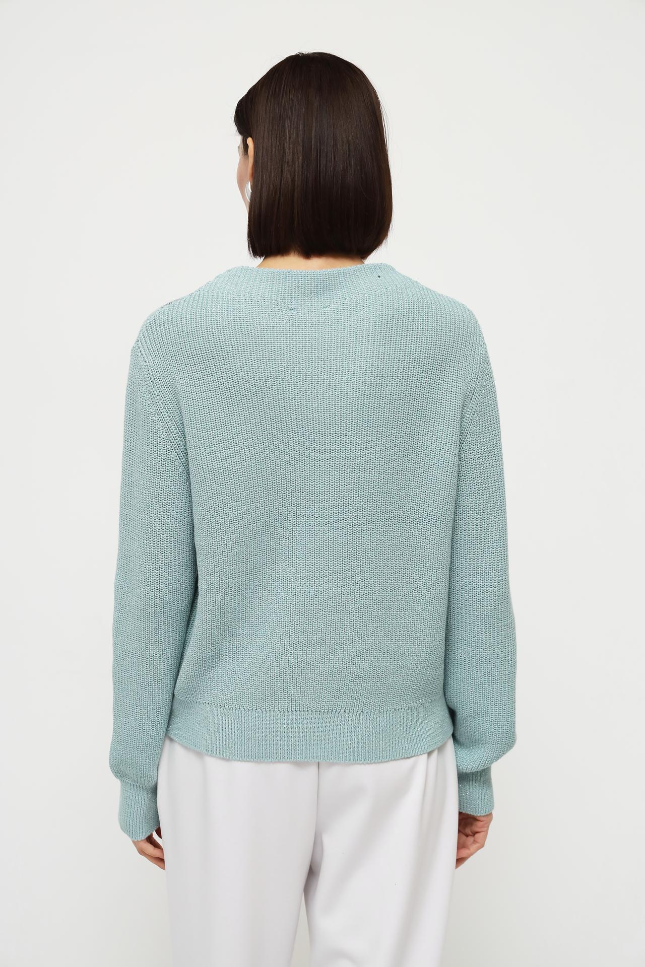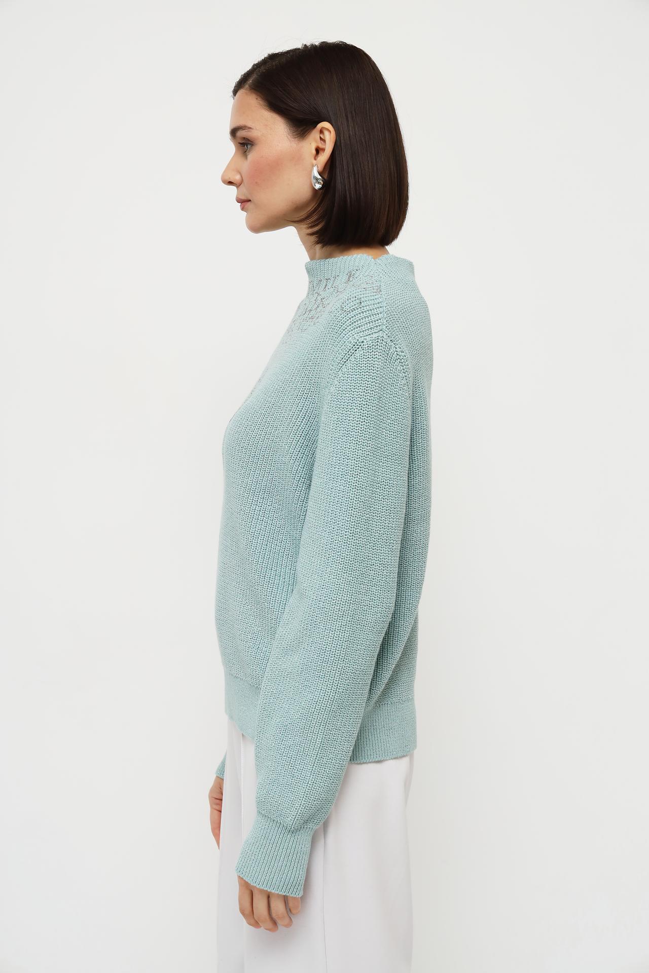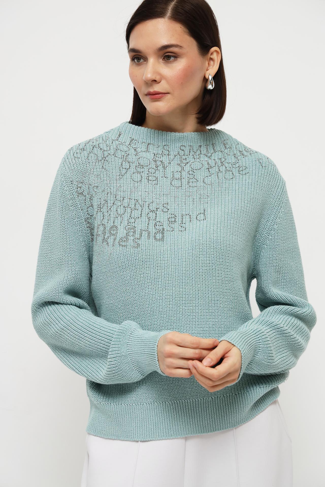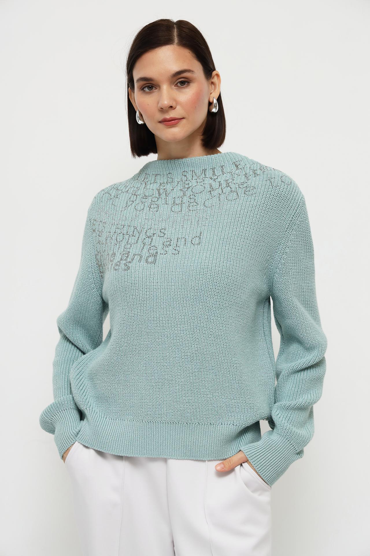 Оригинальный дизайн пуловера украшен изысканной вышивкой в виде хаотично расположенных букв на плечевой части. Бирюзовый цвет пуловера придаёт образу лёгкость и свежесть.