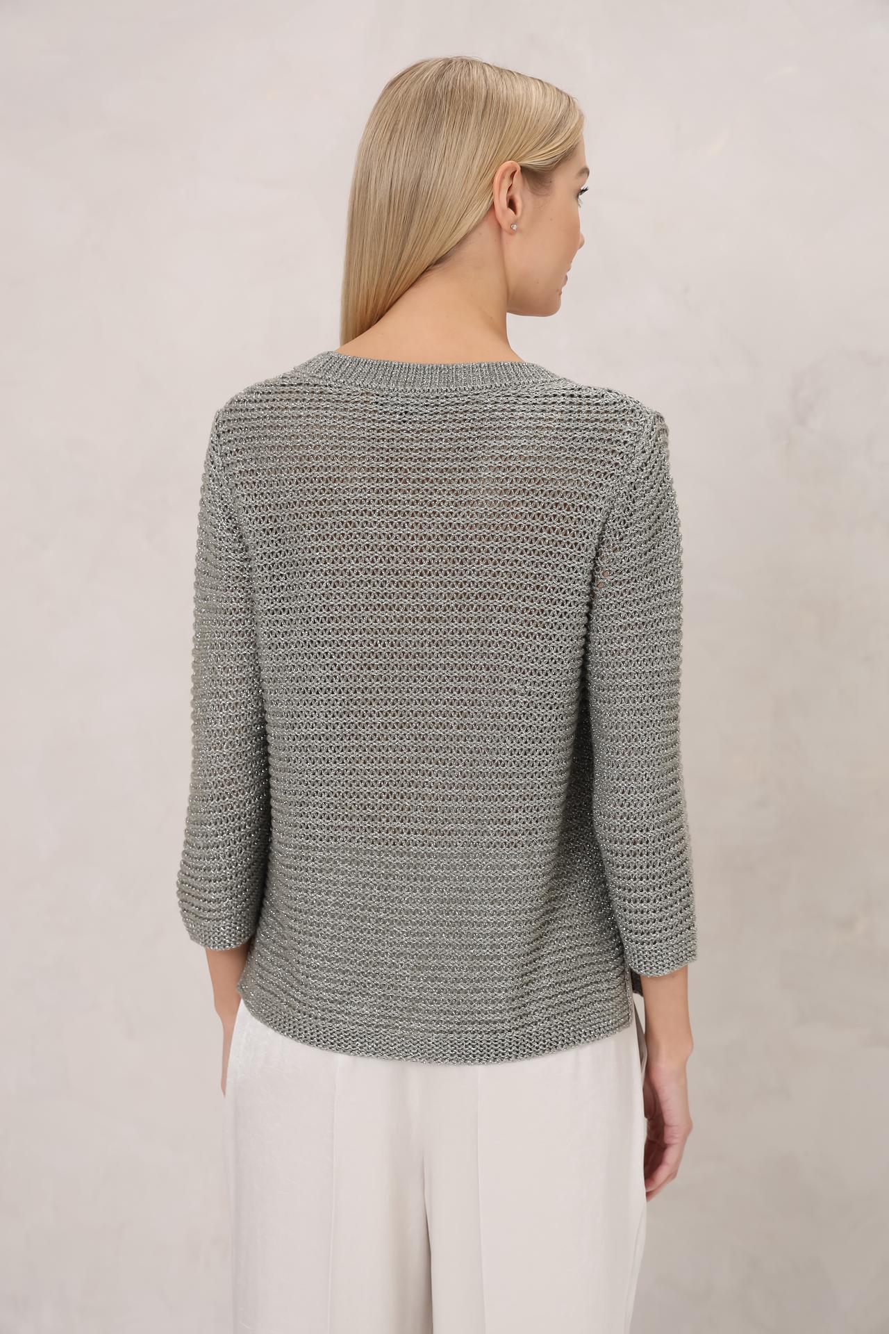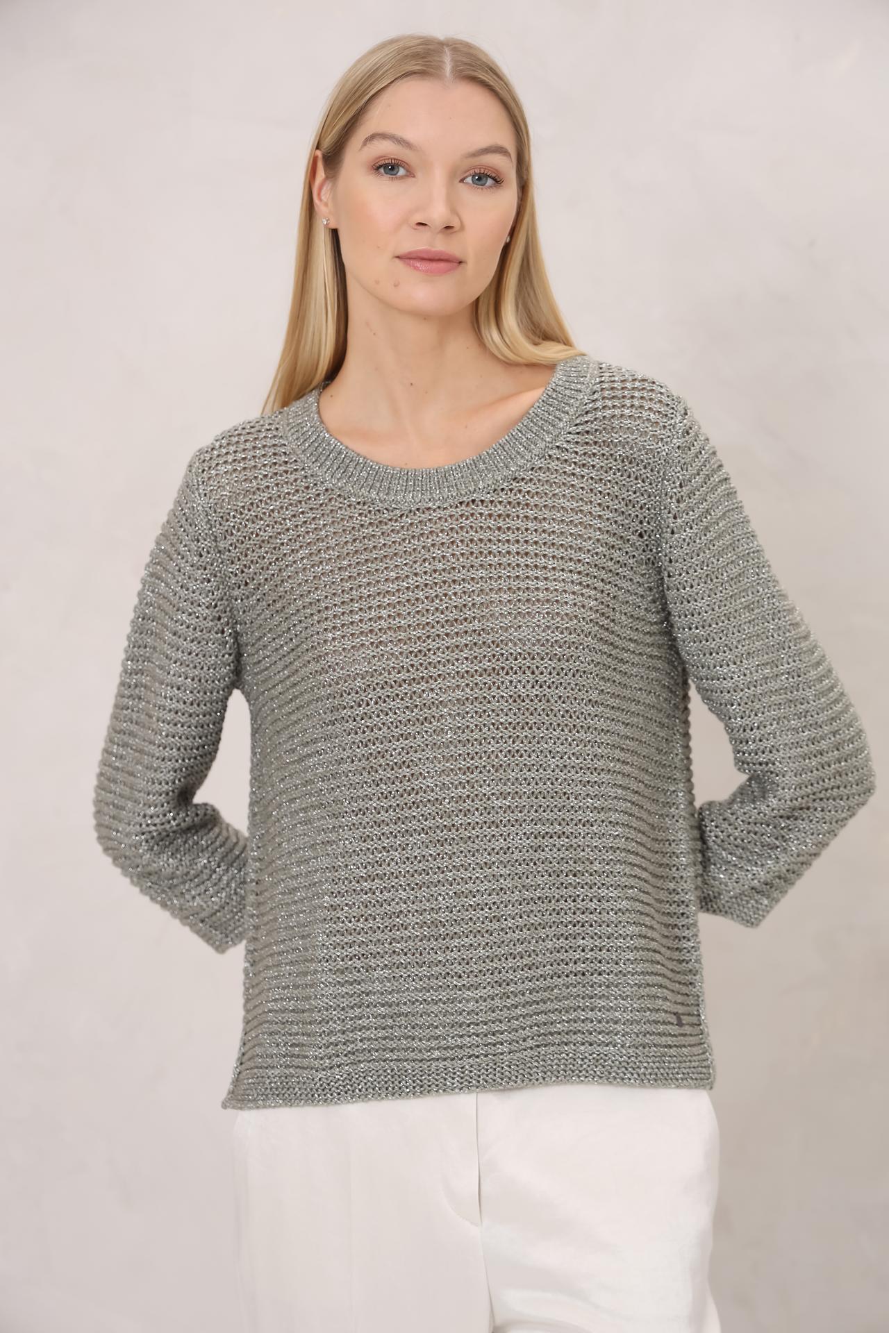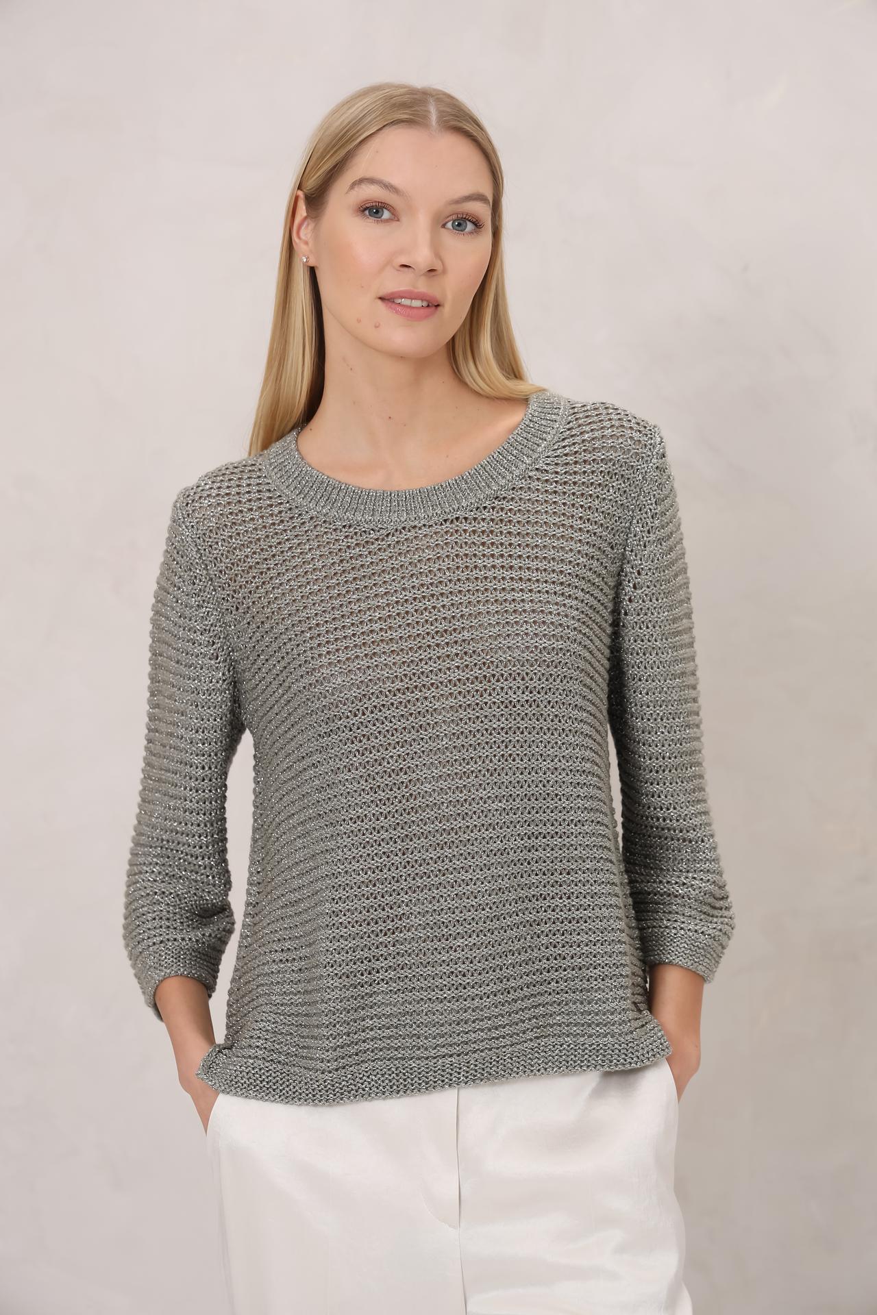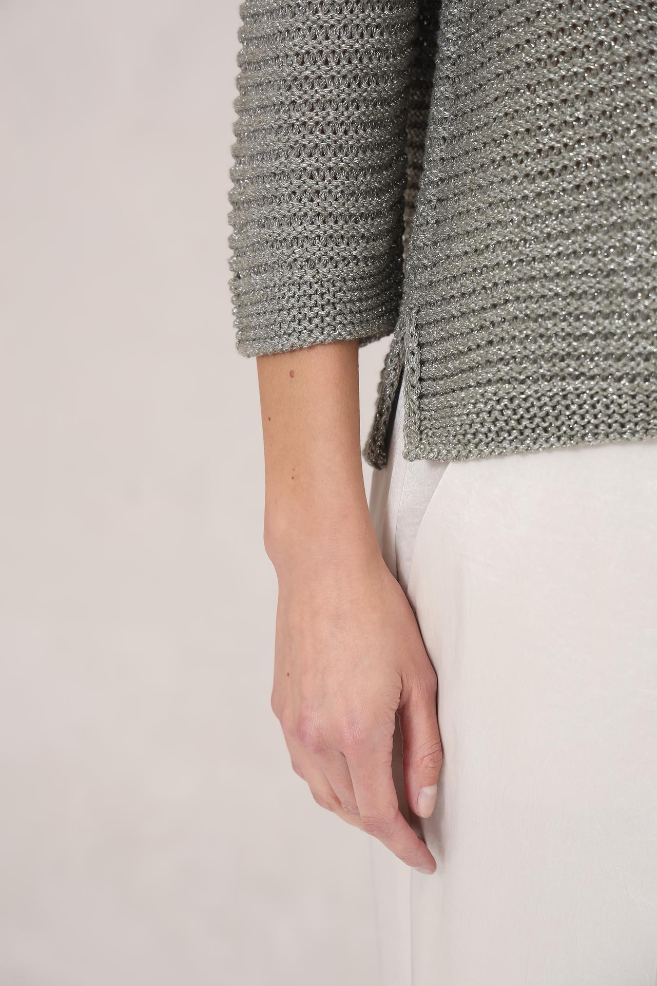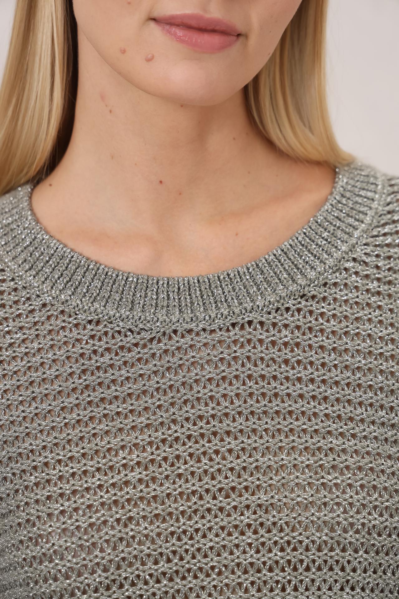 Состав ткани: 68% вискоза, 32% металлизированная нить, что обеспечивает комфорт и роскошный внешний вид. Пуловер прекрасно подойдет для прохладной погоды, создавая ощущение уюта и тепла.