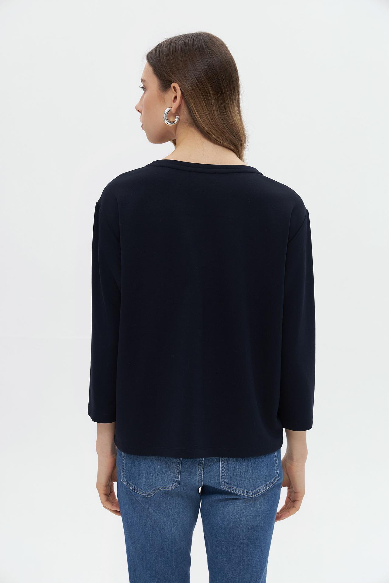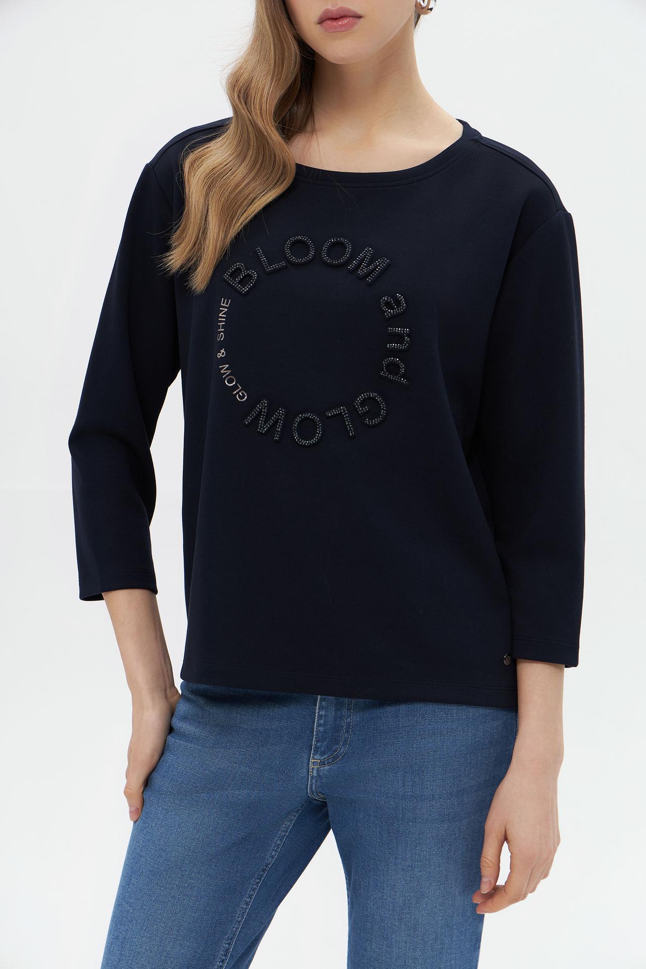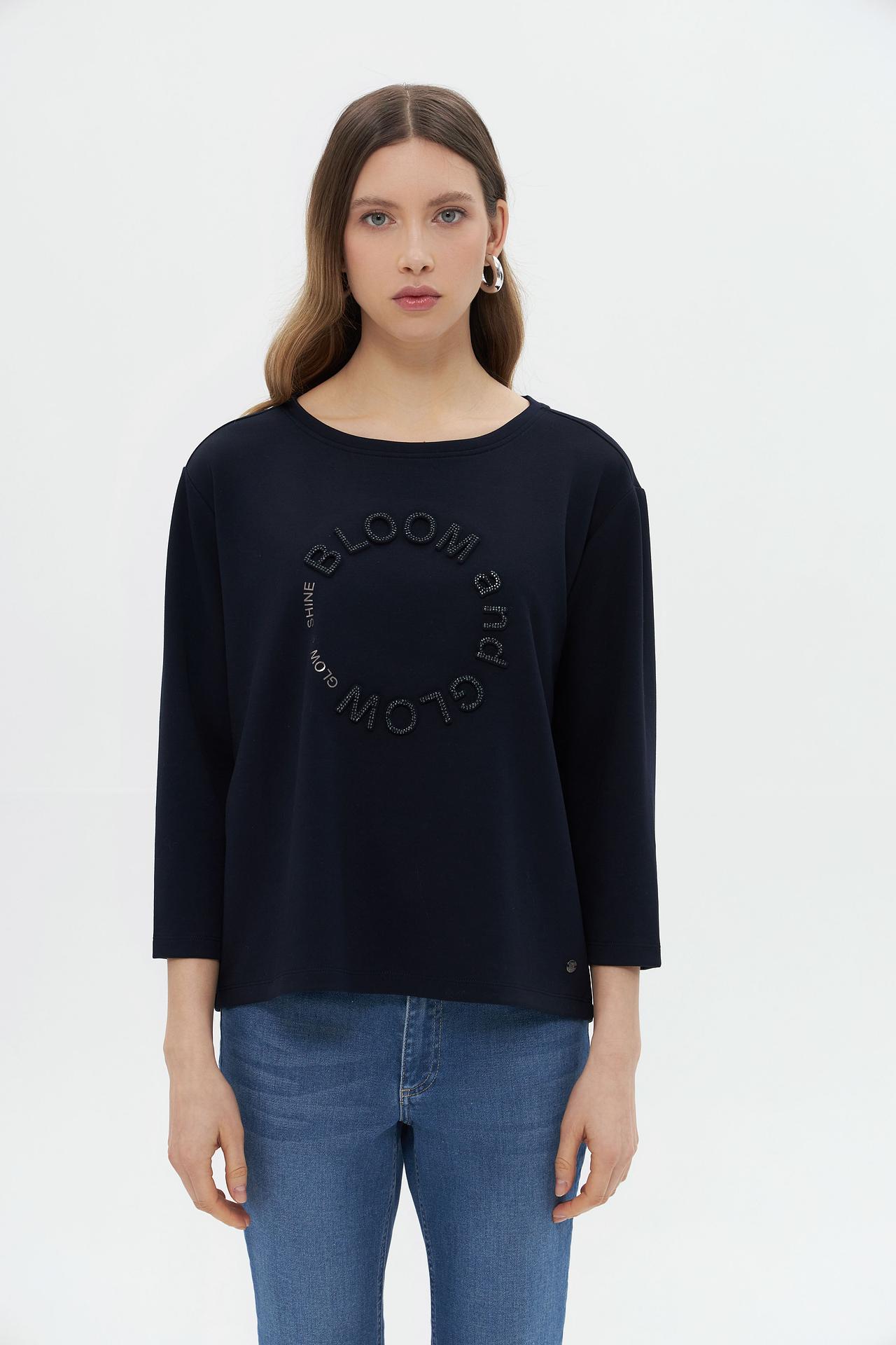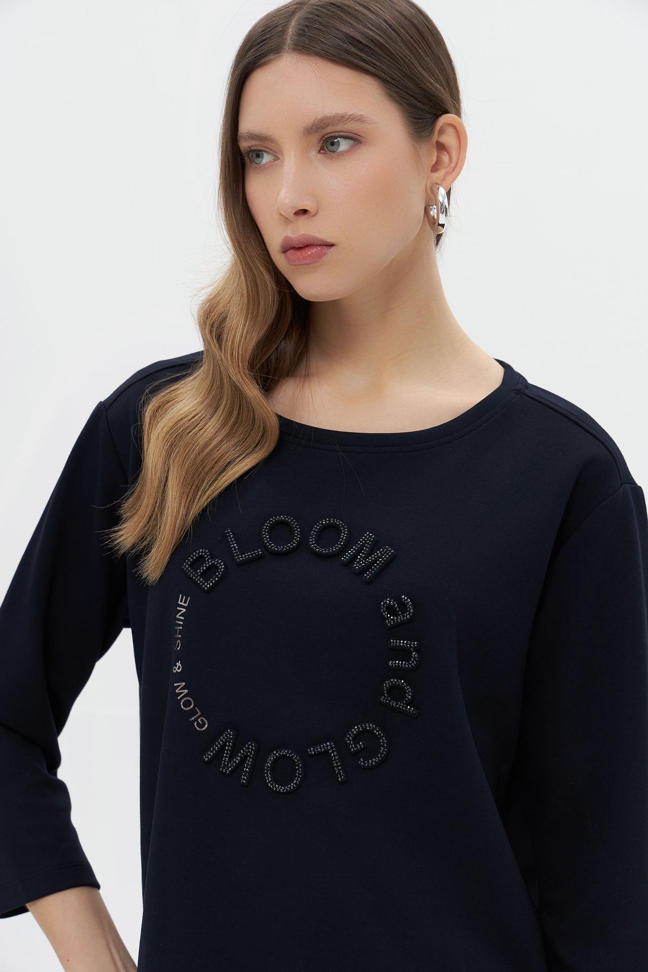 Выполненный в универсальном тёмно-синем цвете, пуловер легко сочетается с различными элементами гардероба. Оригинальный декор в виде круглой аппликации с надписью, выполненной бисером, добавляет изделию изюминку и делает его неповторимым.